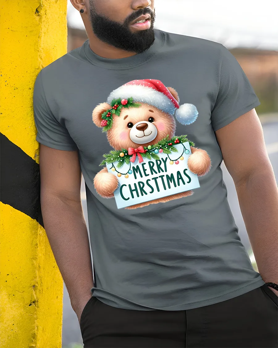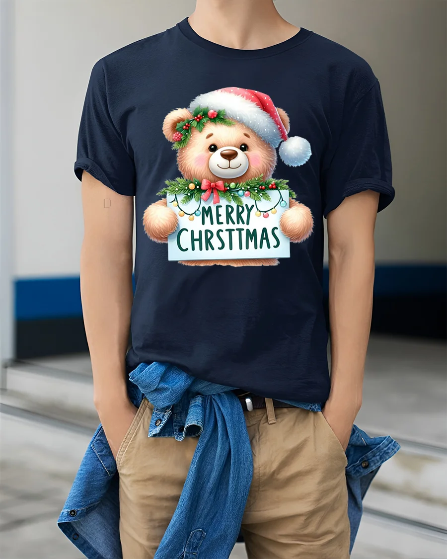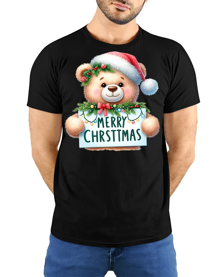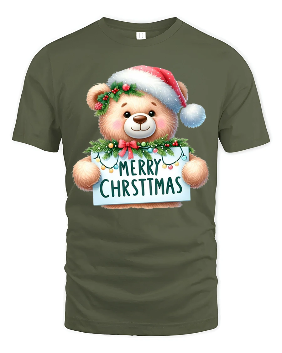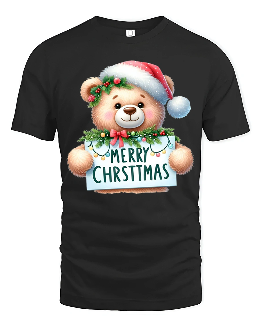 This Cute Christmas Bear Holding Sign Tee Merry Holiday Graphic Tshirt brings heartwarming seasonal charm to your festive wardrobe. Featuring an adorable bear wearing a classic Santa hat and holding a “Merry Christmas” sign decorated with garland and string lights, this design captures the joyful spirit of the holidays. The soft, friendly expression and bright details make it perfect for both kids and adults who love sweet and cheerful Christmas artwork.