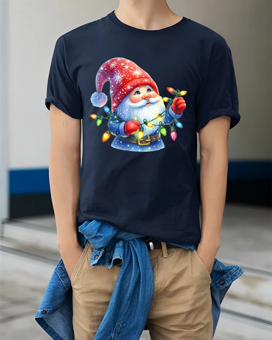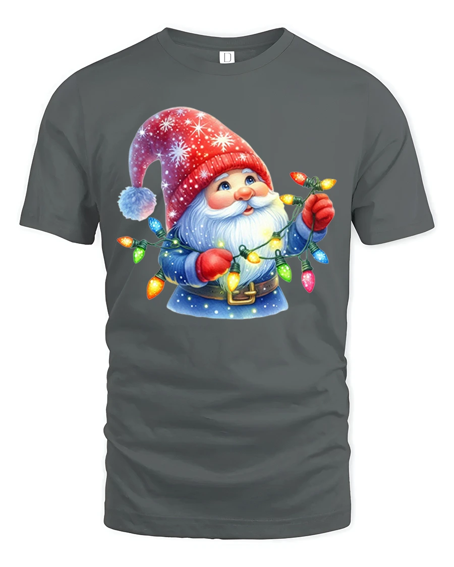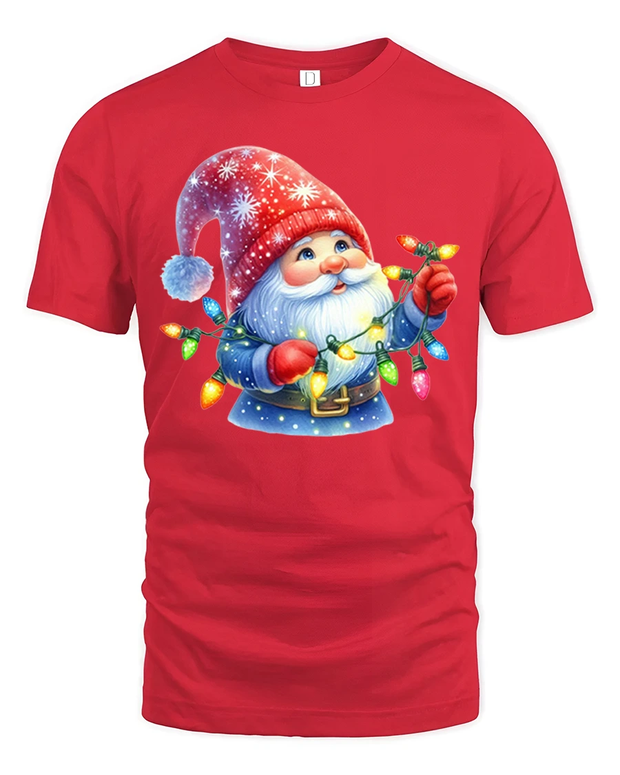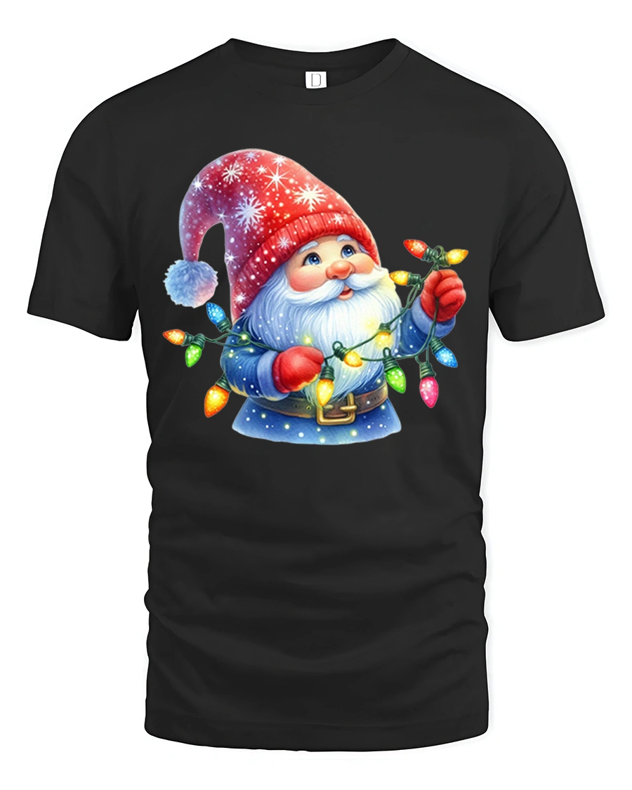 This Cute Christmas Gnome Tee Holding Colorful Holiday Lights Tshirt brings the magic of the holiday season to life with a charming and festive design. Featuring an adorable gnome in a snowflake-covered red hat, glowing beard, and bright multicolored Christmas lights, this tee captures the warmth and joy of winter celebrations. The cheerful expression and playful holiday style make it perfect for adding a touch of whimsy to your seasonal wardrobe.