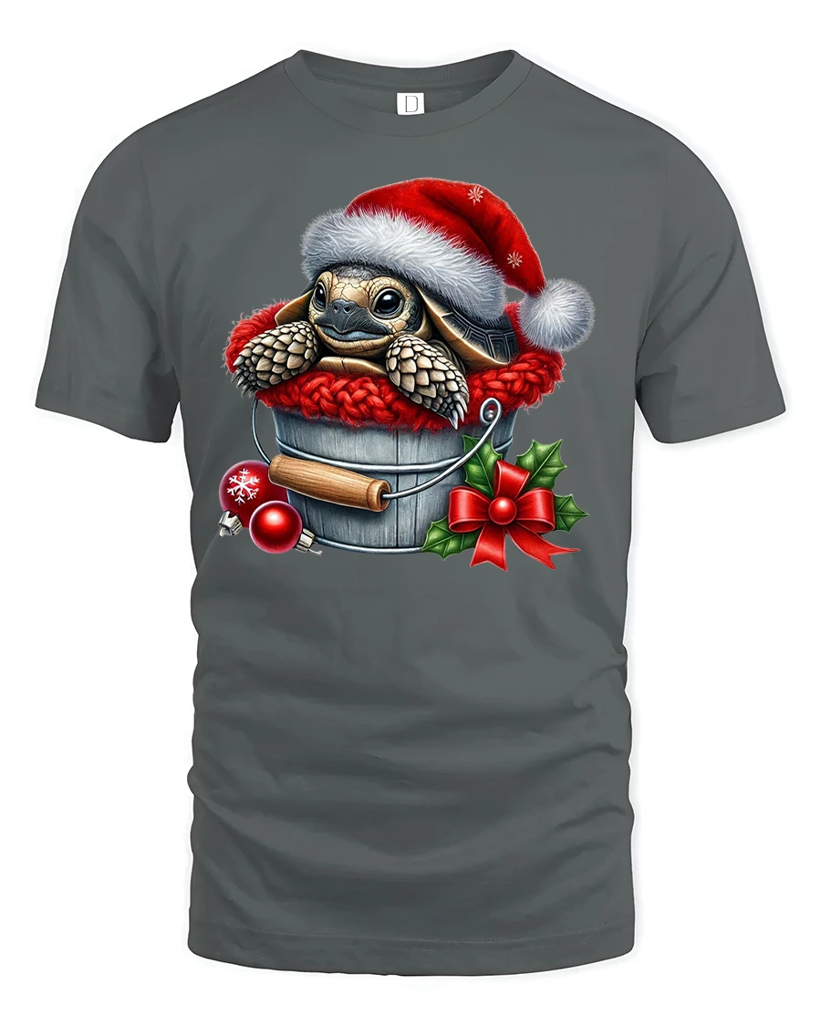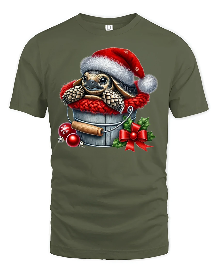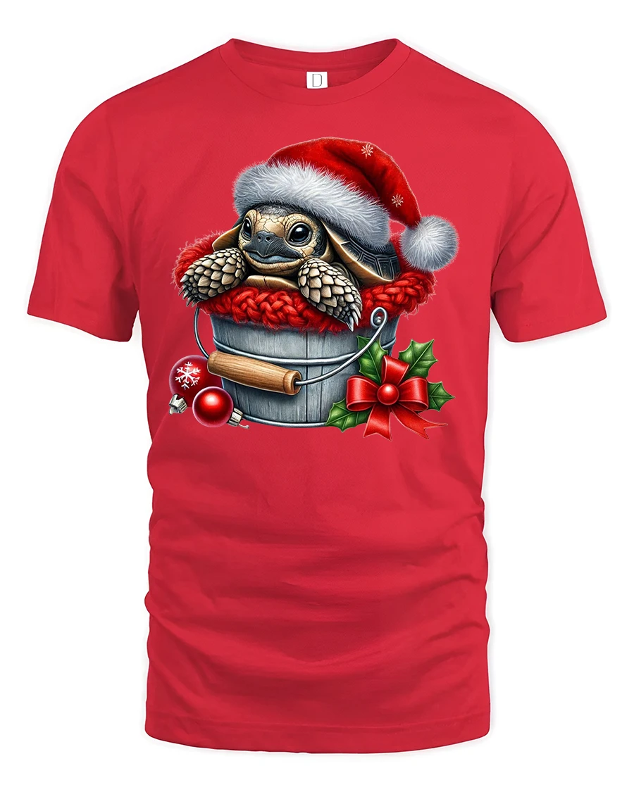 This Cute Christmas Turtle in Santa Hat Graphic Tee Holiday Tshirt brings cheerful charm to the season with an adorable design that’s sure to make anyone smile. Featuring a cozy turtle peeking out of a festive bucket, wrapped in soft red knit and topped with a fluffy Santa hat, this tee captures the playful side of Christmas. Bright ornaments and holiday greenery complete the artwork, making it a fun and heartwarming option for the winter season.