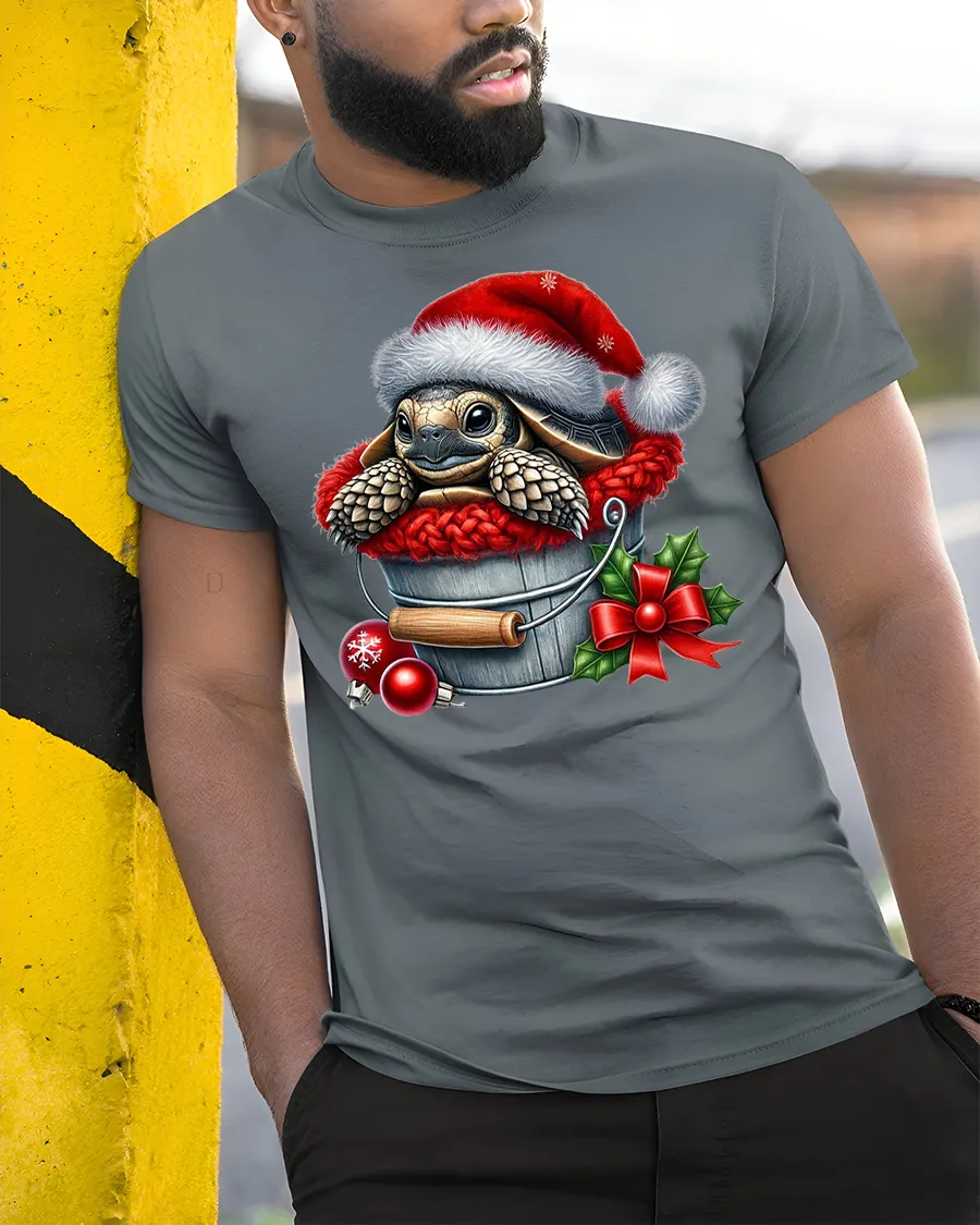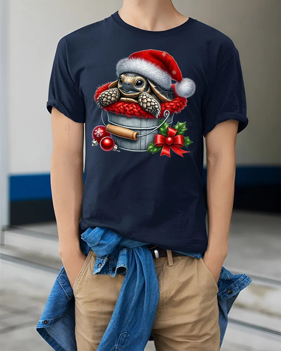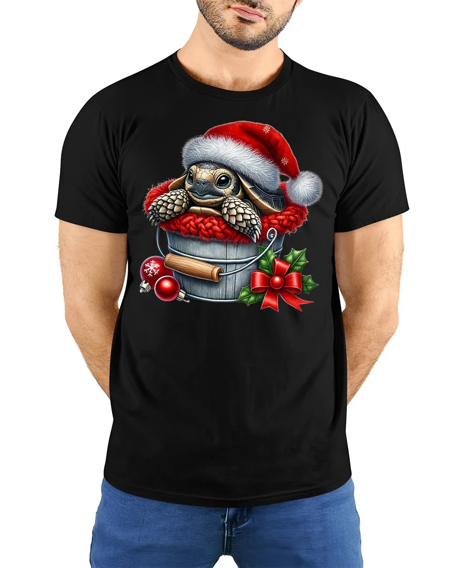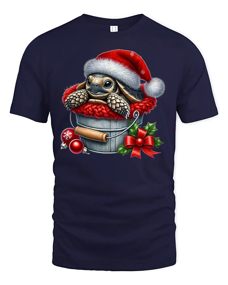 This Cute Christmas Turtle in Santa Hat Graphic Tee Holiday Tshirt brings cheerful charm to the season with an adorable design that’s sure to make anyone smile. Featuring a cozy turtle peeking out of a festive bucket, wrapped in soft red knit and topped with a fluffy Santa hat, this tee captures the playful side of Christmas. Bright ornaments and holiday greenery complete the artwork, making it a fun and heartwarming option for the winter season.