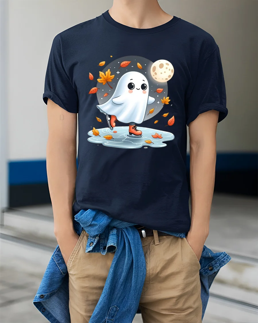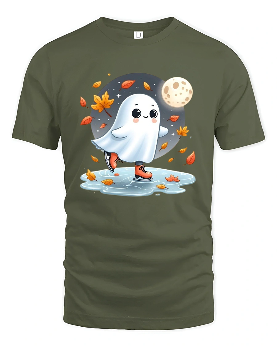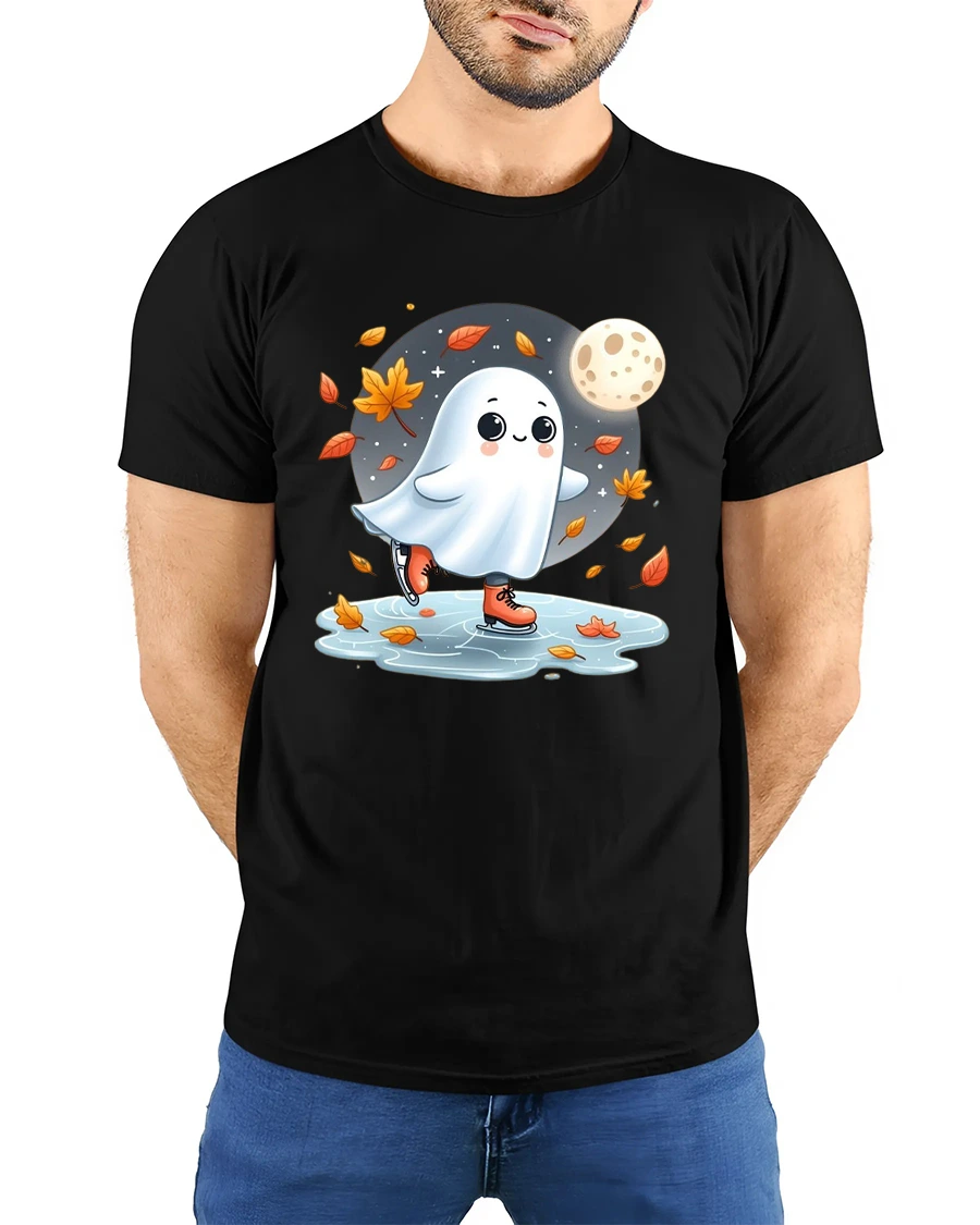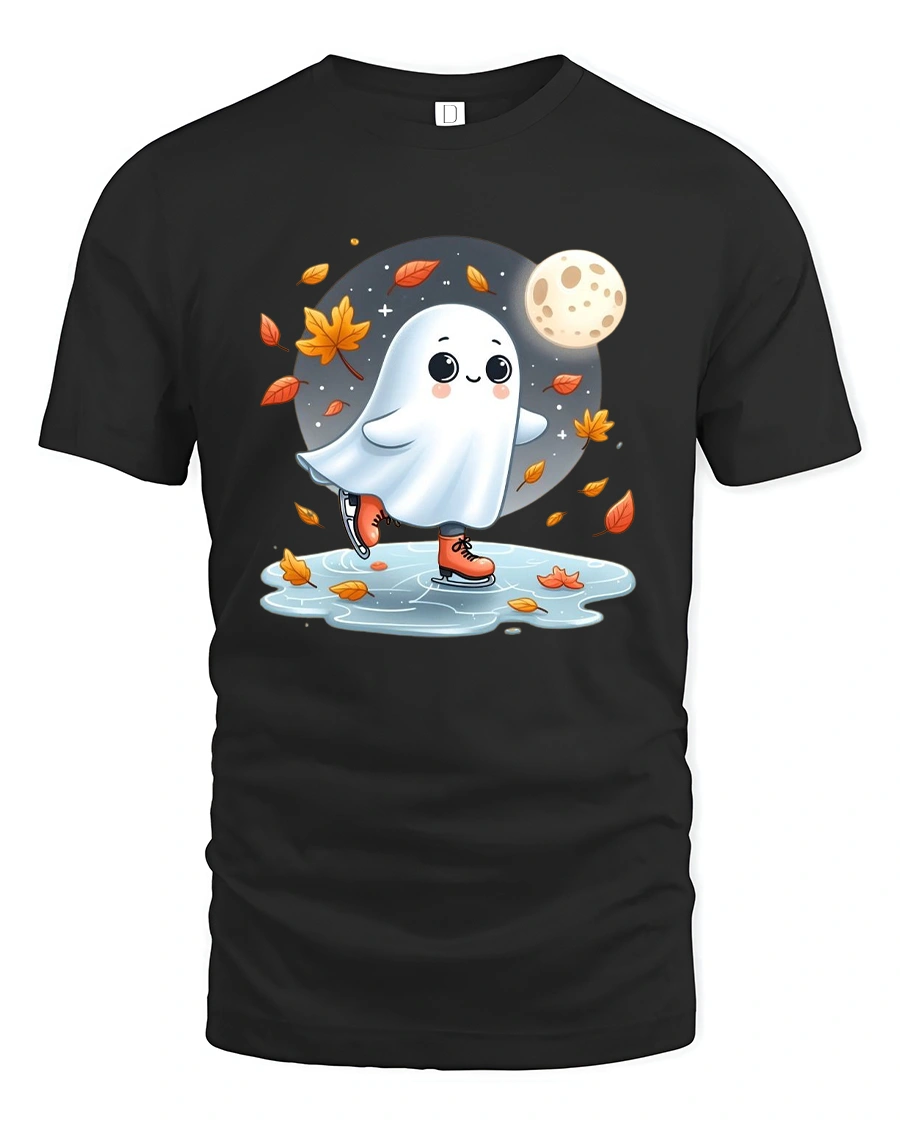 Featuring an adorable ghost gliding on ice under a full moon surrounded by falling leaves, this tee captures the magic of Halloween and the beauty of fall in one sweet design.