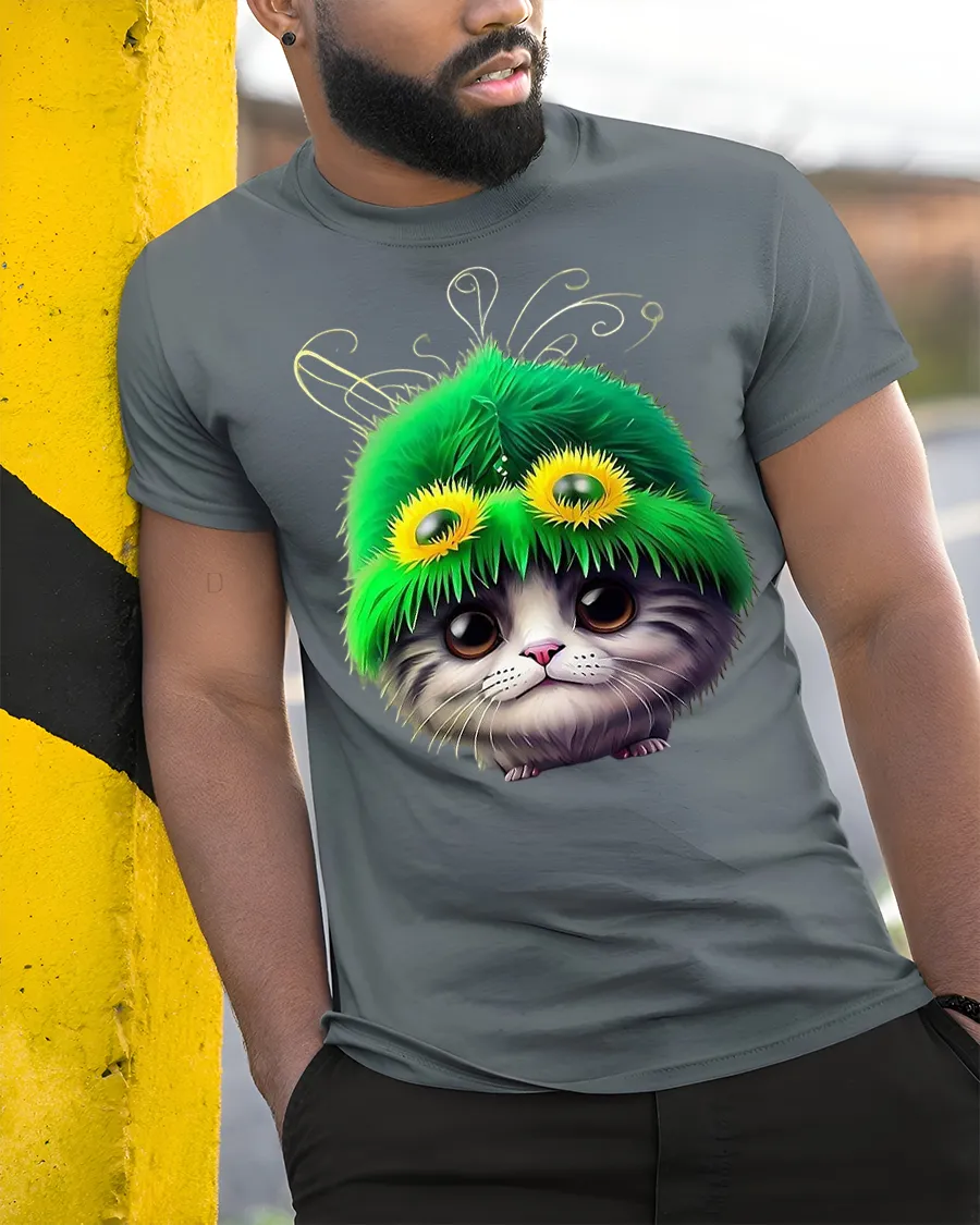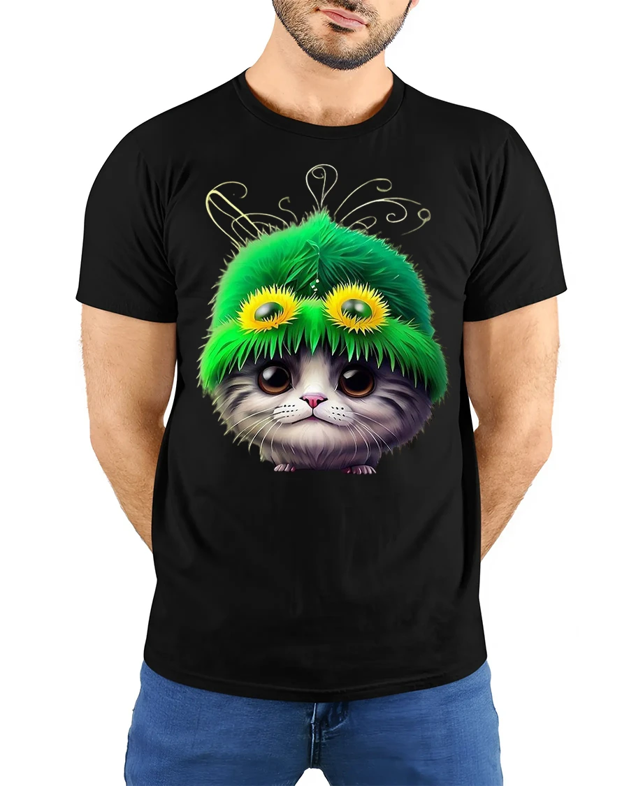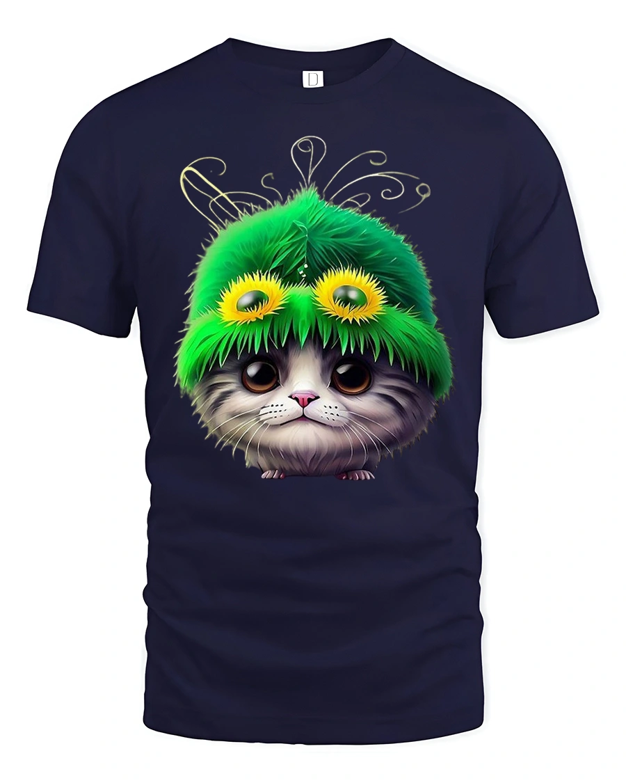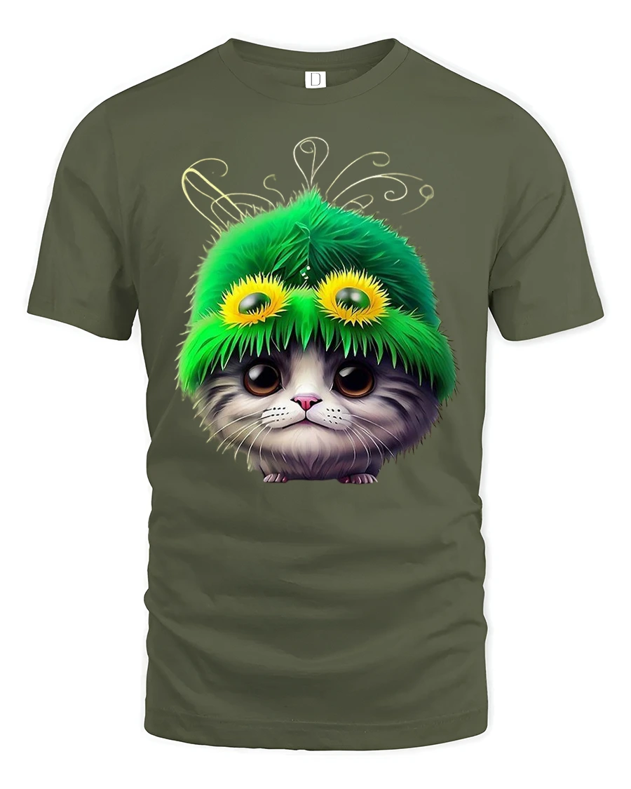 Cute Green Fuzzy Bug Cat Cartoon Art Graphic Tshirt brings together charm creativity and a touch of fantasy in one delightful design.