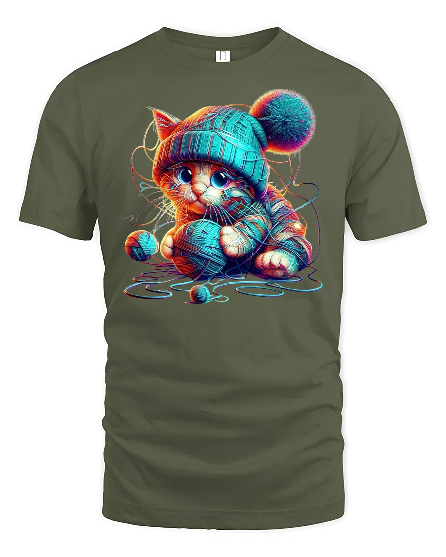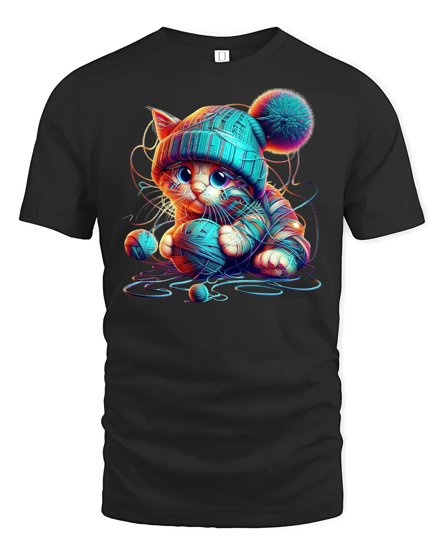 Add a playful and cozy vibe to your wardrobe with the Cute Knitted Cat with Yarn Ball Graphic T-Shirt, a design that blends cuteness and style effortlessly. Featuring an adorable kitten in a winter beanie, tangled up with yarn balls in glowing neon tones, this tee captures the fun and warmth of cozy moments. It’s the perfect choice for cat lovers and anyone who enjoys playful fashion with a unique artistic twist.