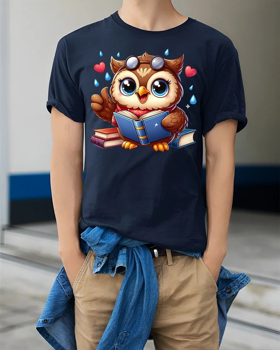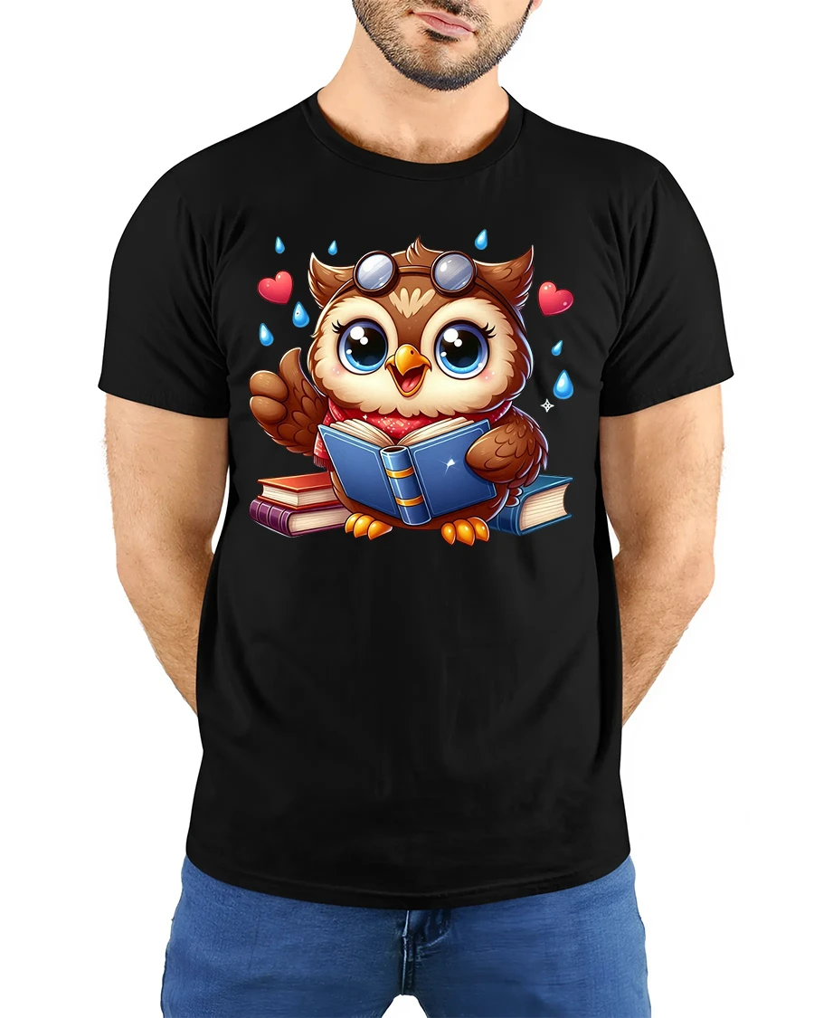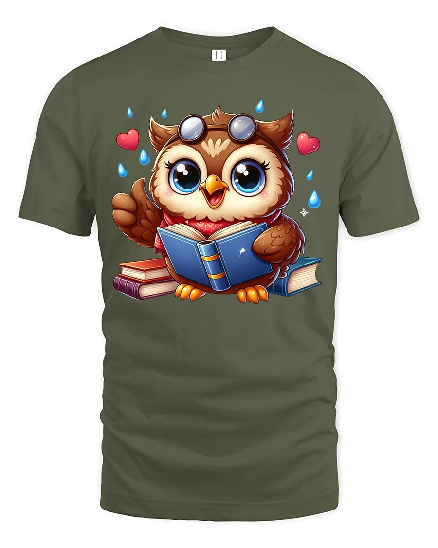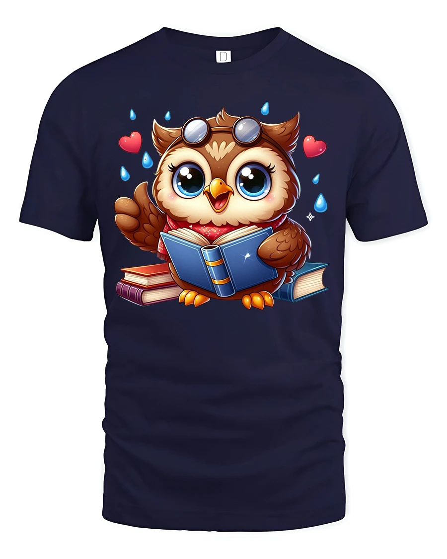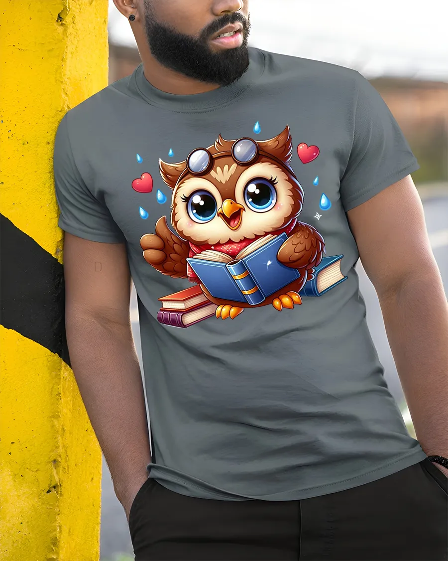The design features an adorable wide eyed owl happily reading books with tiny hearts and playful details surrounding it.