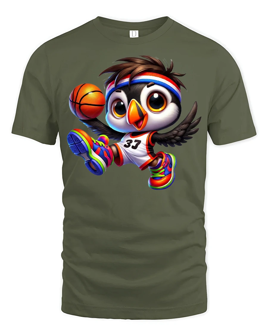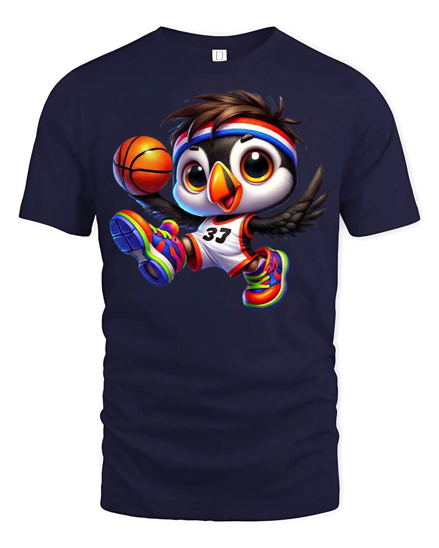 This fun design features an adorable penguin mid-dunk, rocking a colorful jersey and sneakers while showing off its athletic flair.