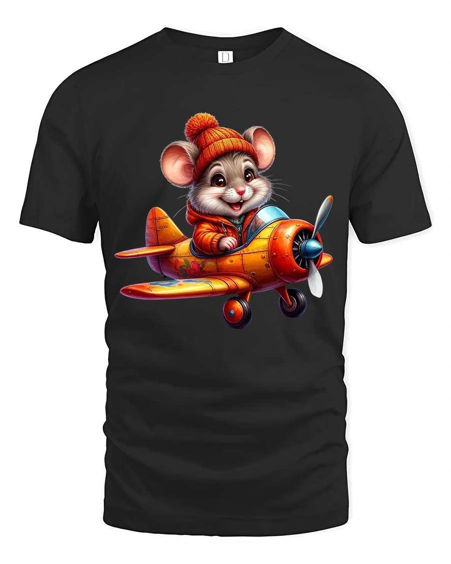 Cute Pilot Mouse Airplane Adventure Illustration Graphic Tshirt features a joyful cartoon mouse flying a colorful vintage style airplane.
