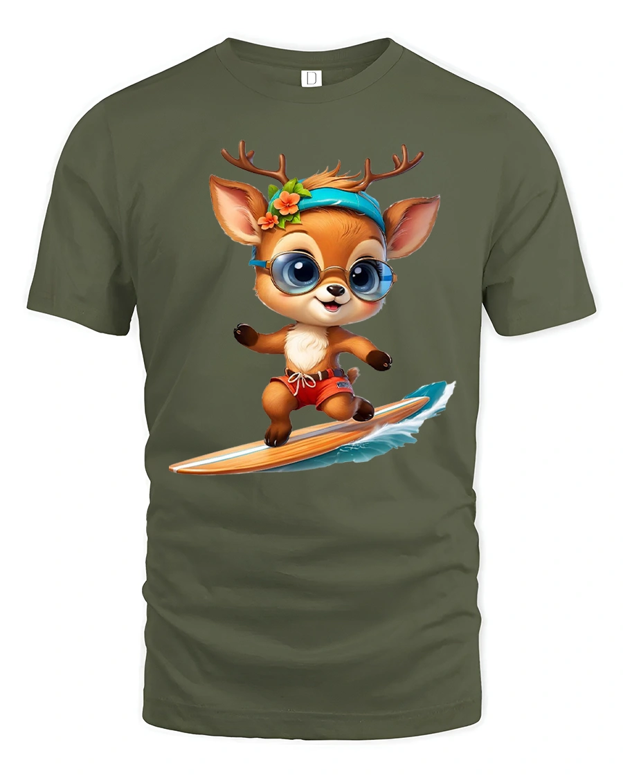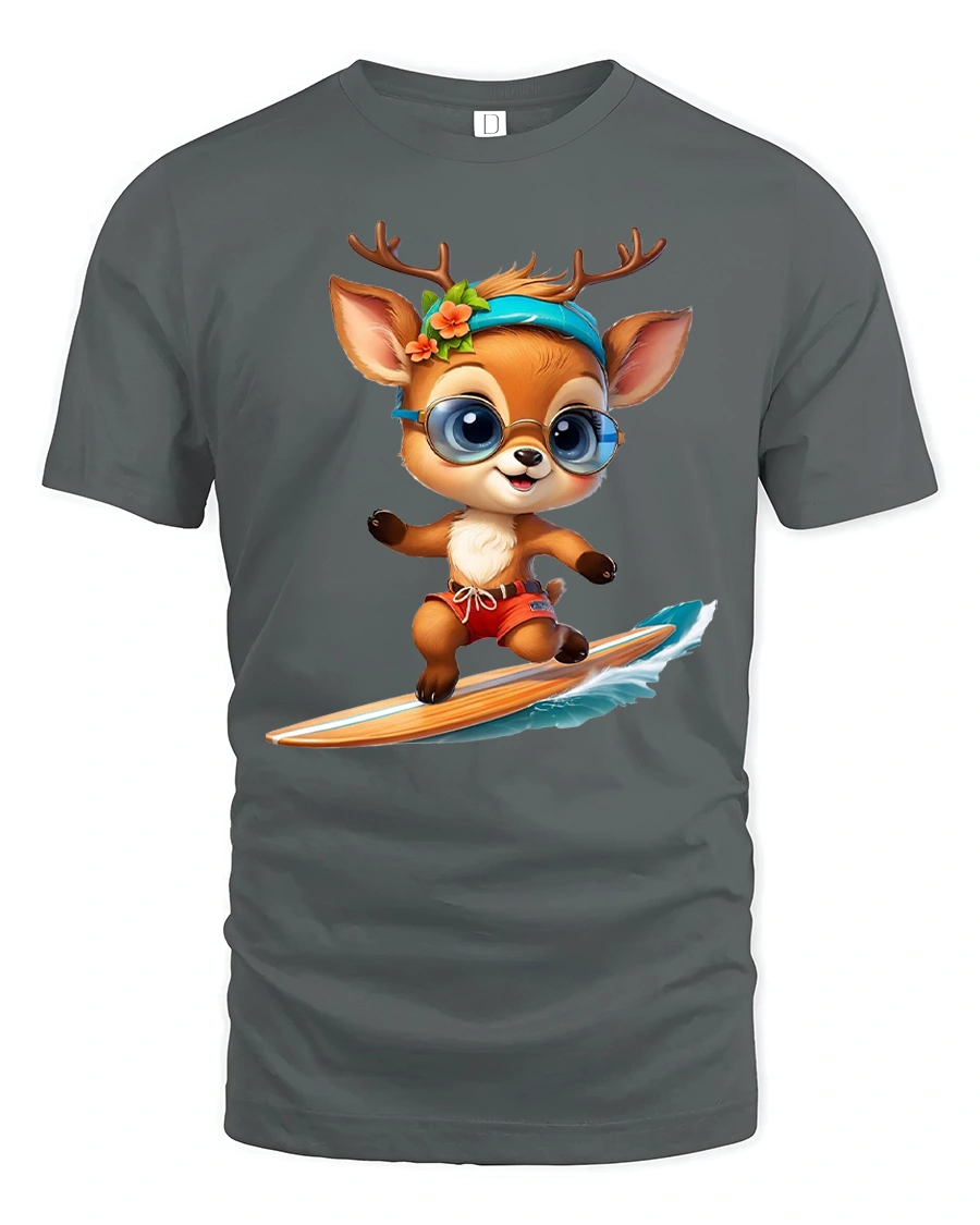 The Cute Surfing Deer Cartoon Tee With Playful Summer Adventure Vibes is perfect for those who love cute animals playful designs and fun summer style.
