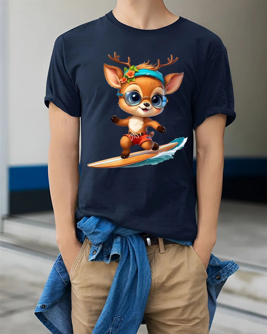 The Cute Surfing Deer Cartoon Tee With Playful Summer Adventure Vibes is made with soft breathable fabric that feels comfortable all day long.