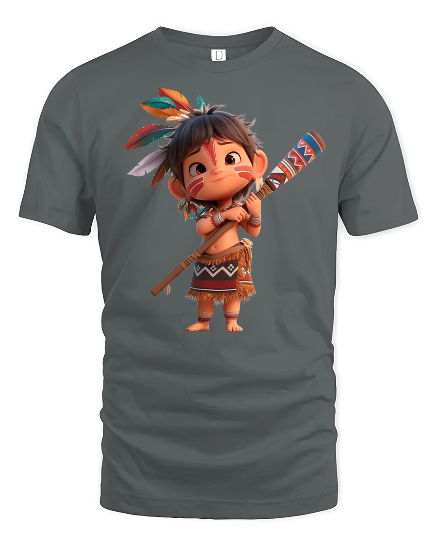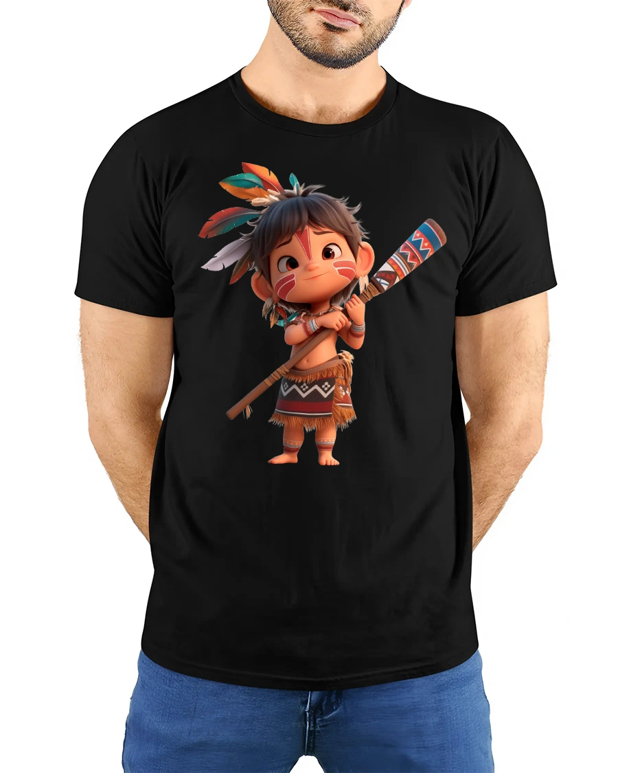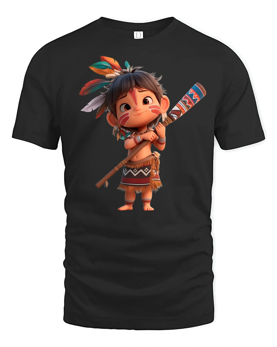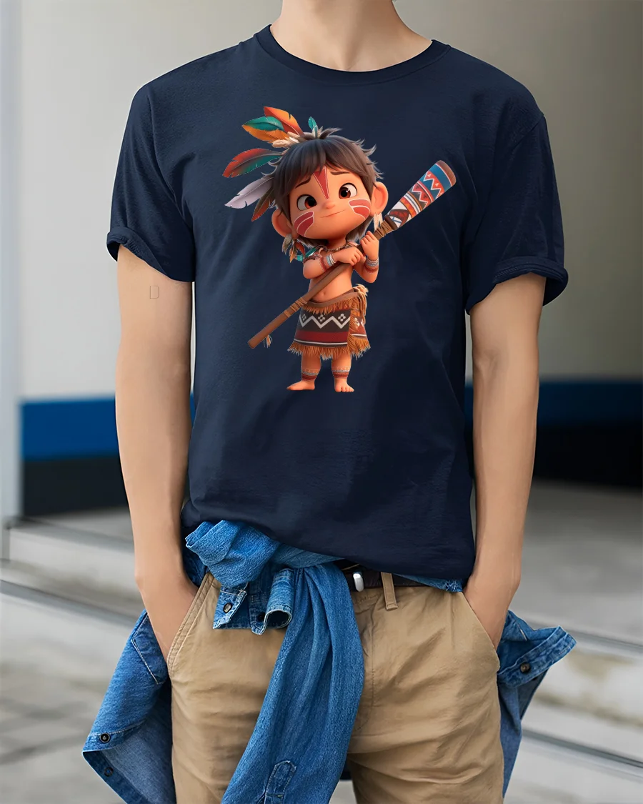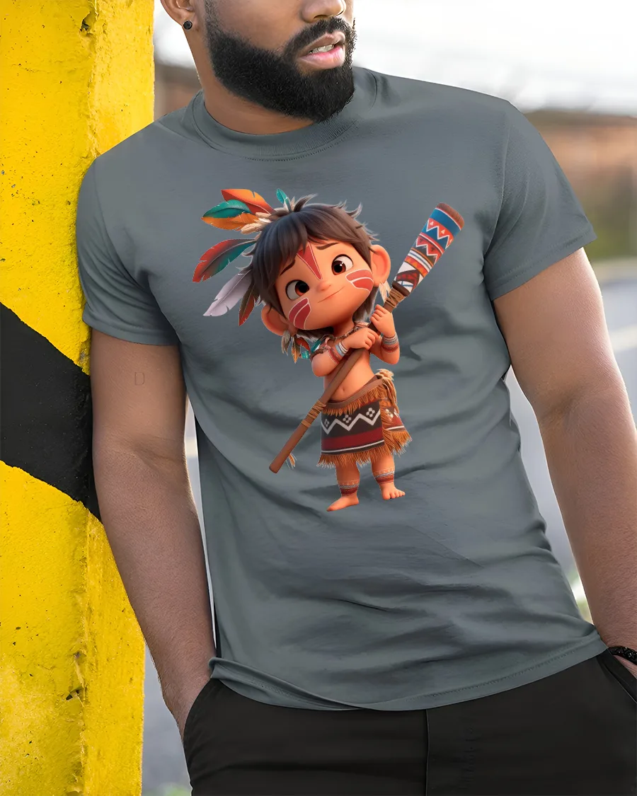 Bring fun and adventure to your wardrobe with the Cute Tribal Warrior Cartoon Character Graphic Tee, a playful design that captures the spirit of courage and imagination. This t-shirt features a cheerful cartoon kid styled as a warrior, complete with feathers, traditional outfit, and a decorated staff, making it both adorable and bold at the same time.