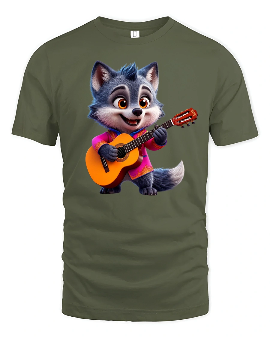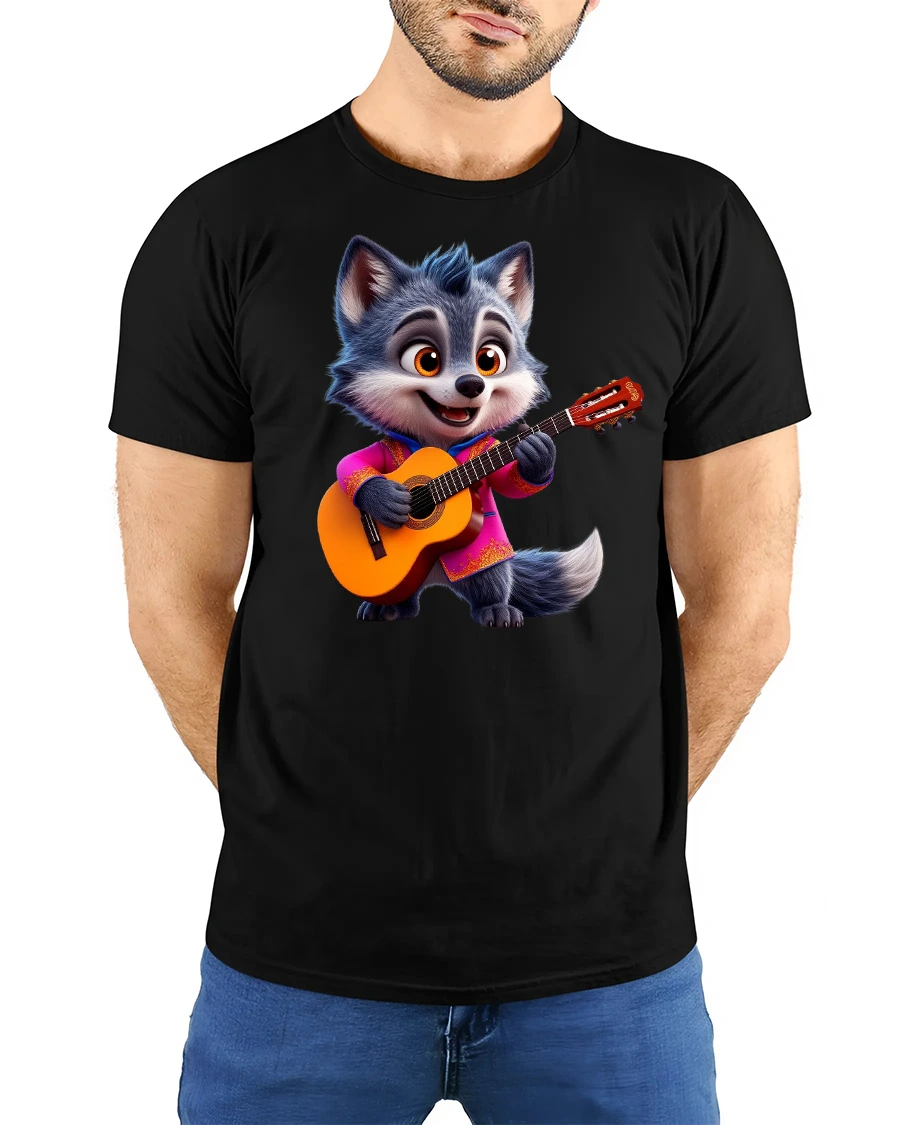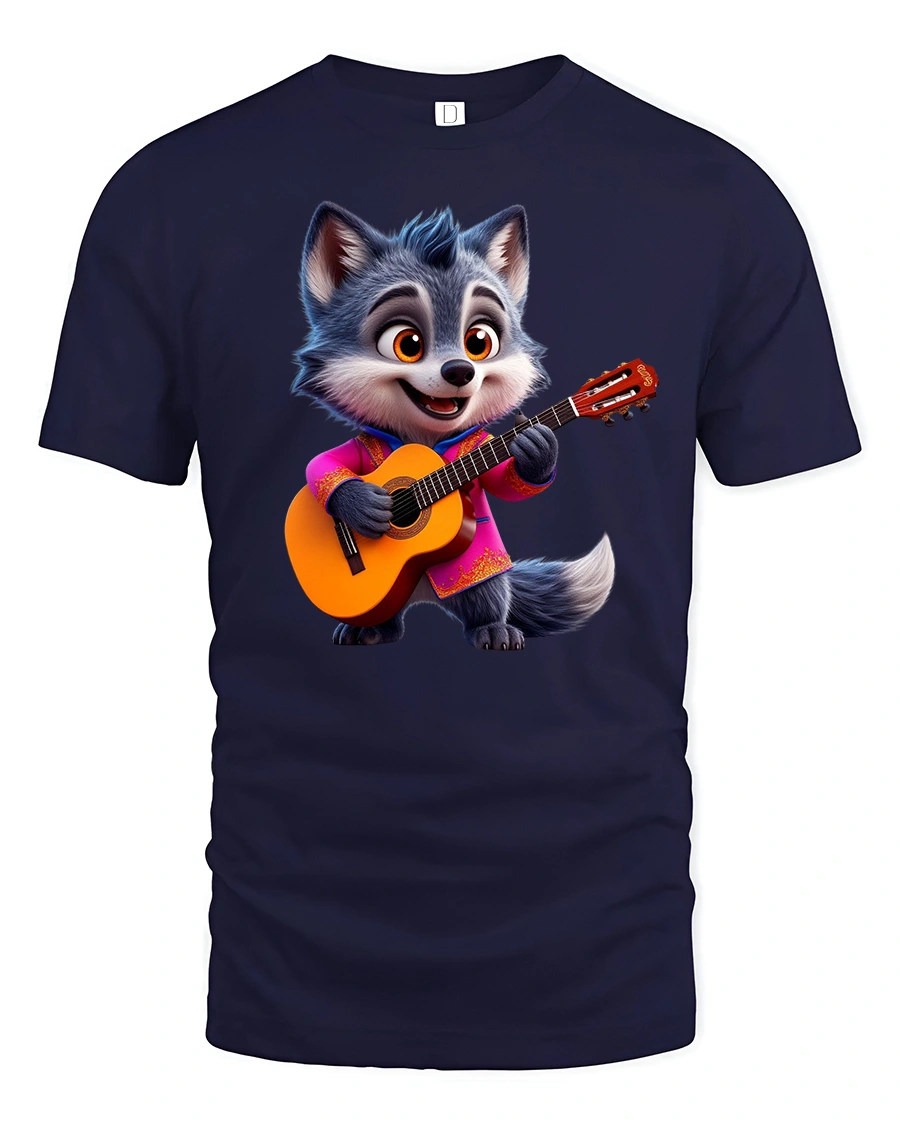 Featuring a cheerful cartoon wolf strumming a bright orange guitar, this tee perfectly combines playful charm with musical energy.
