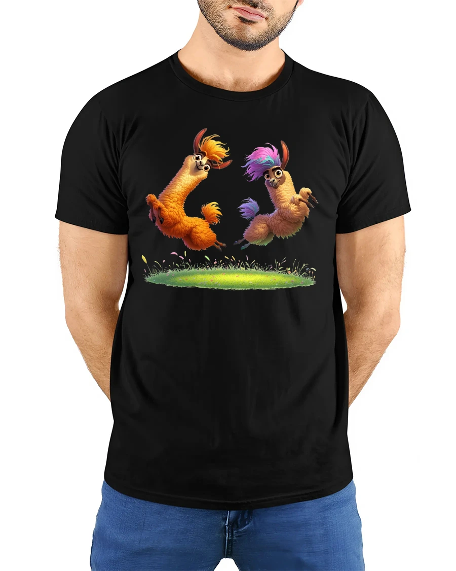This playful design features two adorable llamas jumping in joy with colorful hair and expressive faces that capture pure fun energy.