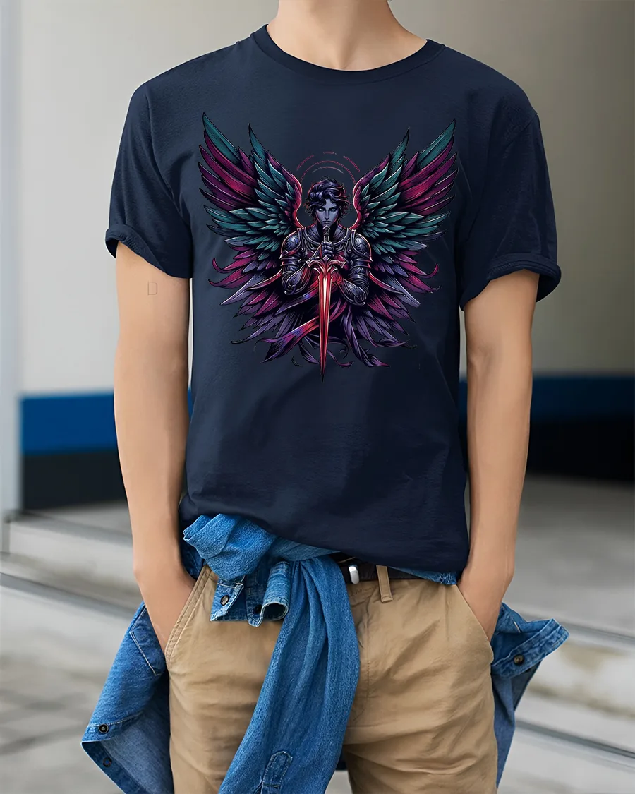The intricate details of the feathers and glowing sword make this shirt a true statement piece for everyday wear or cosplay events.