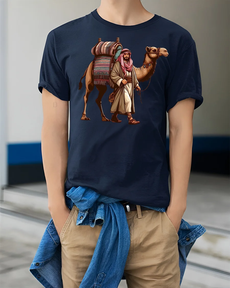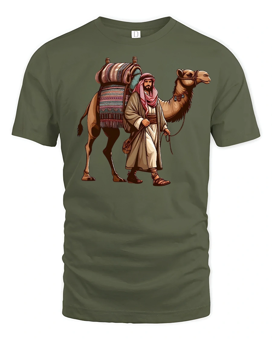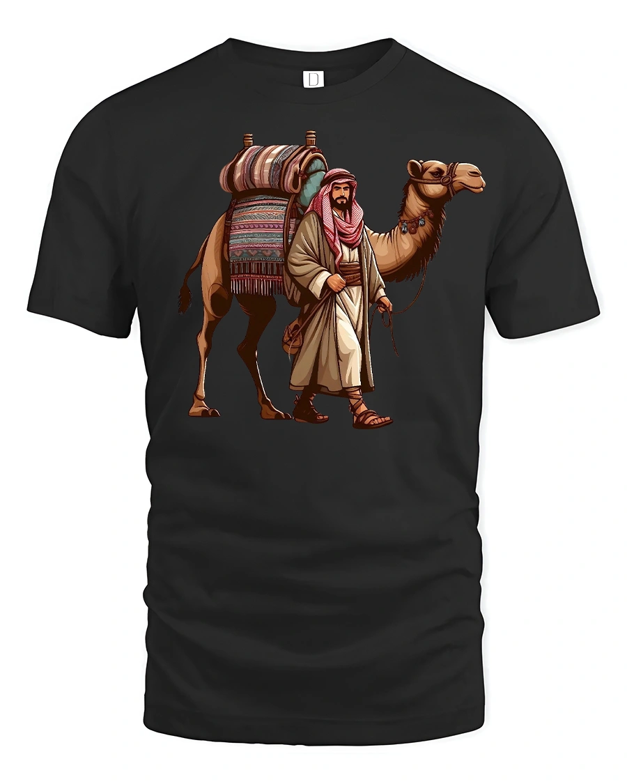 Step into the spirit of adventure with the Desert Caravan Camel Rider Nomad Graphic T-Shirt. Featuring a beautifully detailed illustration of a desert traveler and his loyal camel, this tee captures the essence of nomadic journeys across golden sands. With vibrant details on the camel’s saddle and the traveler’s attire, it’s a design that stands out with cultural richness and style.