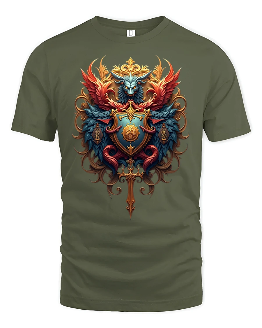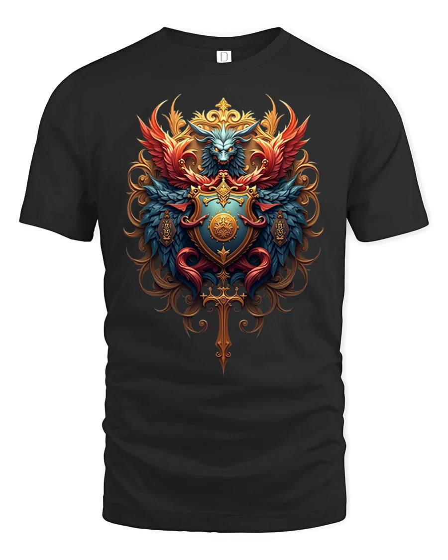 Dragon Crest Guardian Fantasy Medieval Art T-shirt blends medieval elegance with the fierce power of dragons.
