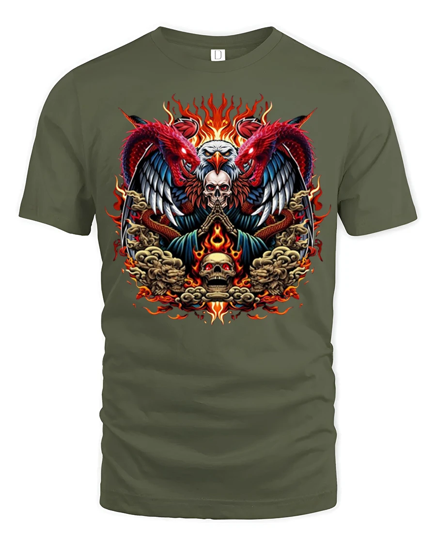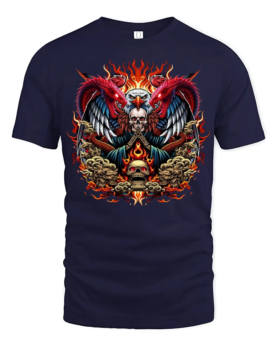 Dragon Eagle Skull Fire Graphic Tshirt Dark Fantasy Style showcases a powerful fusion of mythical creatures and intense fiery elements.