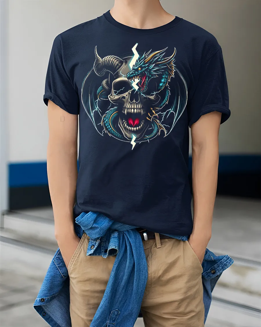 Featuring a fierce dragon intertwined with a detailed skull and electric lightning effects, this artwork creates a powerful and intense visual impact.
