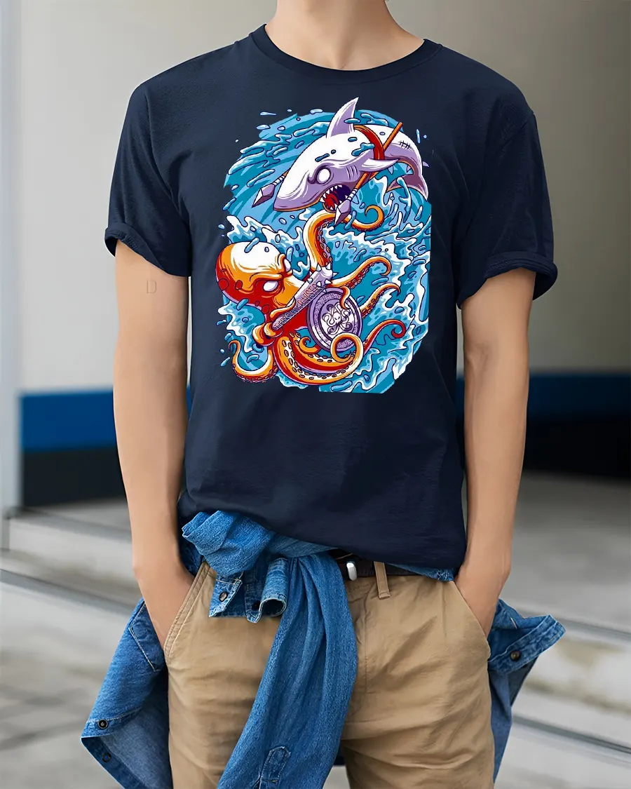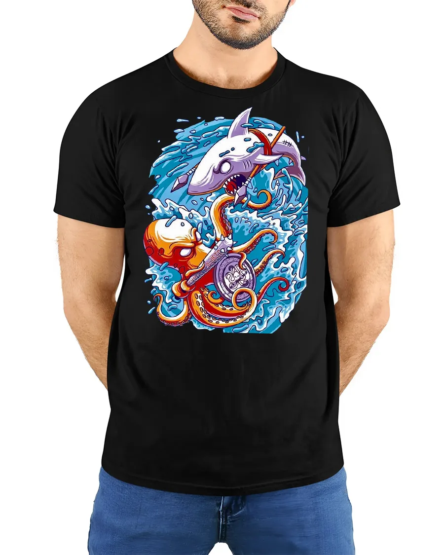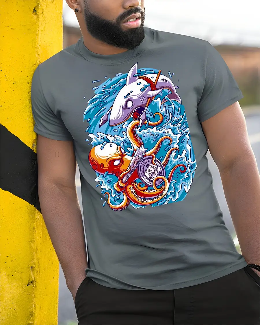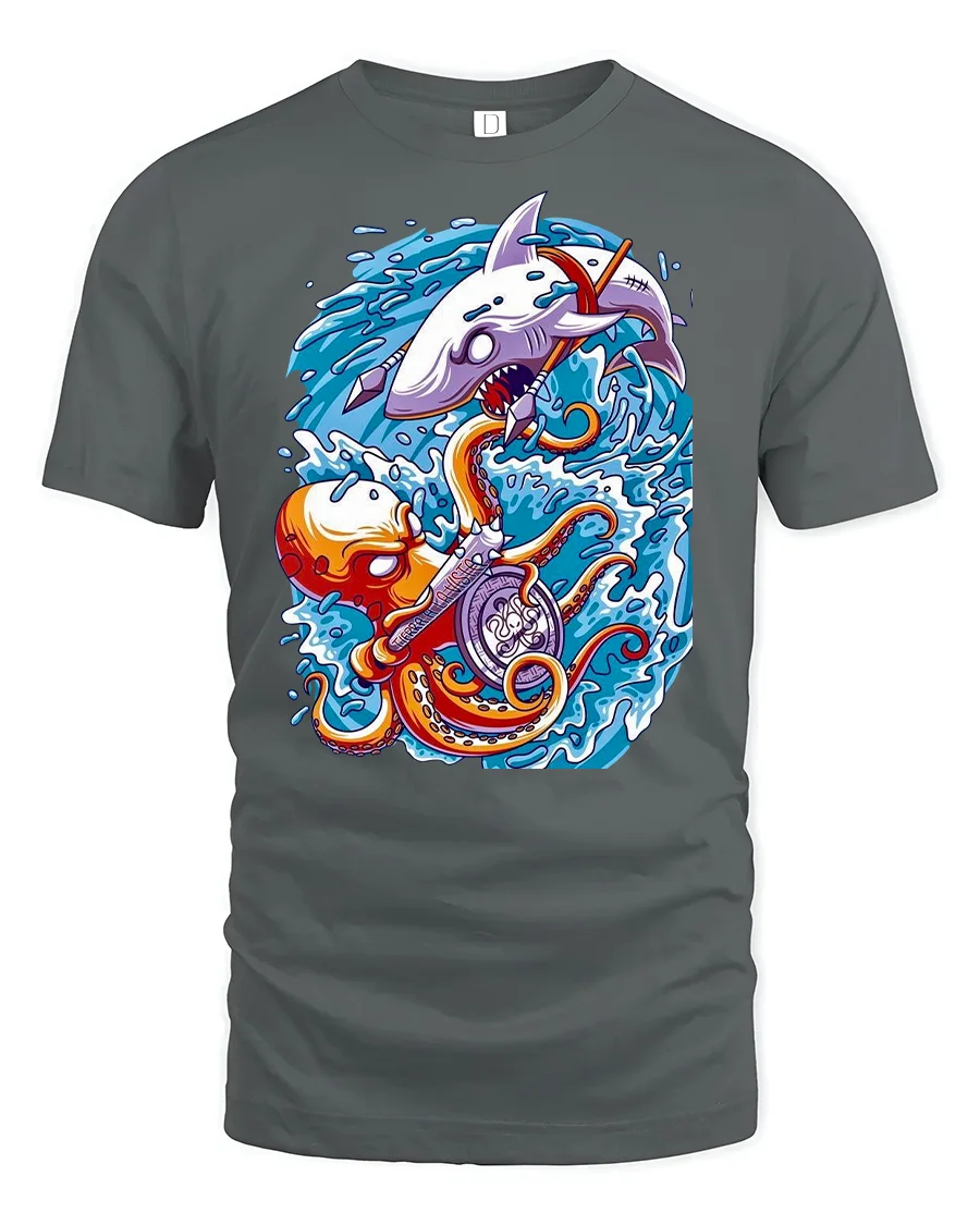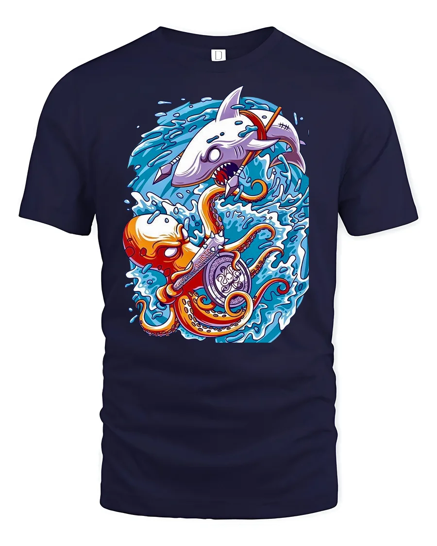 Make a bold splash with the Epic Shark vs Octopus Battle Ocean Graphic T-Shirt. Featuring a colorful and action-packed design of a shark locked in battle with a mighty octopus, this tee is perfect for ocean lovers, thrill-seekers, and anyone who enjoys bold statement graphics. The cartoon-style artwork adds a fun twist, making it both fierce and entertaining.