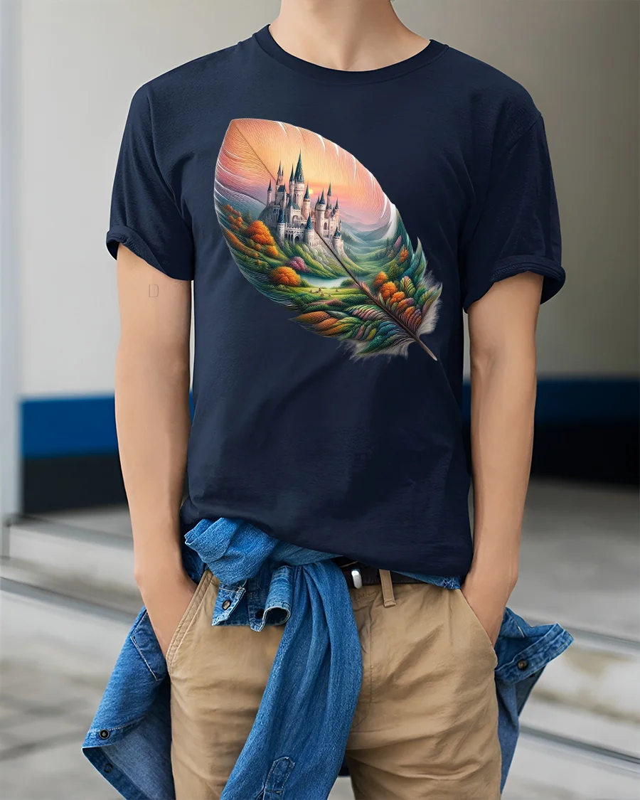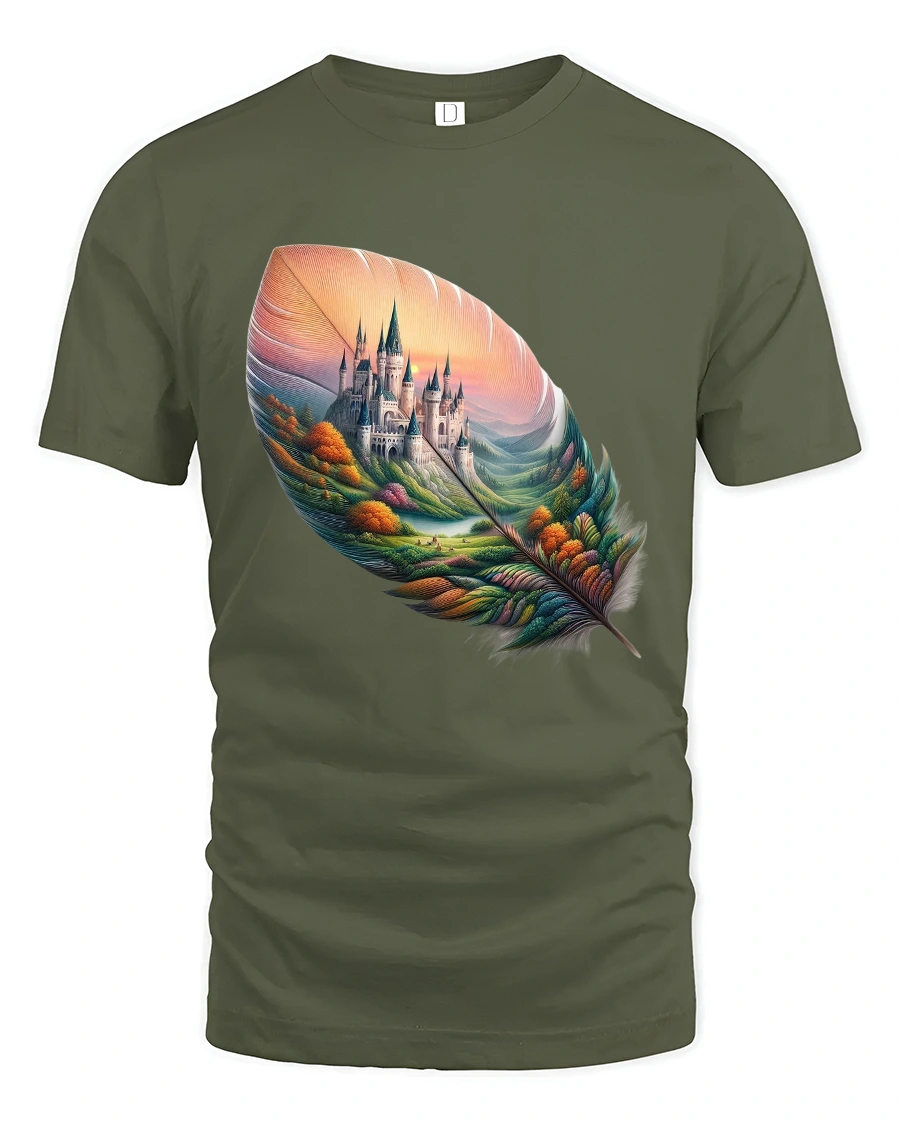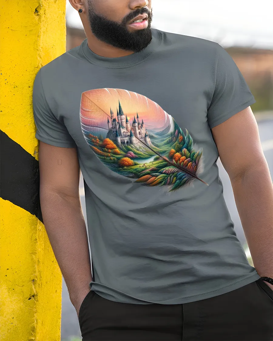 Ideal for fans of castles, fantasy scenery, and unique artistic designs, the Fantasy Castle Feather Artwork Magical Landscape T-Shirt makes an inspiring gift or a standout addition to your personal collection. Let your clothing reflect your love for creativity and storytelling with this enchanting and visually rich graphic tee.