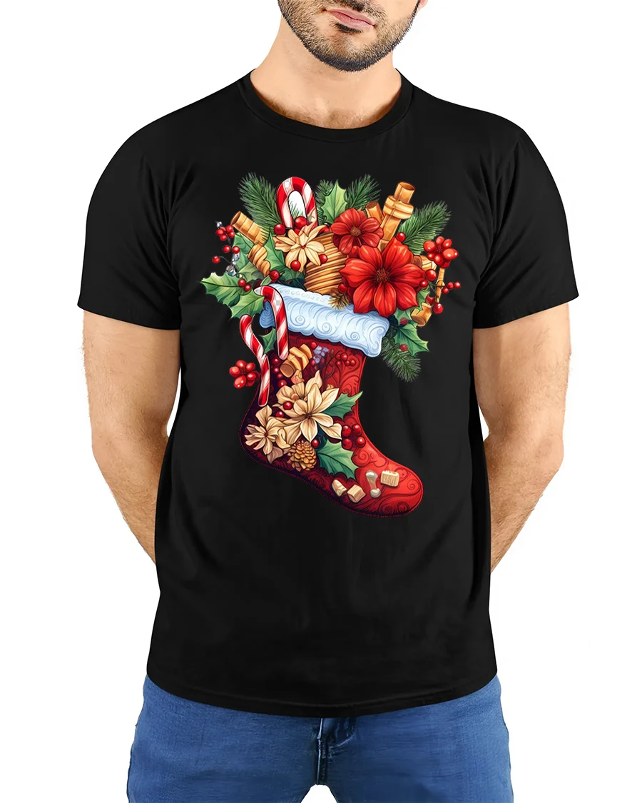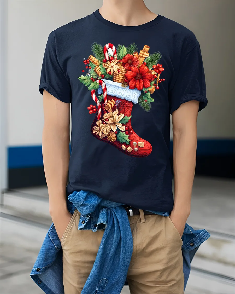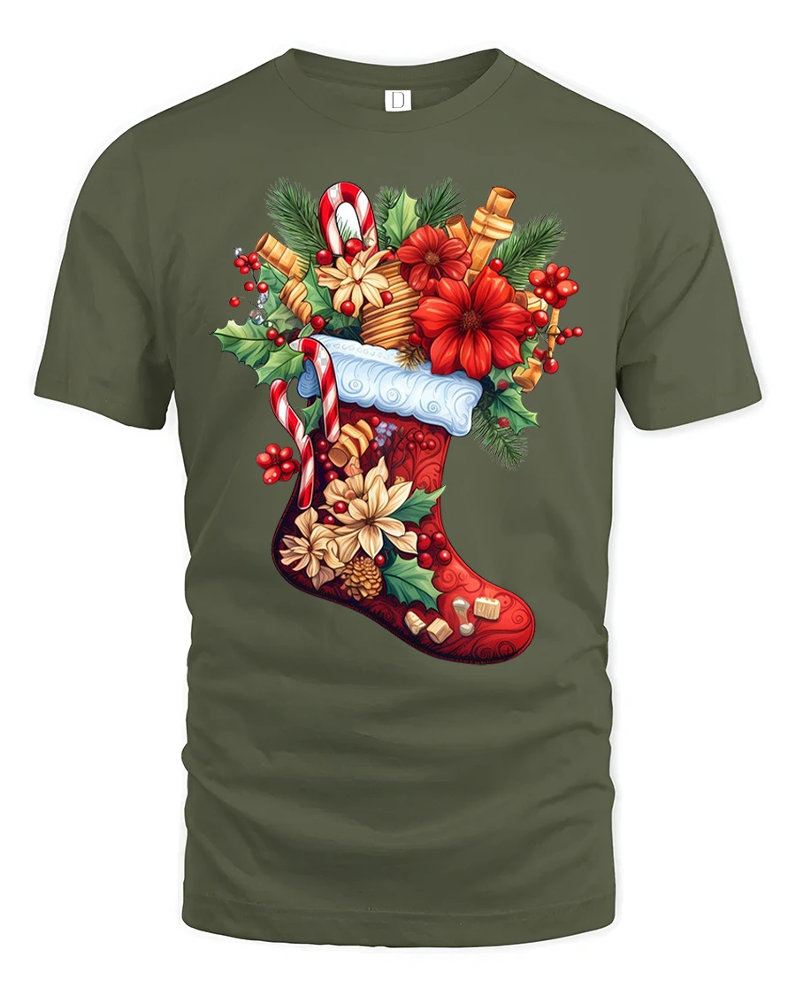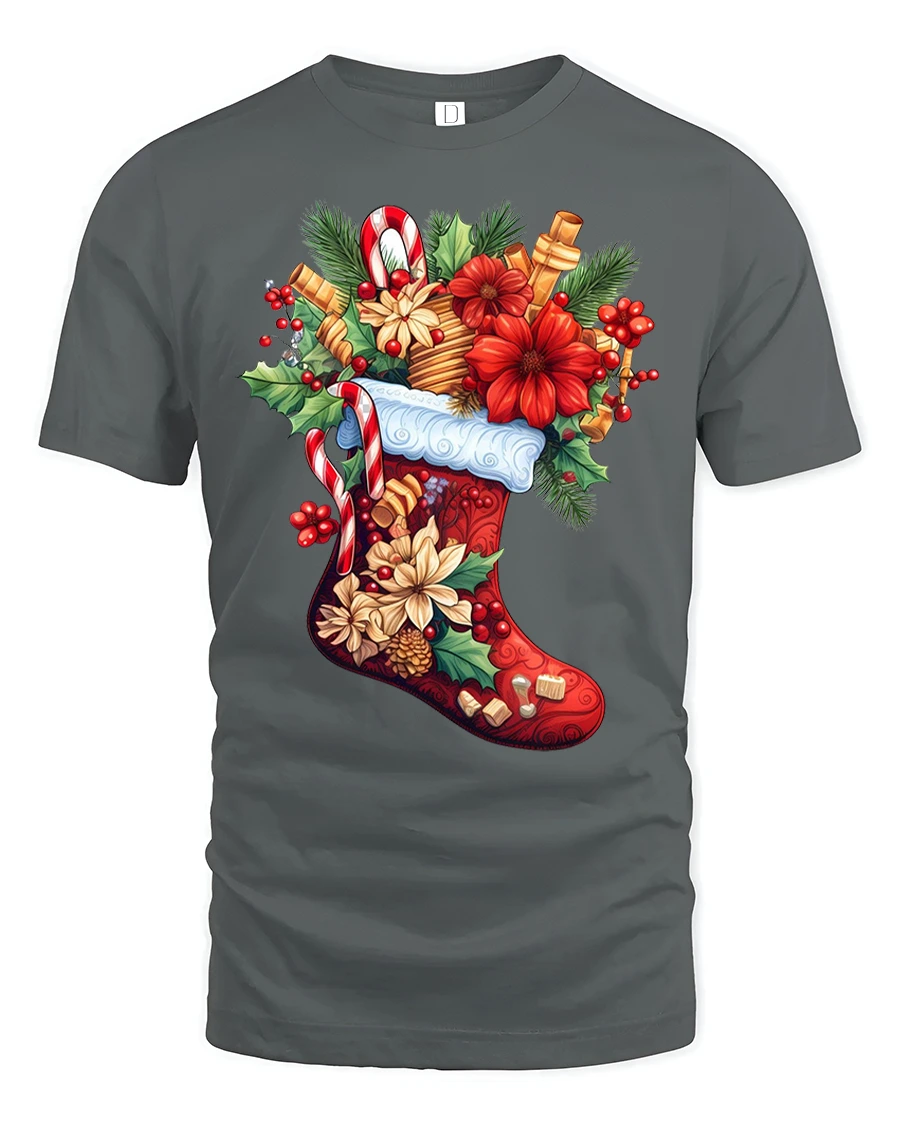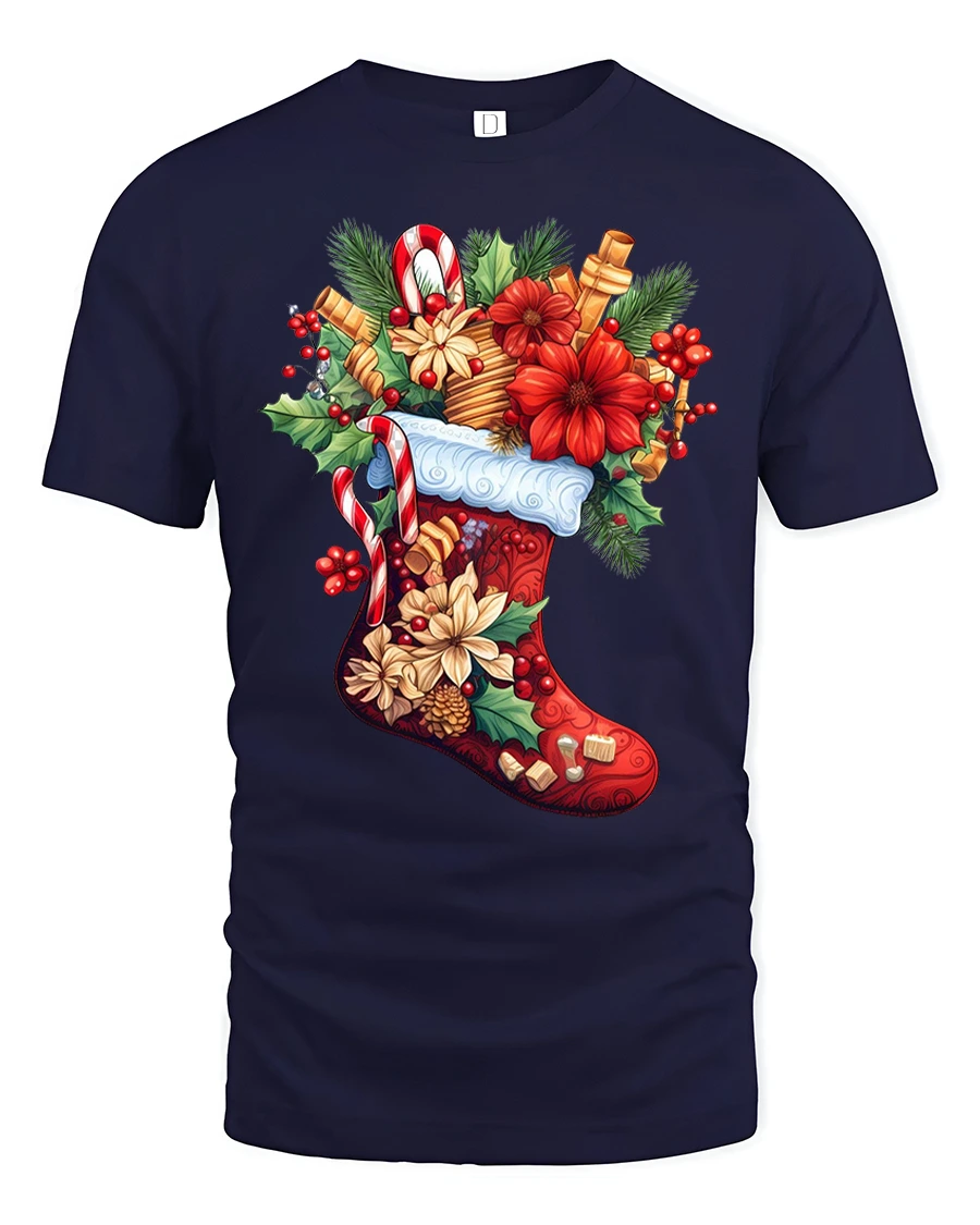 This Festive Christmas Stocking Floral Candy Graphic Tee Holiday Tshirt captures the joyful spirit of the season with a bright and beautifully detailed design. The colorful stocking overflows with poinsettias, candy canes, holly leaves, berries and festive gifts, creating a warm and cheerful holiday look that instantly stands out. Perfect for anyone who loves classic Christmas imagery, this tee adds a fun and decorative touch to your winter wardrobe.