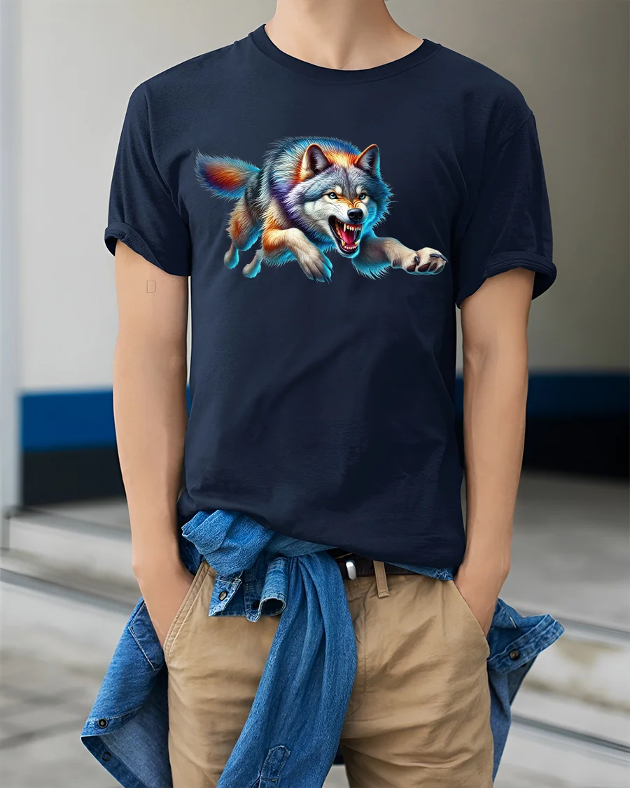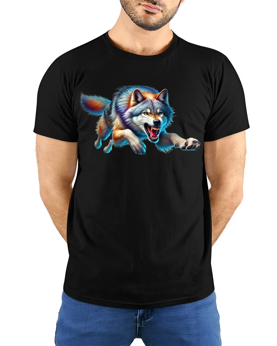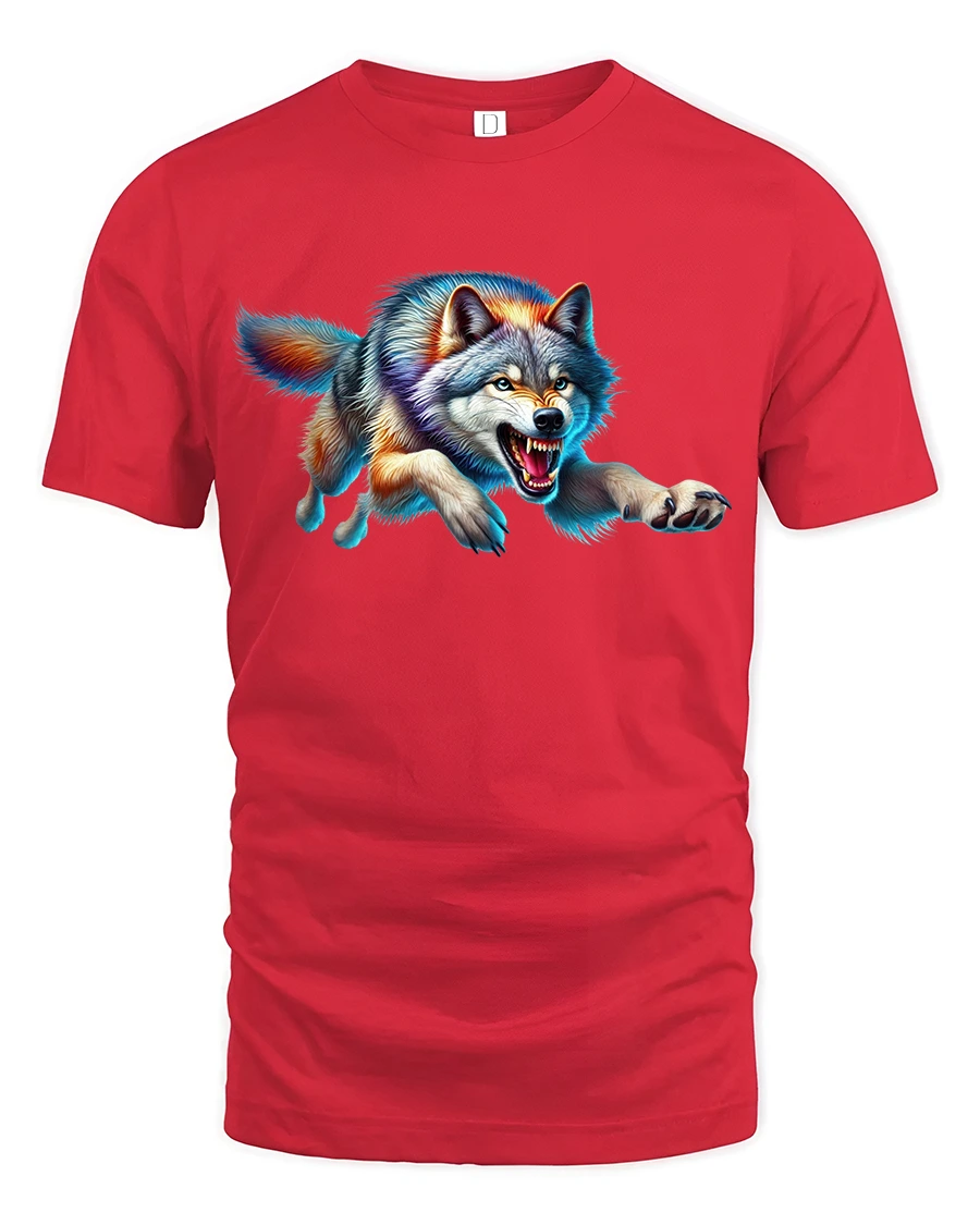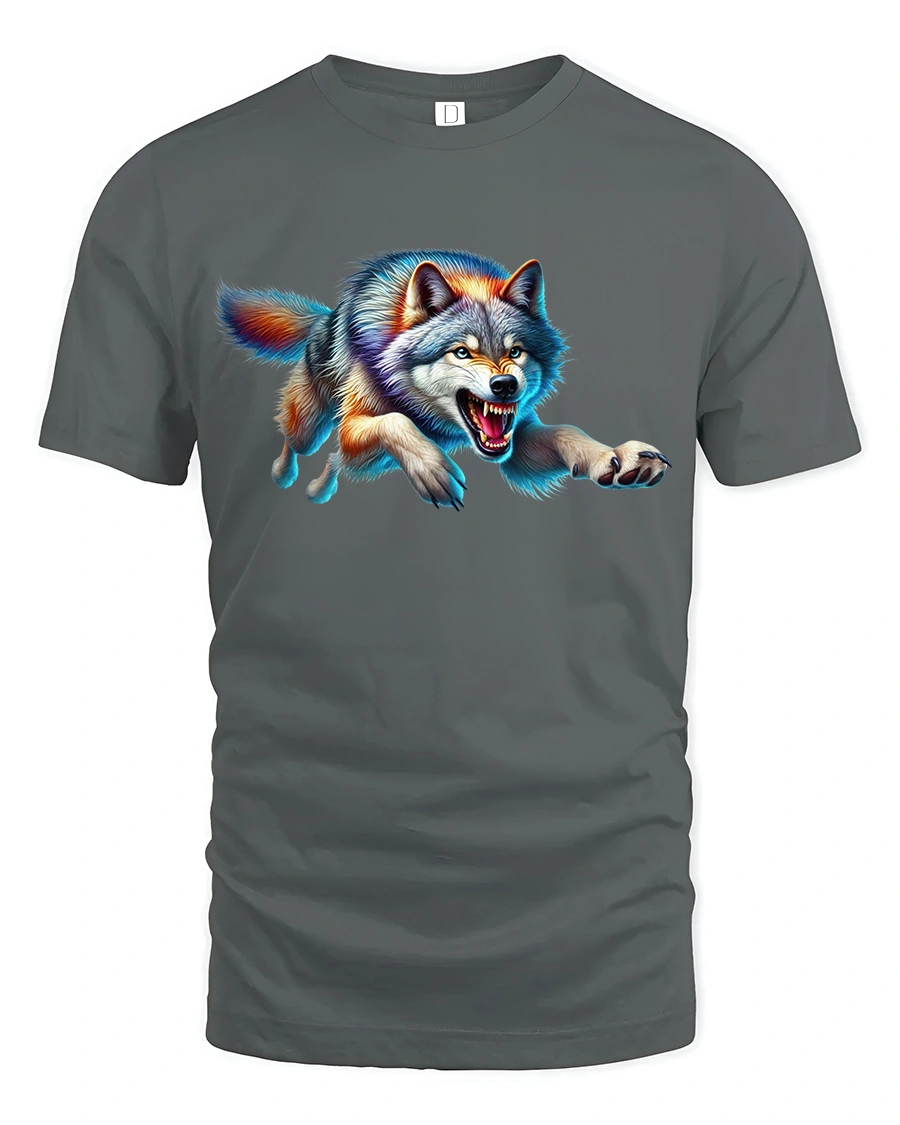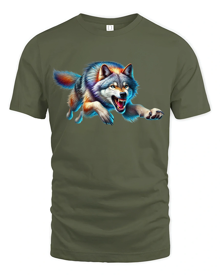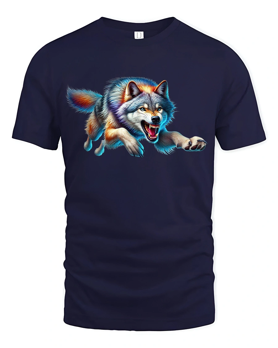 Featuring a striking, colorful wolf in motion with glowing details and sharp eyes, this shirt embodies strength, courage, and freedom.