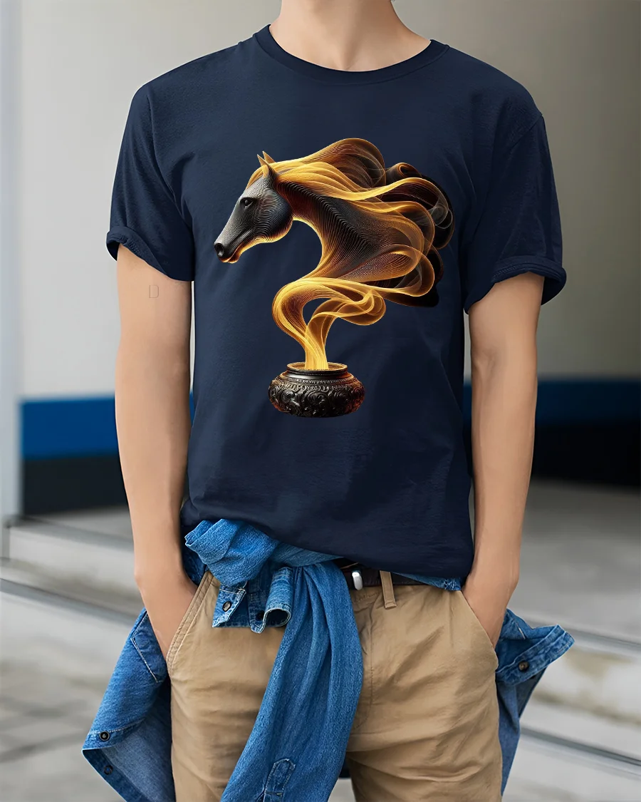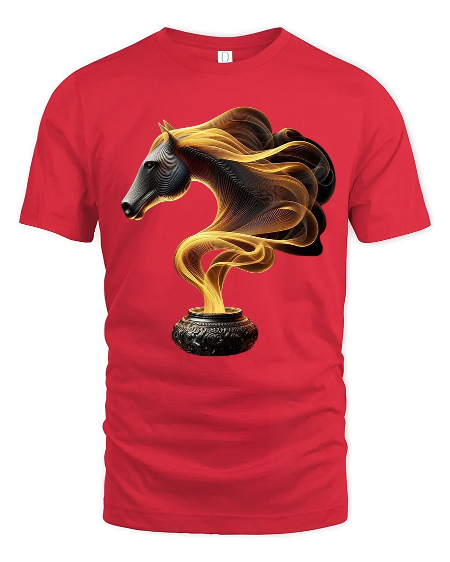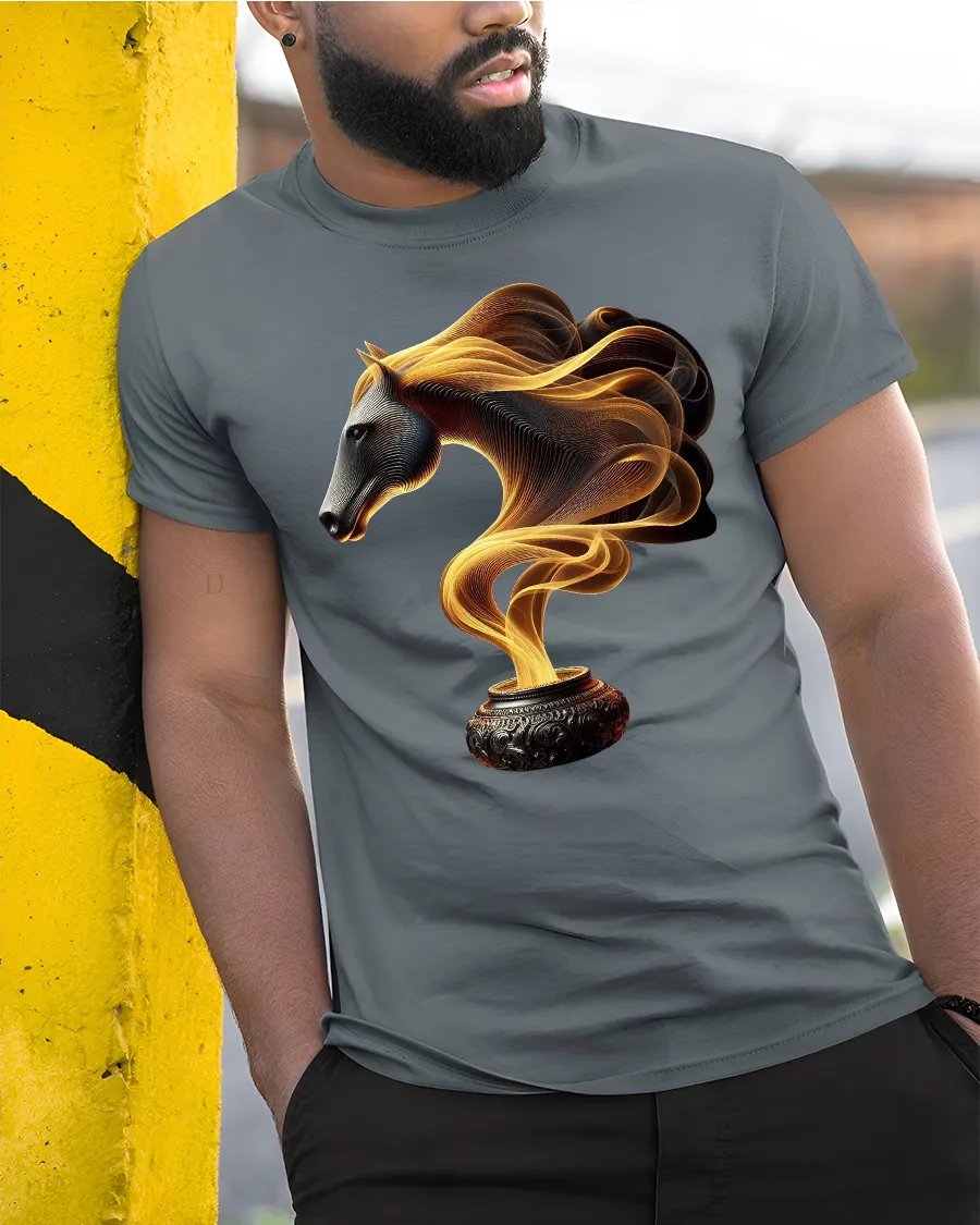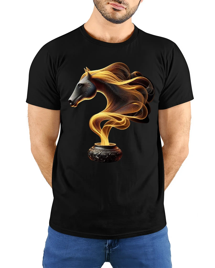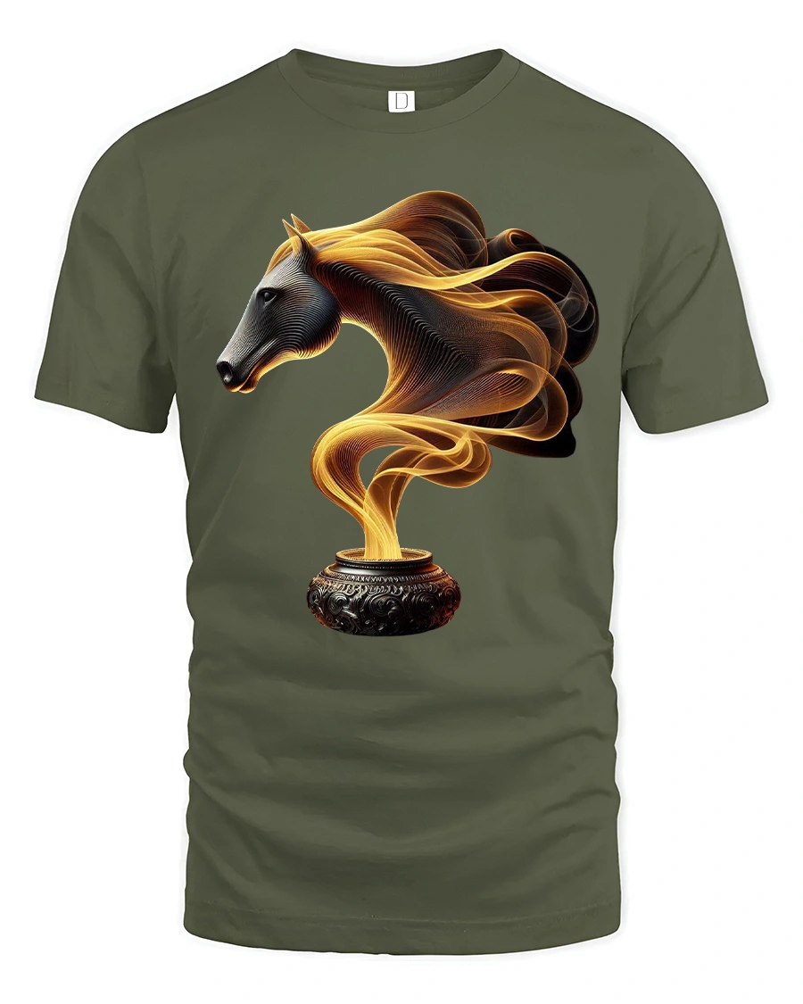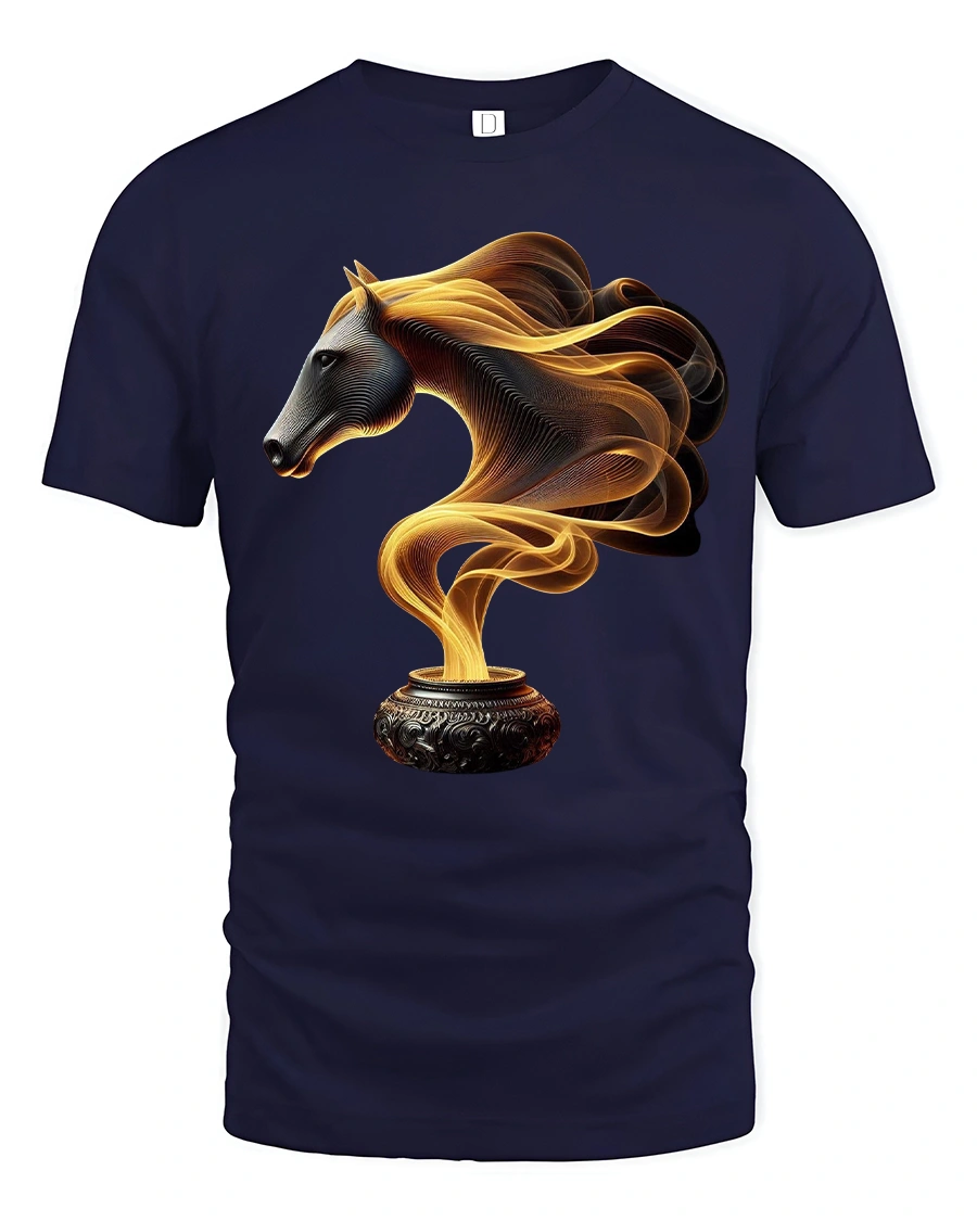 This Fire Smoke Horse Tee with Mystical Golden Swirl Art Design features a captivating blend of fantasy and elegance. The artwork shows a beautifully sculpted horse head emerging from swirling golden smoke rising from an ornate pot, creating a powerful image that feels both mystical and artistic. The intricate lines and glowing colors give the design an almost ethereal movement, making it visually striking and full of character.
