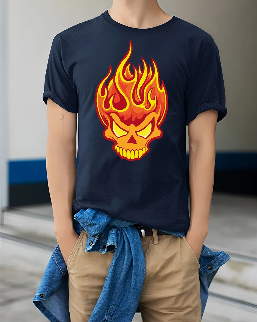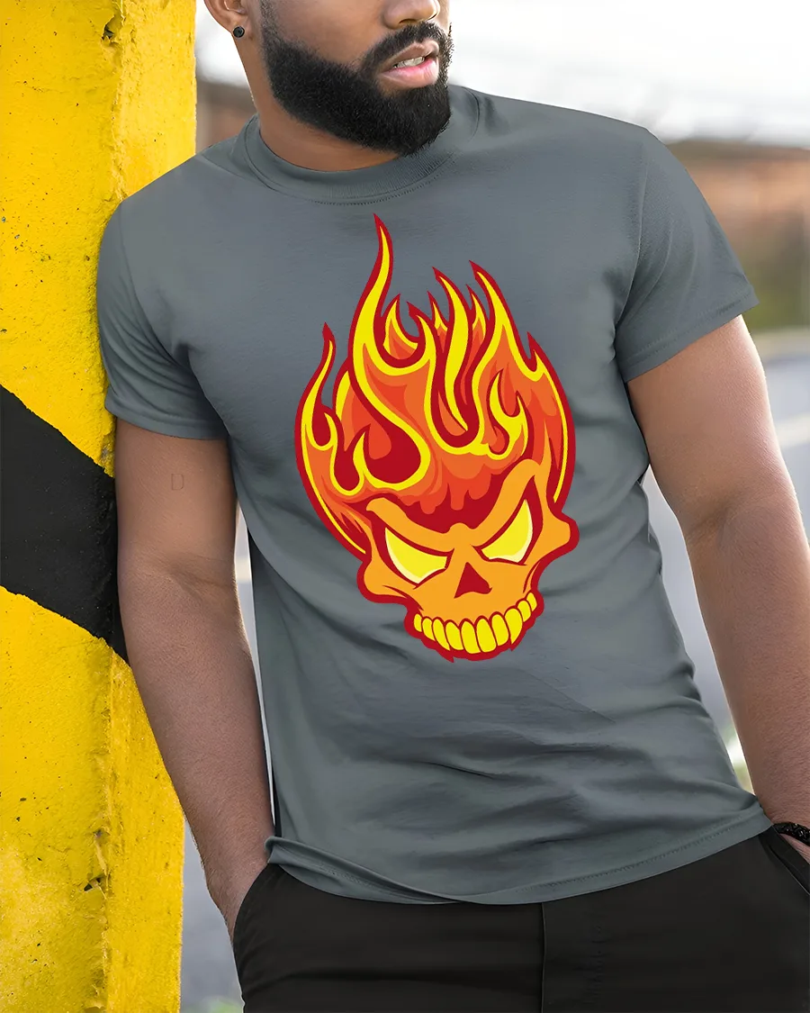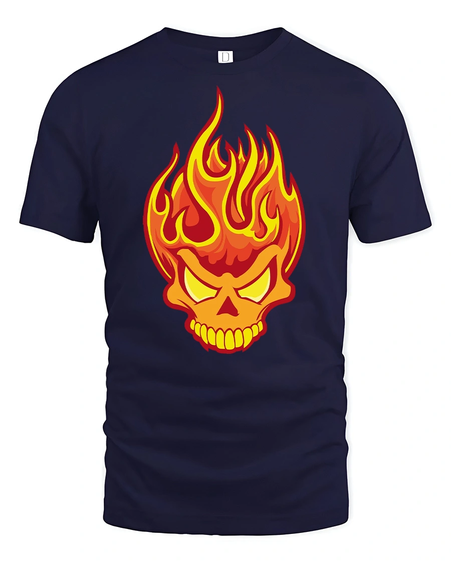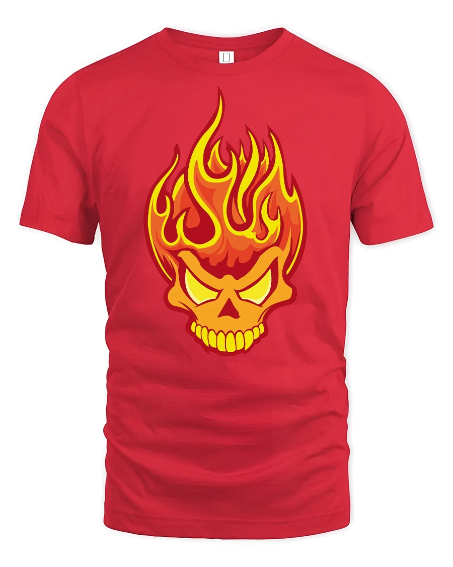 Featuring a fiery skull engulfed in bright orange and yellow flames, this tee brings intensity and confidence to any outfit.