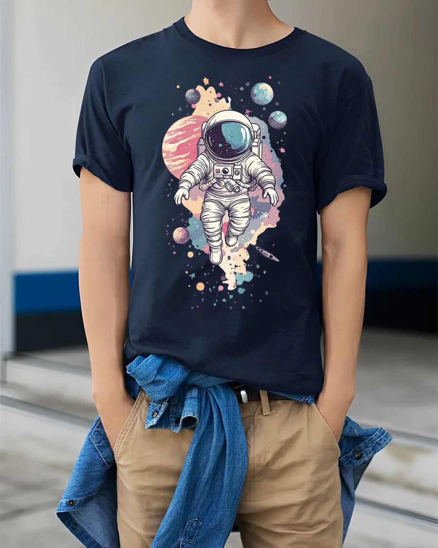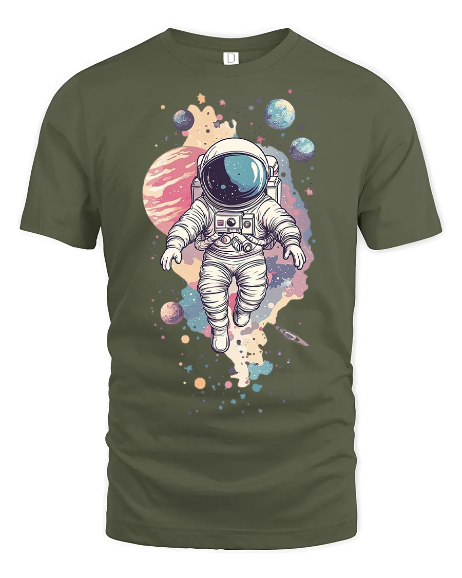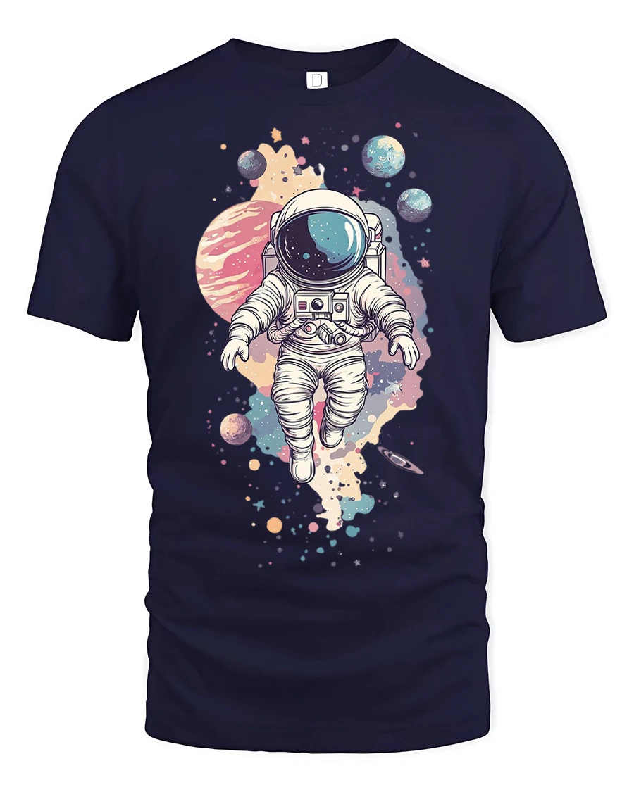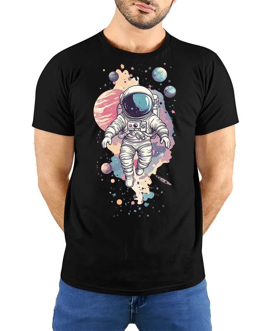 The Floating Astronaut Space Galaxy Graphic Tee Cool Space Tshirt features a beautifully illustrated astronaut drifting through a colorful galaxy filled with planets and stars.