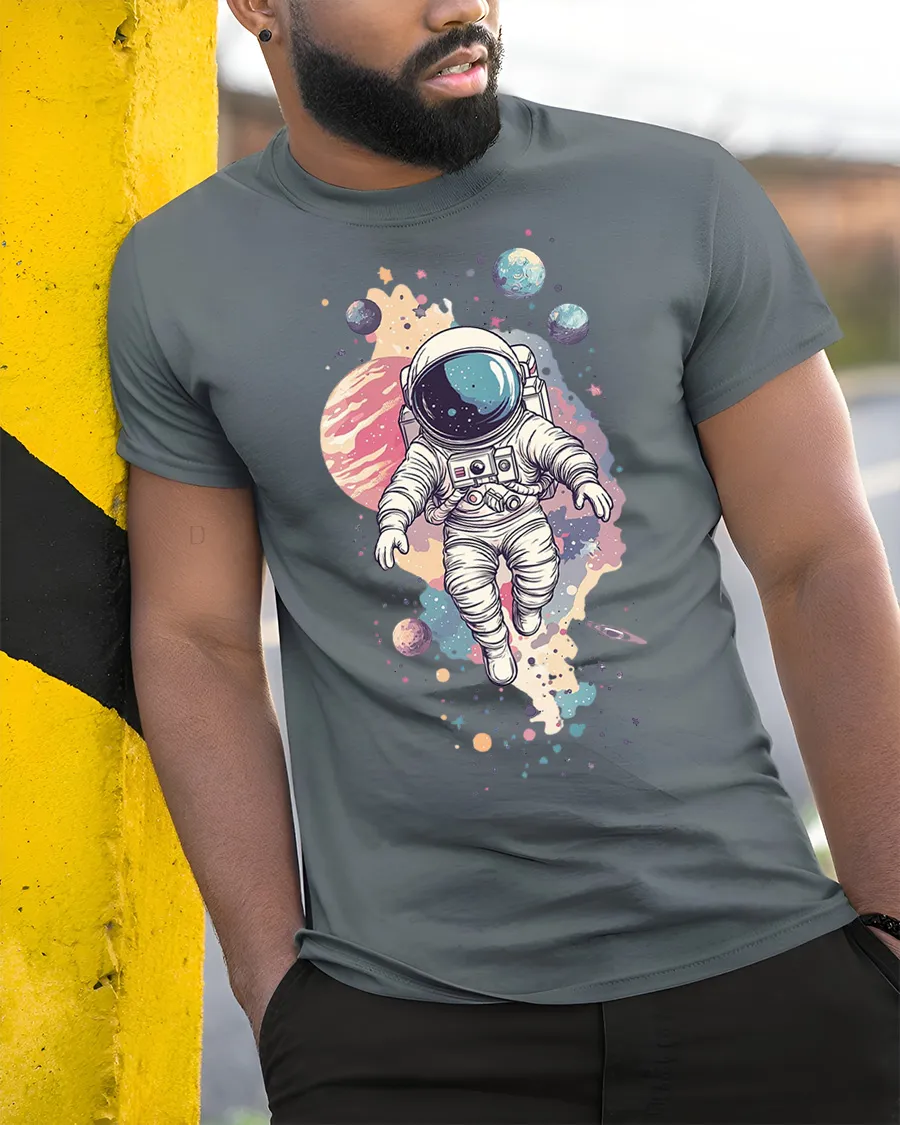The floating astronaut graphic adds a sense of adventure, imagination, and exploration that makes this graphic tee stand out in any casual outfit.