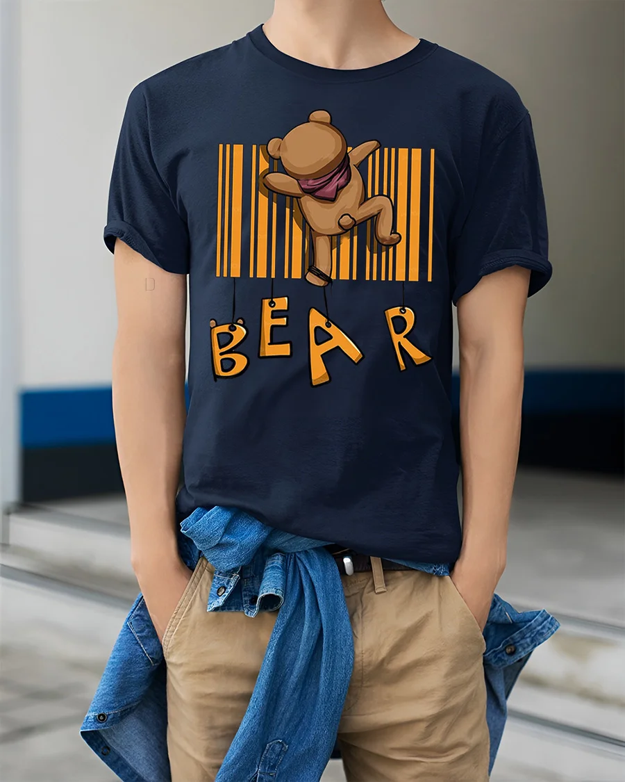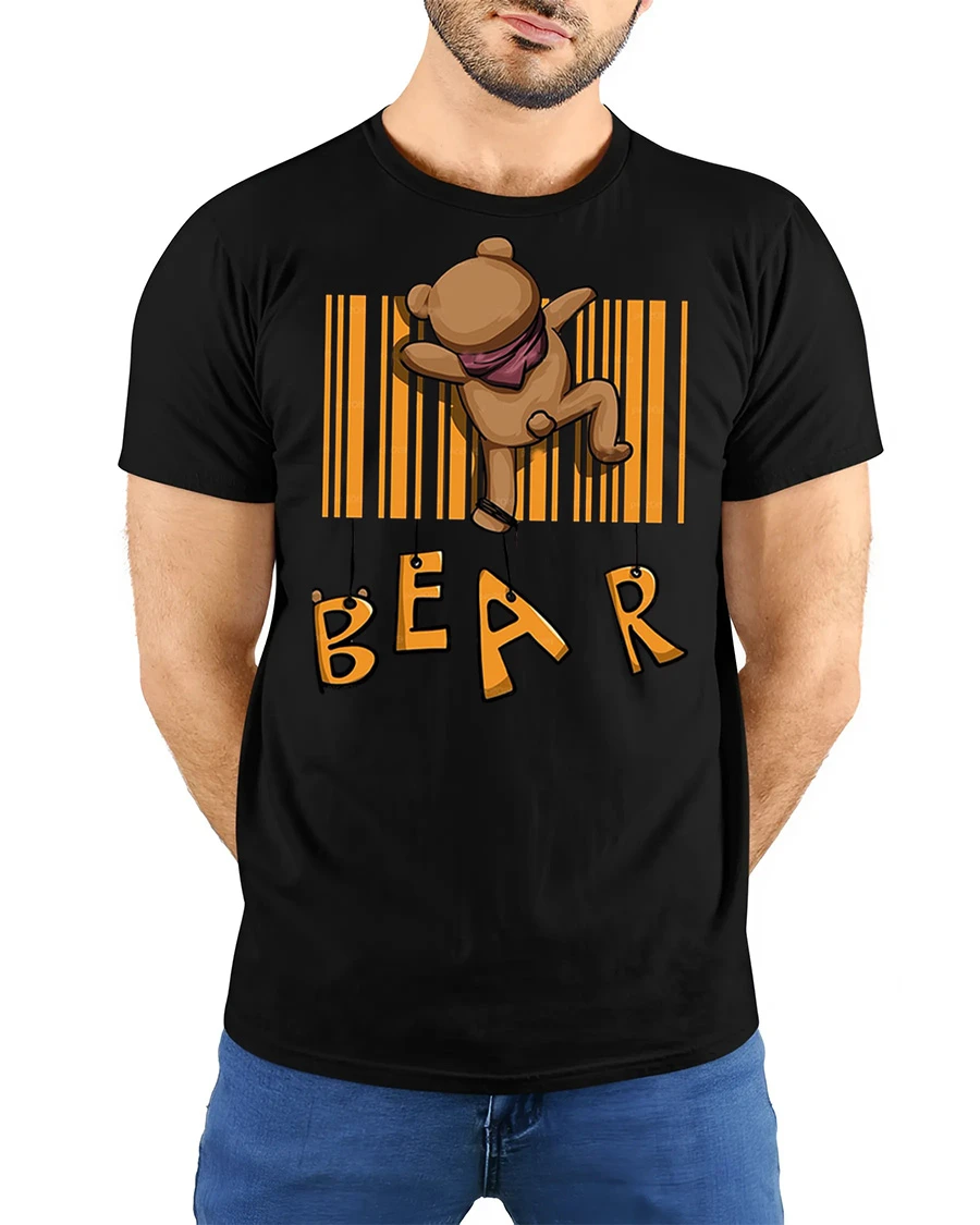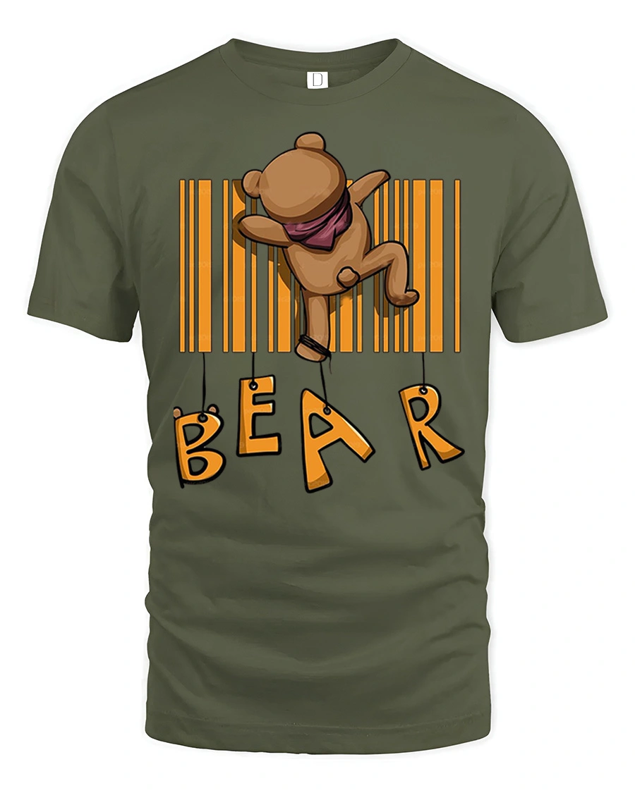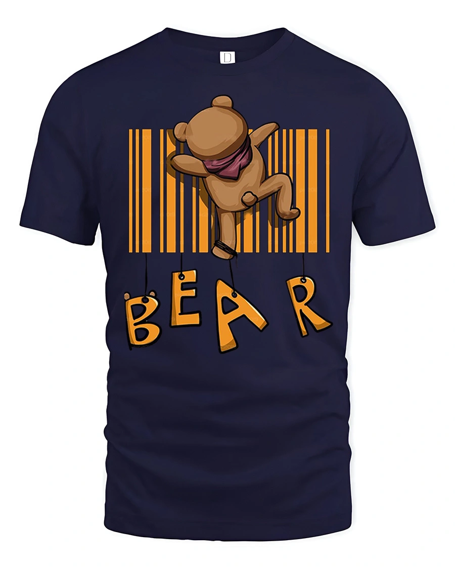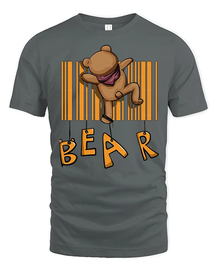 Funny Bear Barcode Graphic T Shirt Cute Cartoon Animal Tee features a cute and funny cartoon bear hanging from a barcode design that creates a playful and creative graphic. The adorable bear illustration combined with the unique barcode concept makes this tshirt a fun and eye catching design that adds personality and humor to any casual outfit. This graphic tee is perfect for anyone who loves cute animals and funny cartoon style designs.