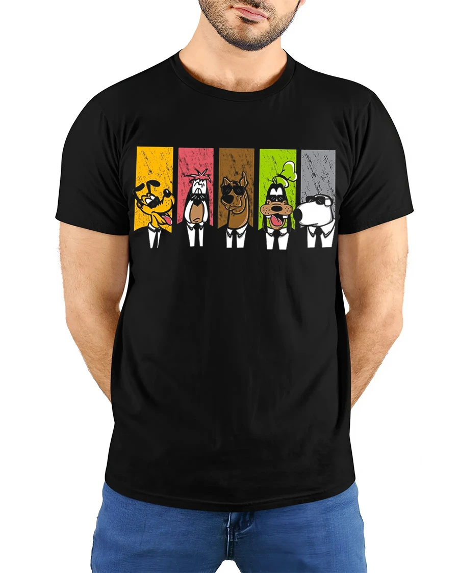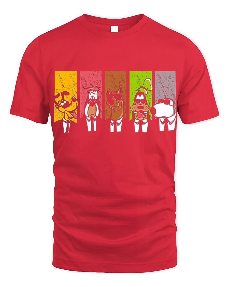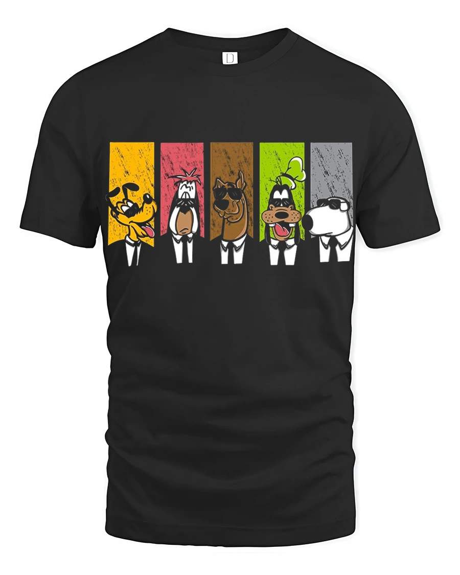 The Funny Cartoon Dog Squad Retro Panel Graphic T Shirt showcases a playful lineup of classic cartoon style dog characters presented in bold colorful panels.