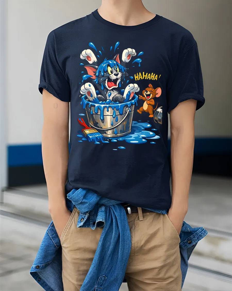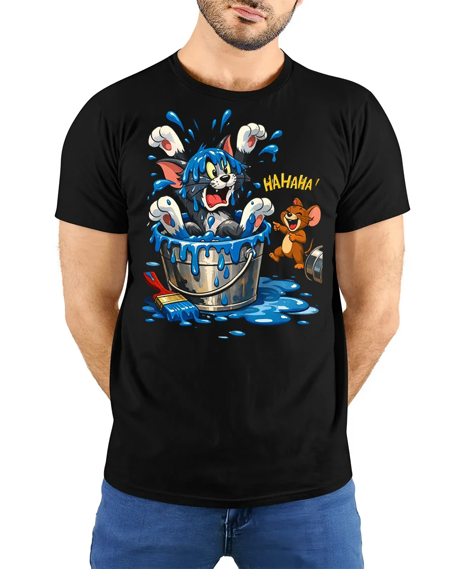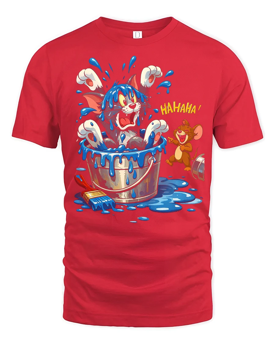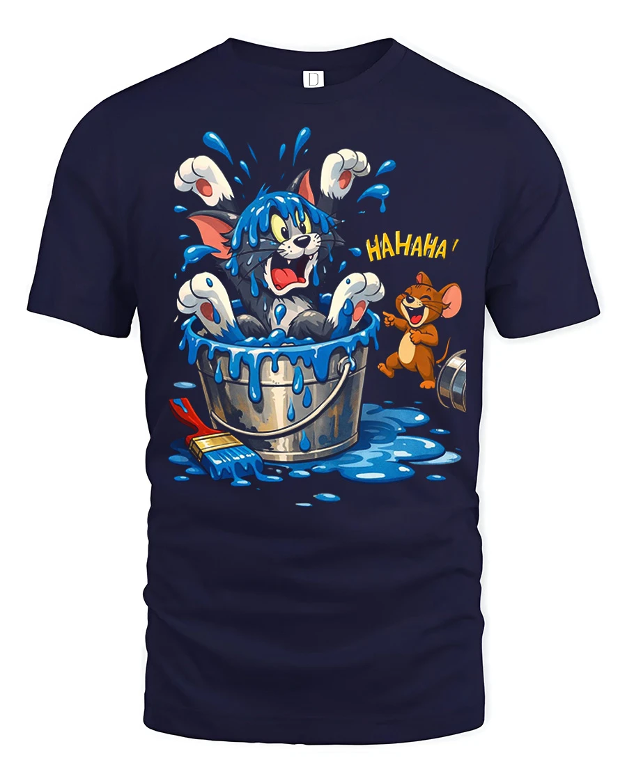 This funny cat bucket splash t shirt features a hilarious cartoon design showing a surprised cat splashing out of a water bucket while a laughing mouse watches the chaos. The playful artwork brings a fun and cheerful vibe that makes this graphic tee stand out in any casual outfit. The soft fabric feels comfortable and lightweight, making it perfect for everyday wear, relaxing weekends, or hanging out with friends.