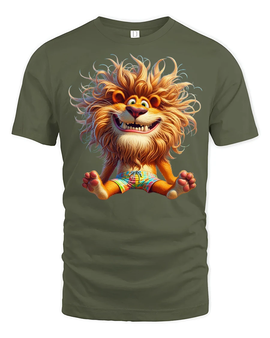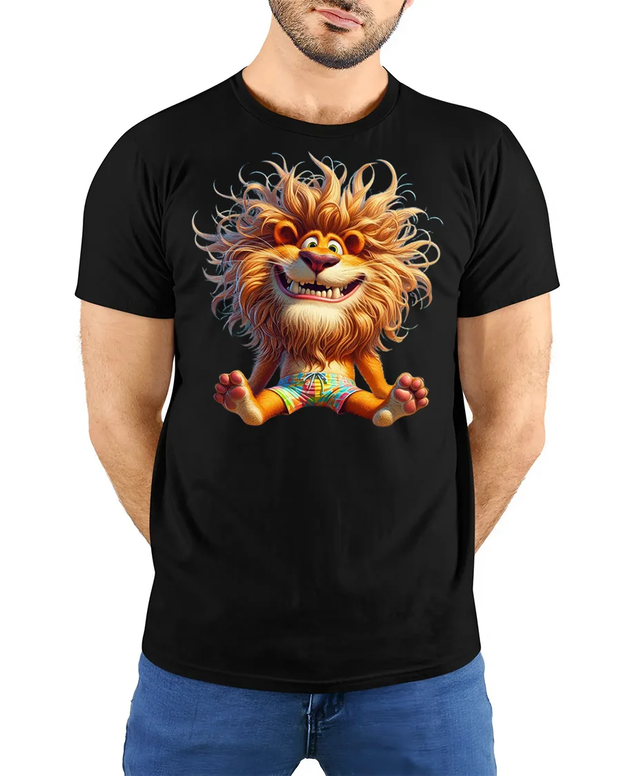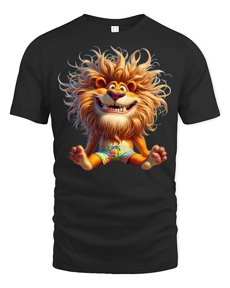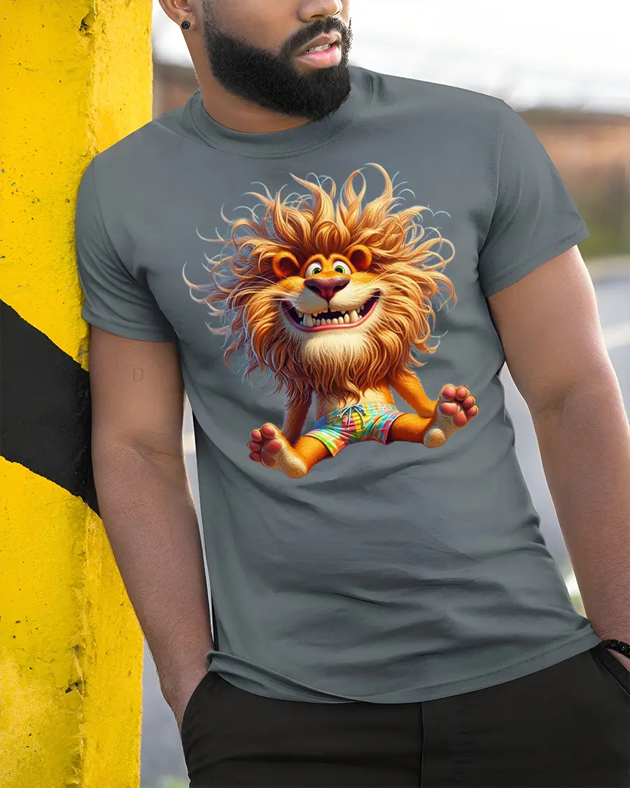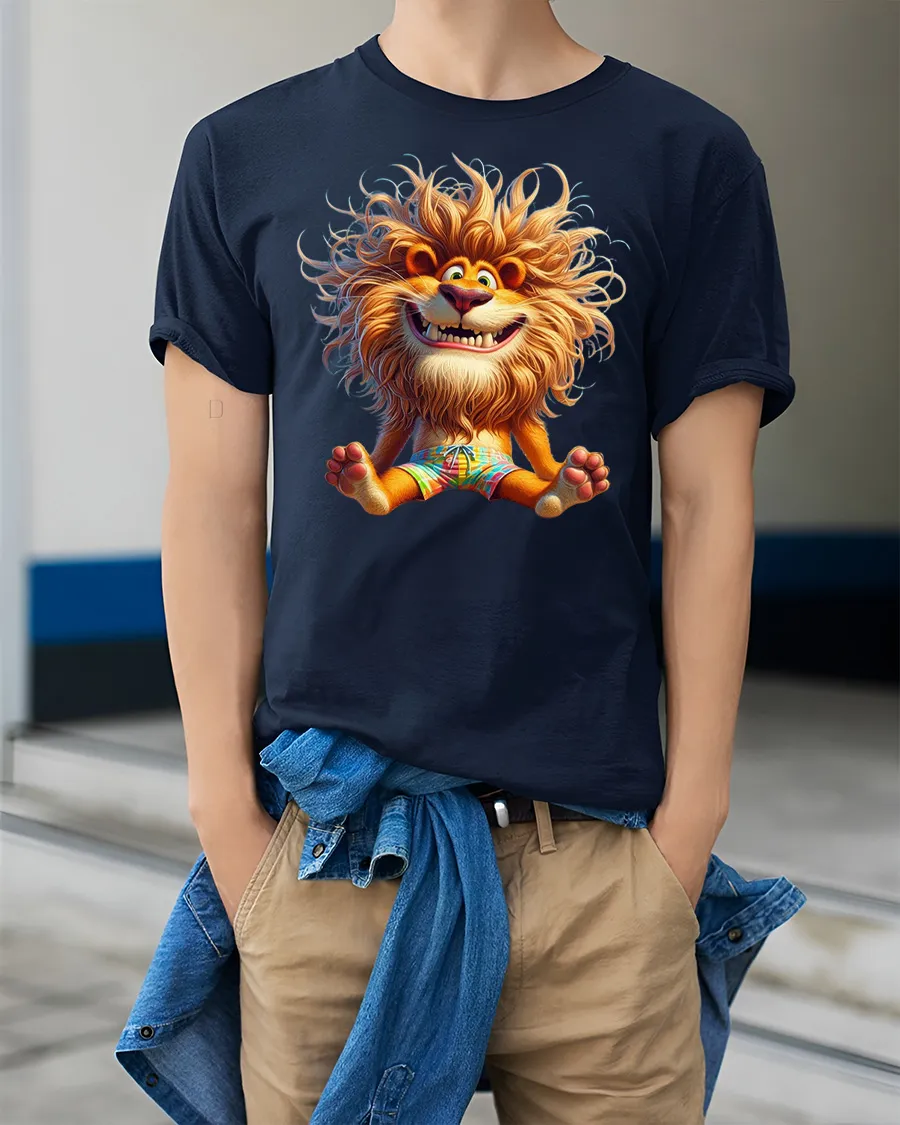 Featuring a smiling lion with fluffy hair and a lively cartoon expression, this tshirt captures a fun and energetic vibe that instantly stands out.
