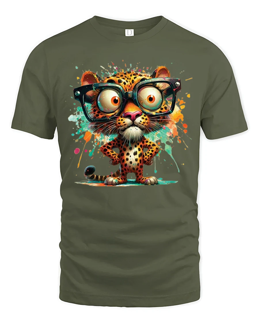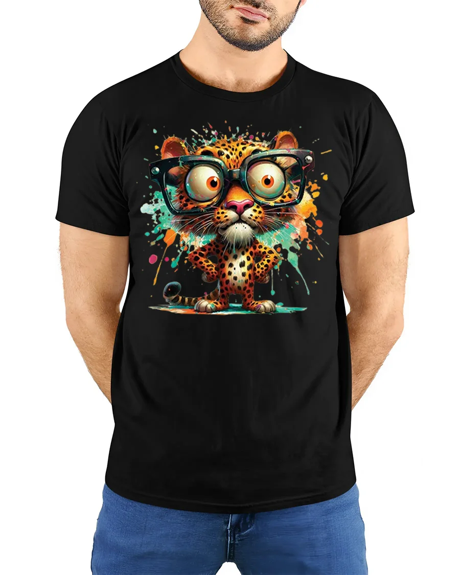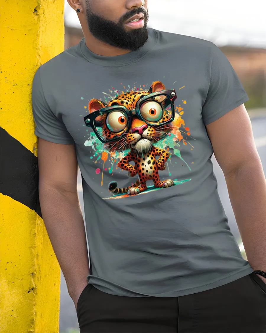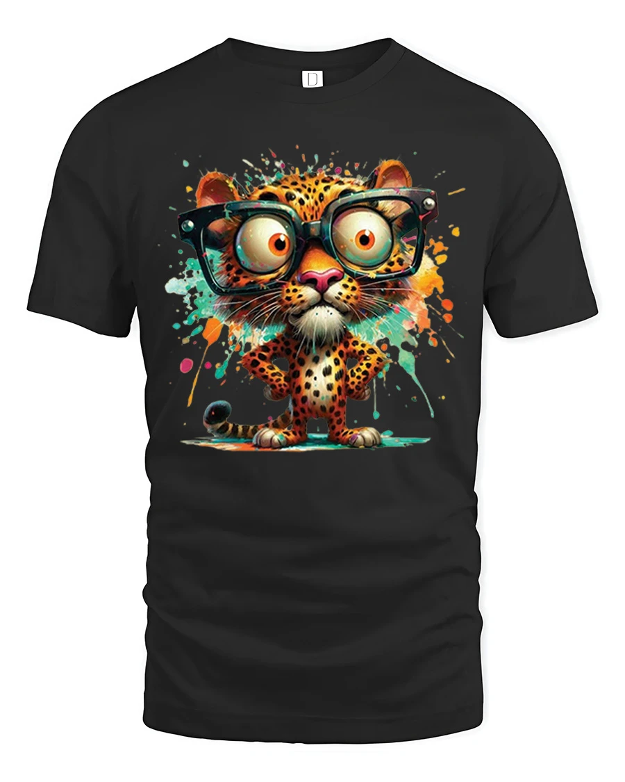 This eye catching design features a cute cartoon leopard with oversized glasses and colorful splash art that creates a fun and stylish statement.