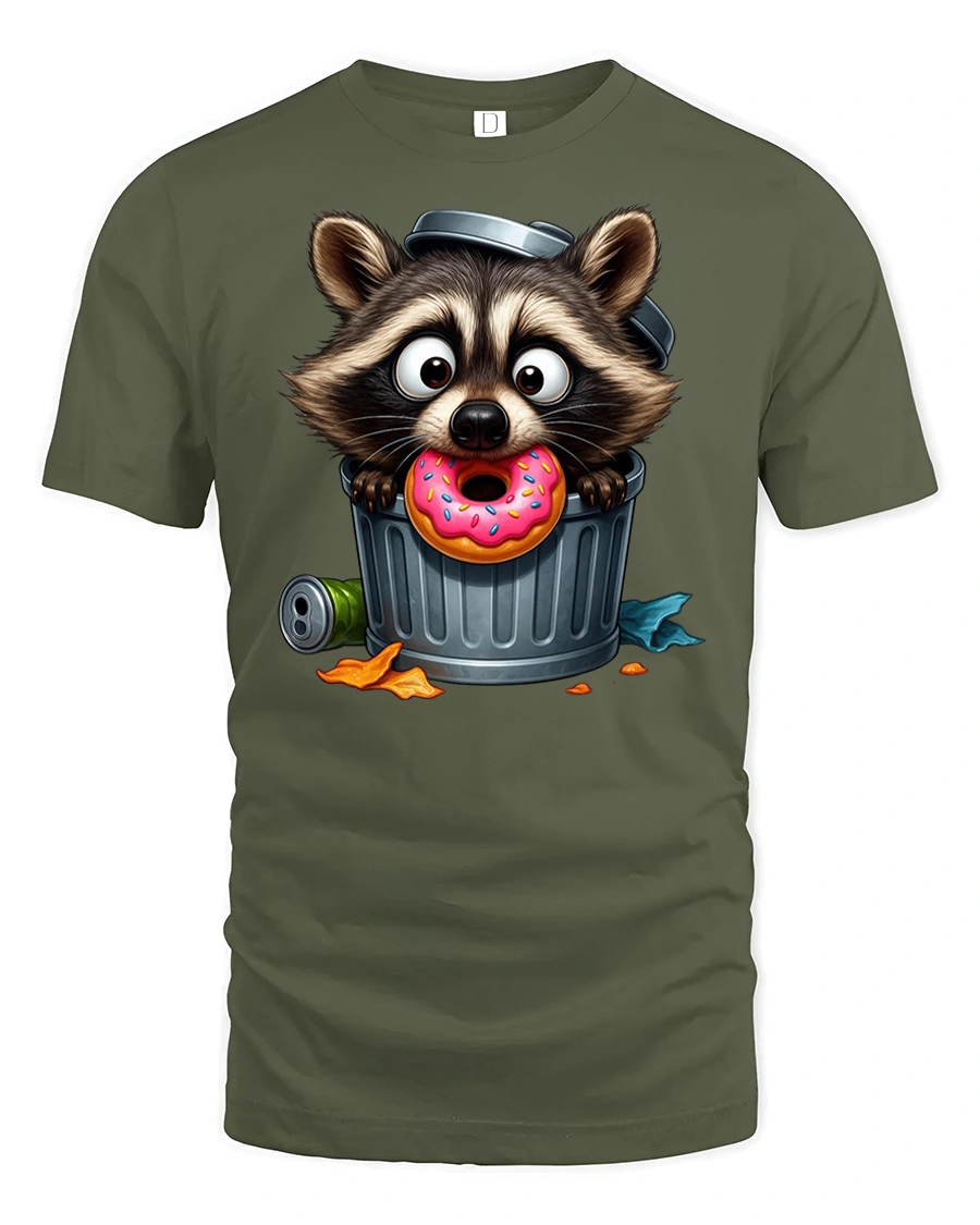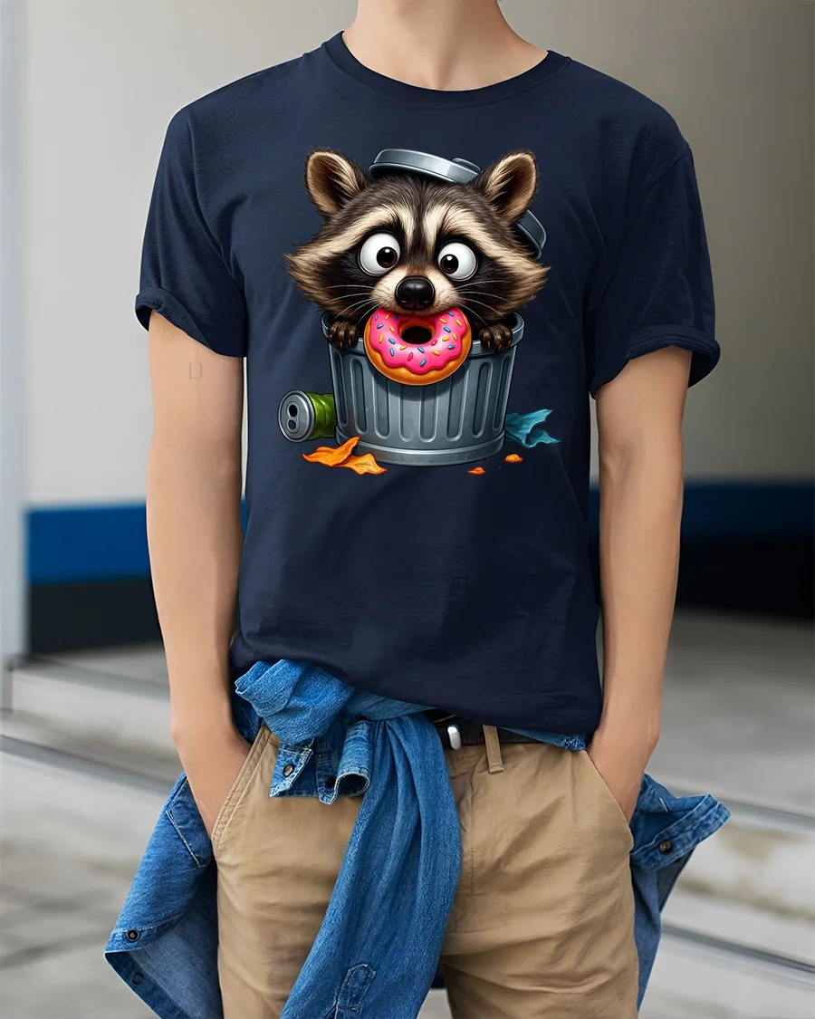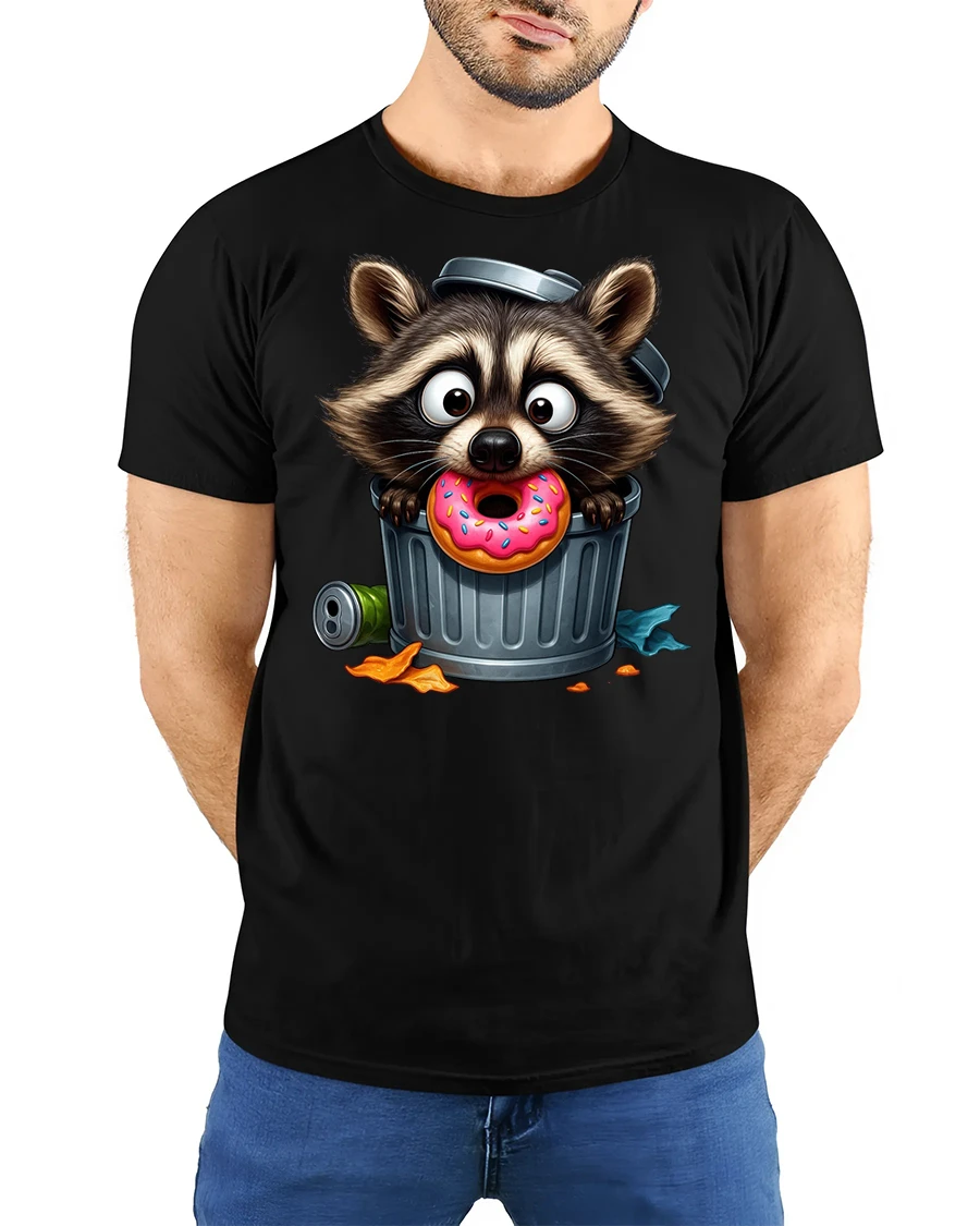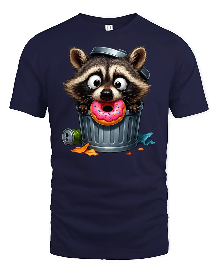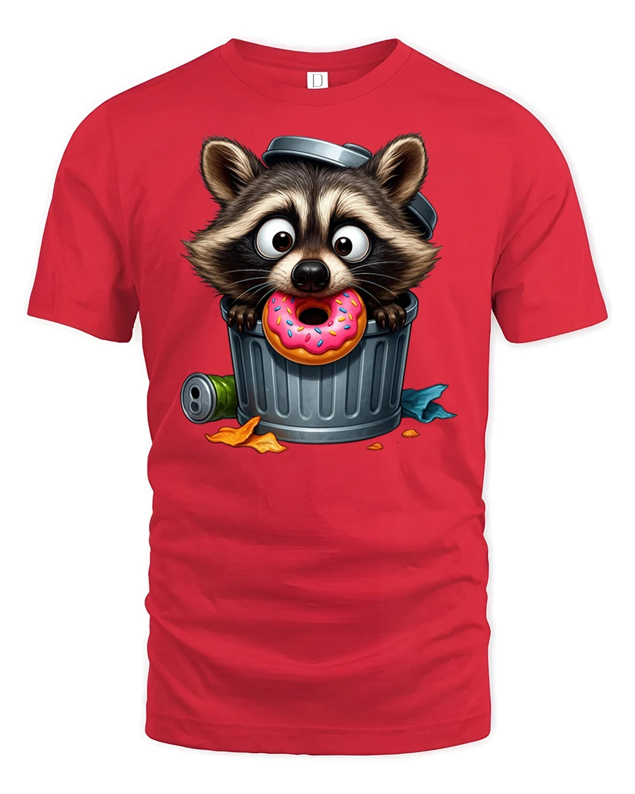 Featuring a mischievous raccoon peeking out of a trash can with a colorful donut in its mouth, this tee captures the playful spirit of everyone’s favorite “trash panda.”