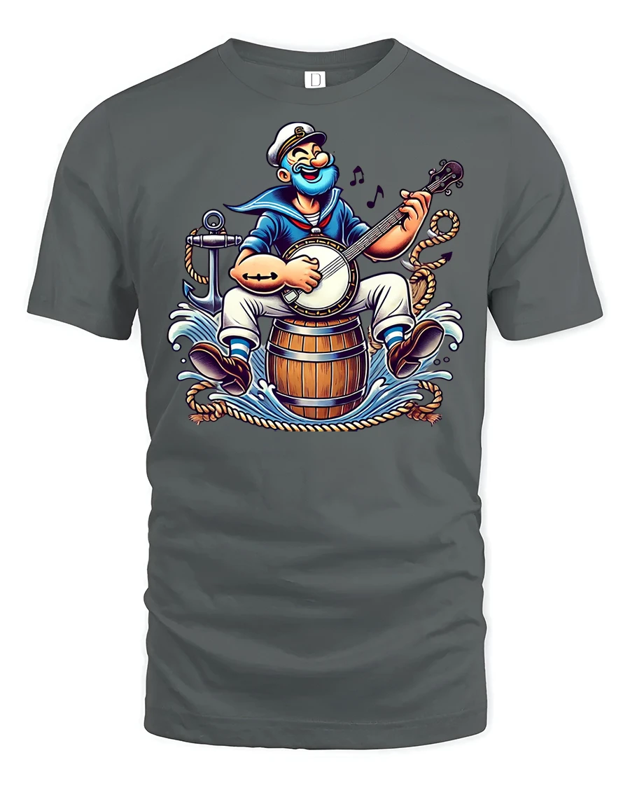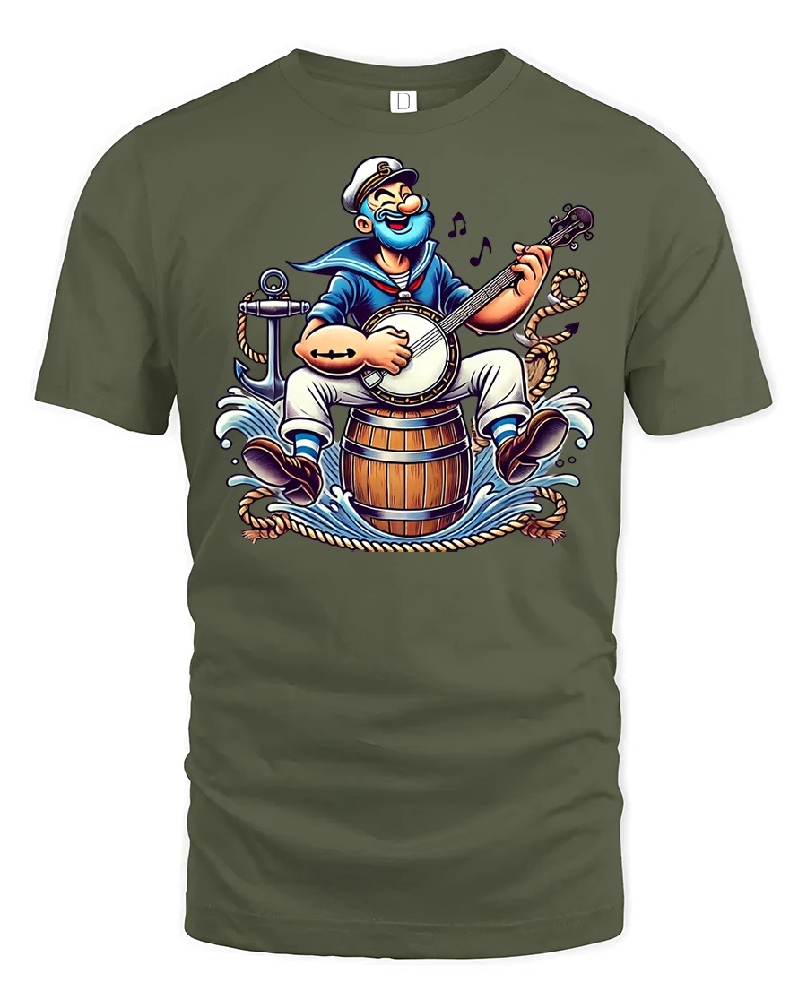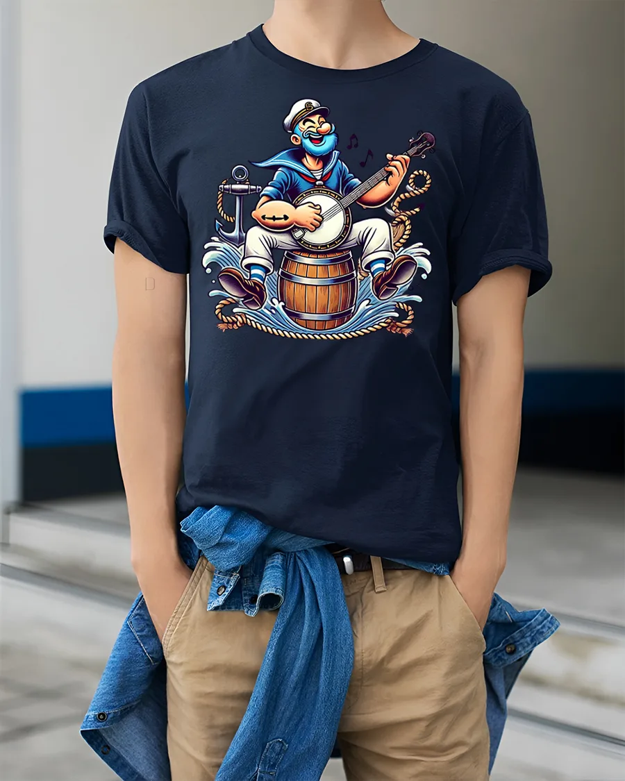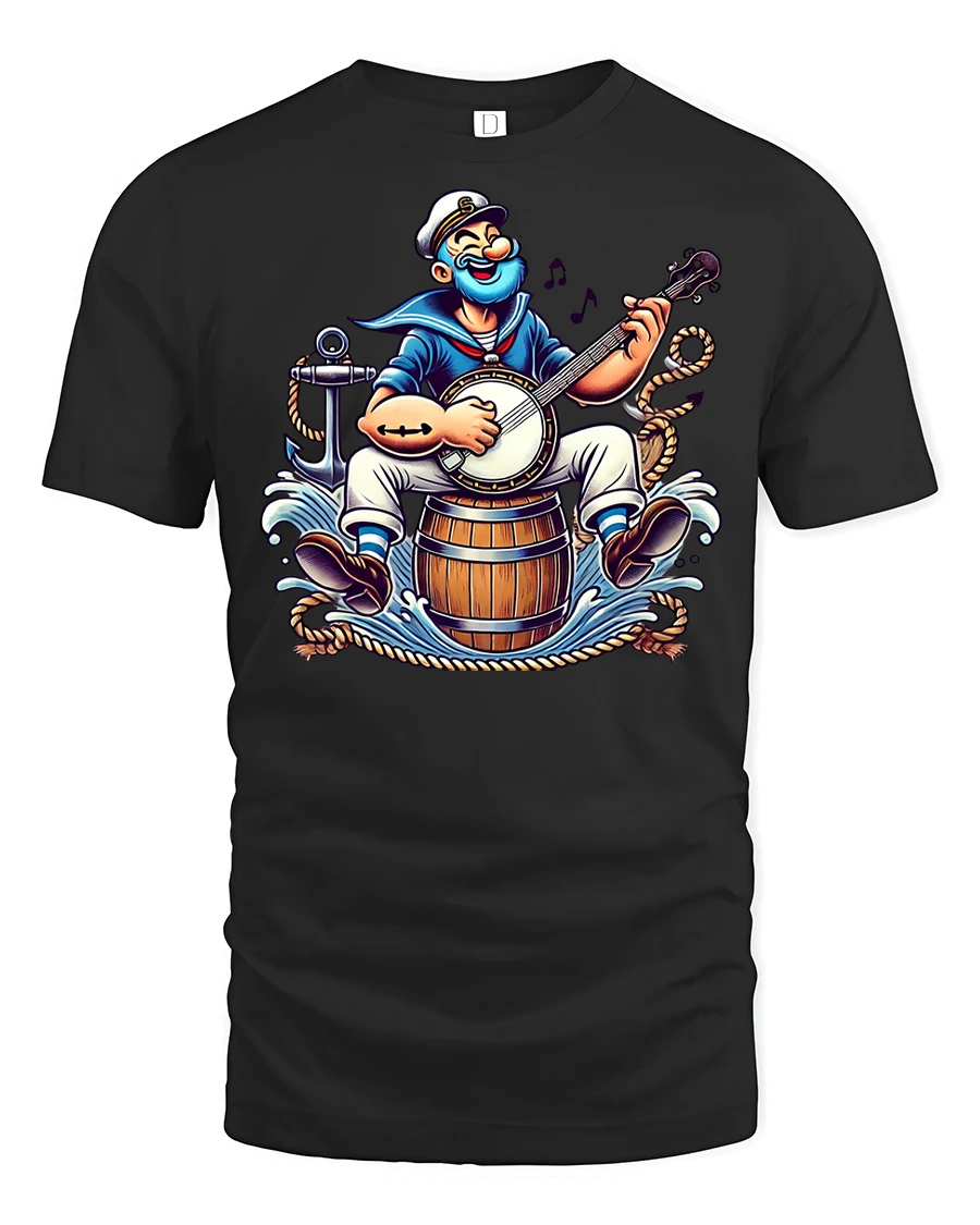 Bring humor and nautical vibes to your wardrobe with the Funny Sailor Playing Banjo Cartoon Graphic T-Shirt. Featuring a lively cartoon sailor strumming a banjo while perched on a barrel at sea, this design is full of charm, energy, and a playful retro feel that stands out anywhere you go.