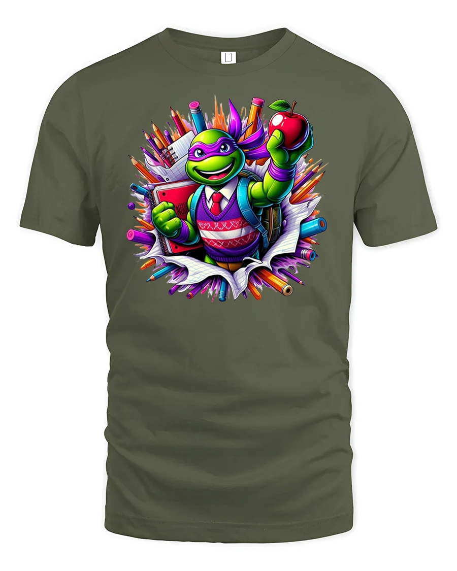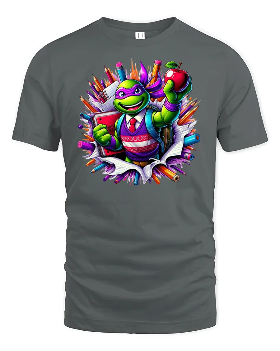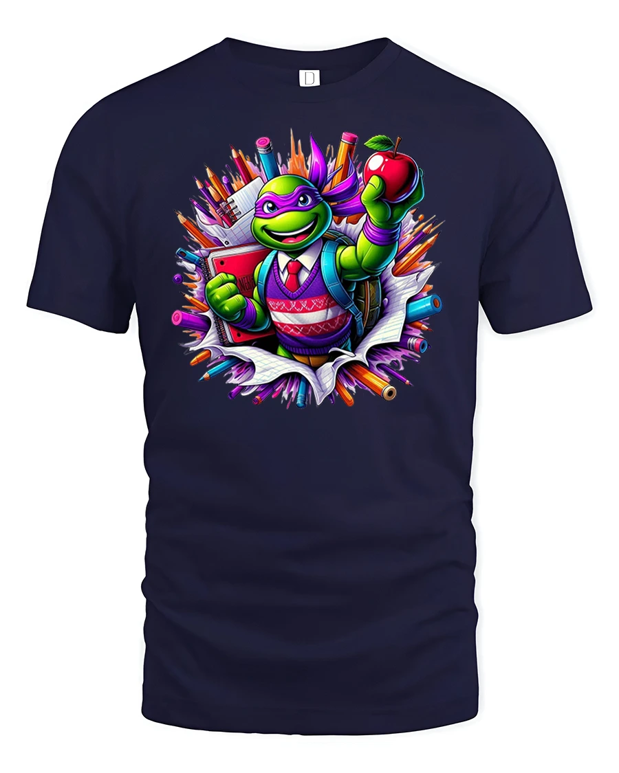 Featuring a cheerful turtle dressed like a student, surrounded by pencils, notebooks, and a bright red apple, this tee celebrates learning with a playful twist.