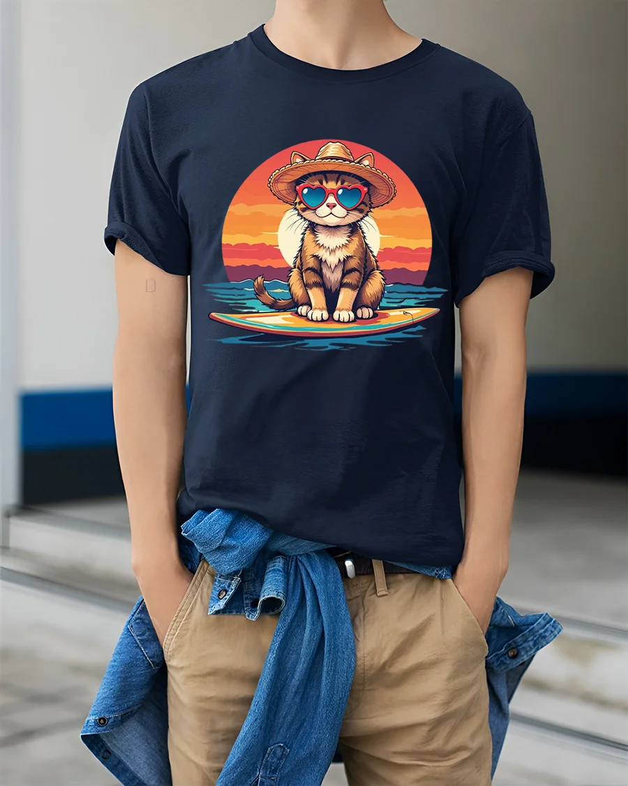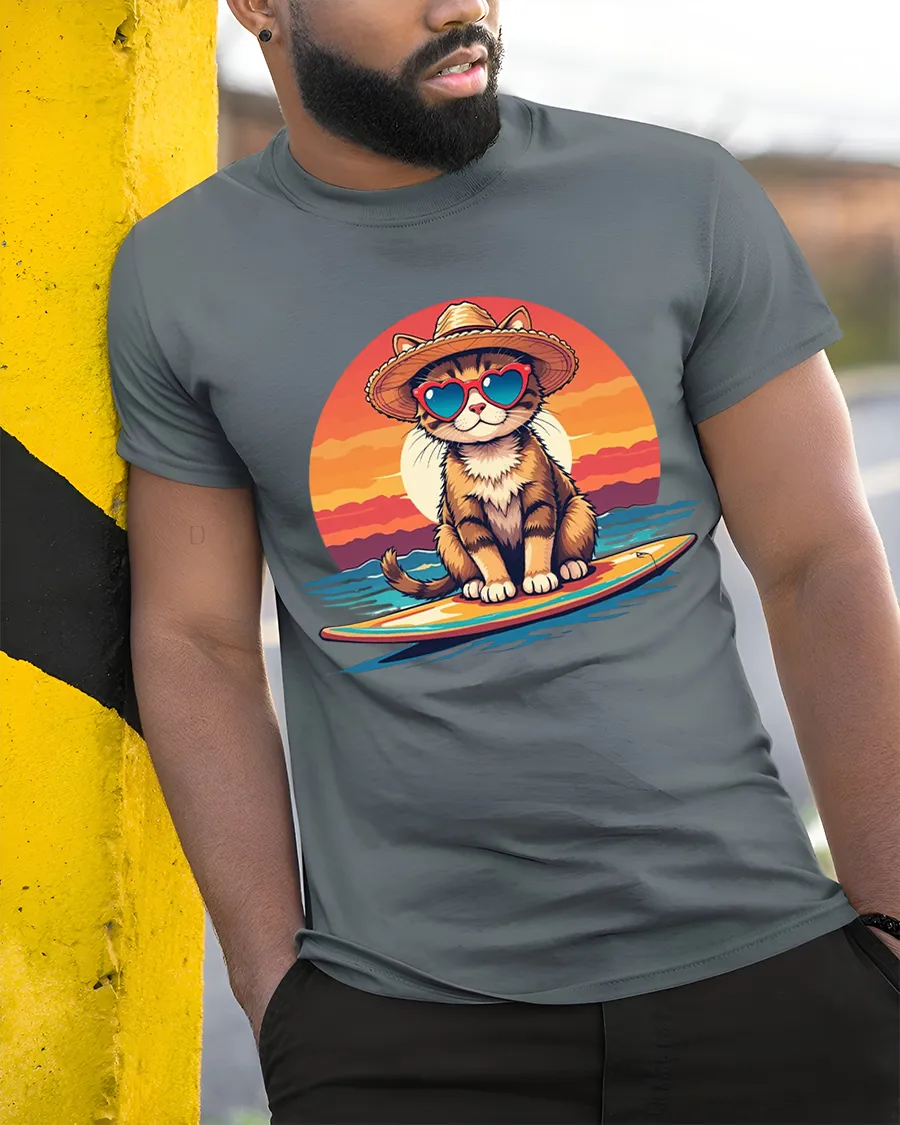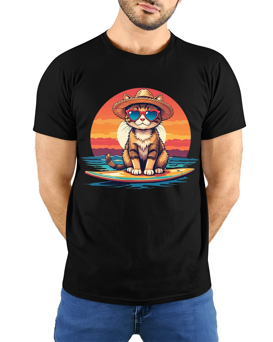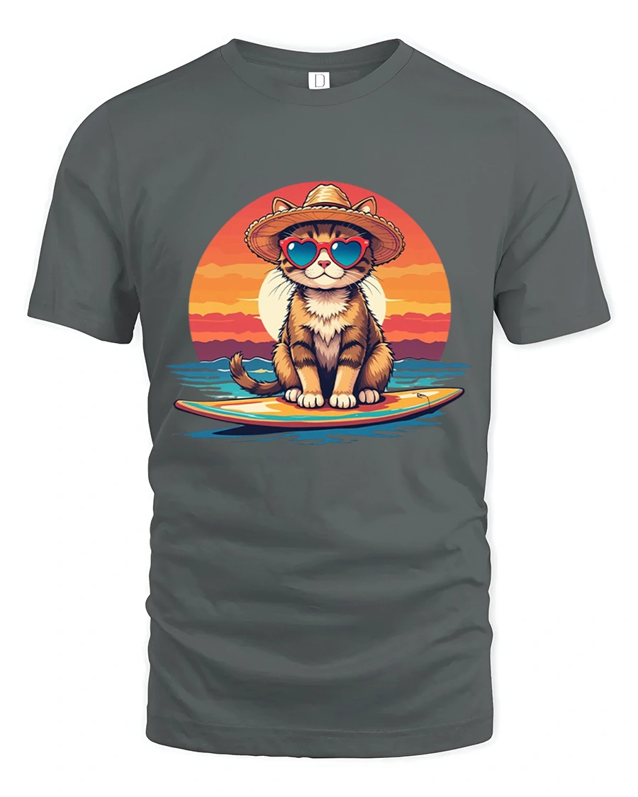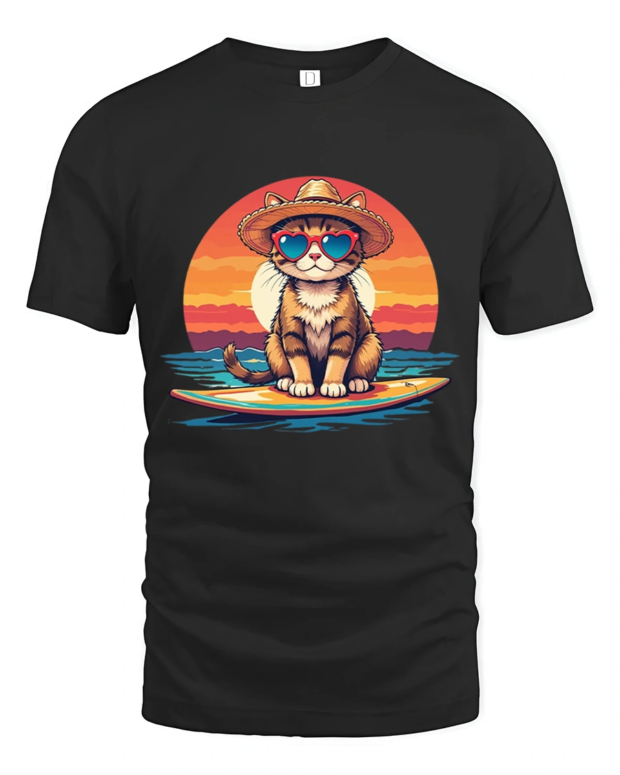 Funny Surfing Cat Sunset Vibes Cartoon Art Graphic Tshirt brings relaxed beach energy and playful charm into everyday wear.