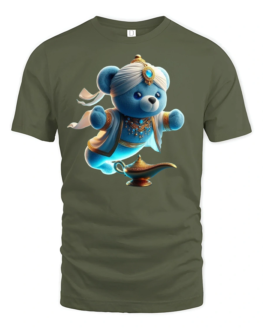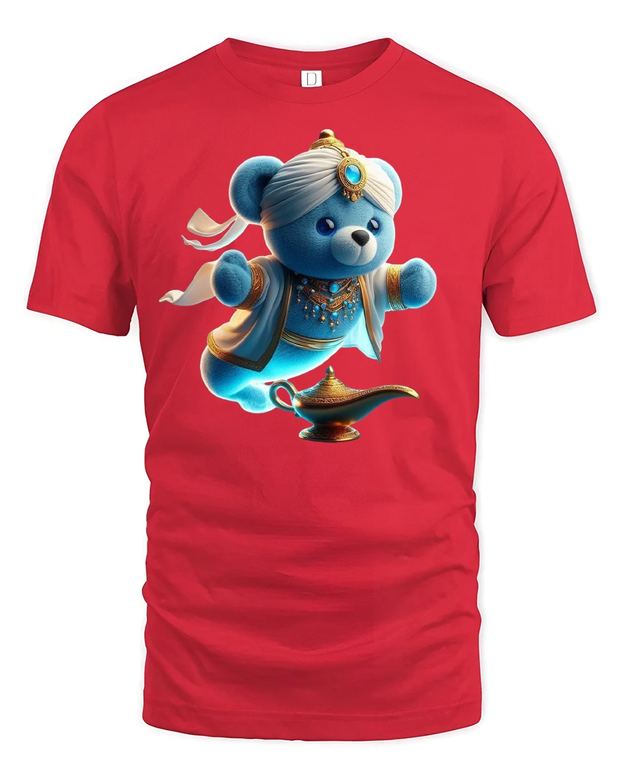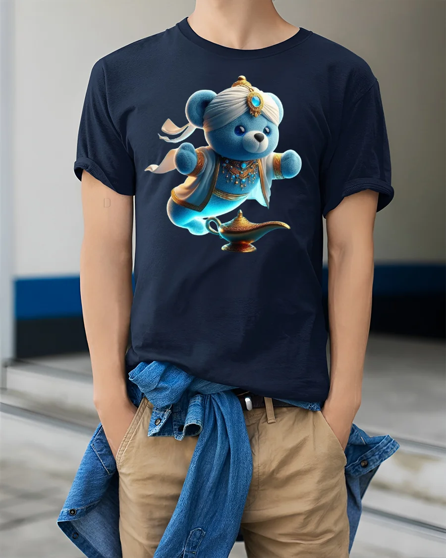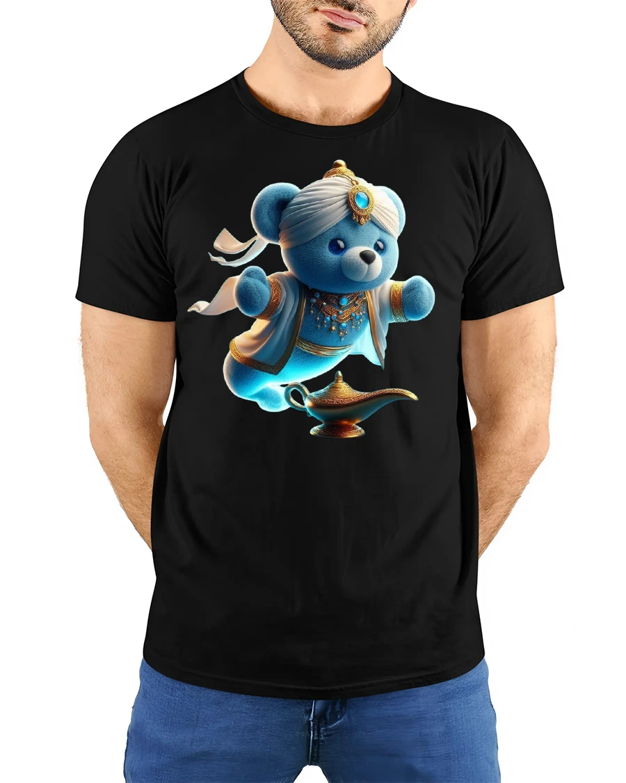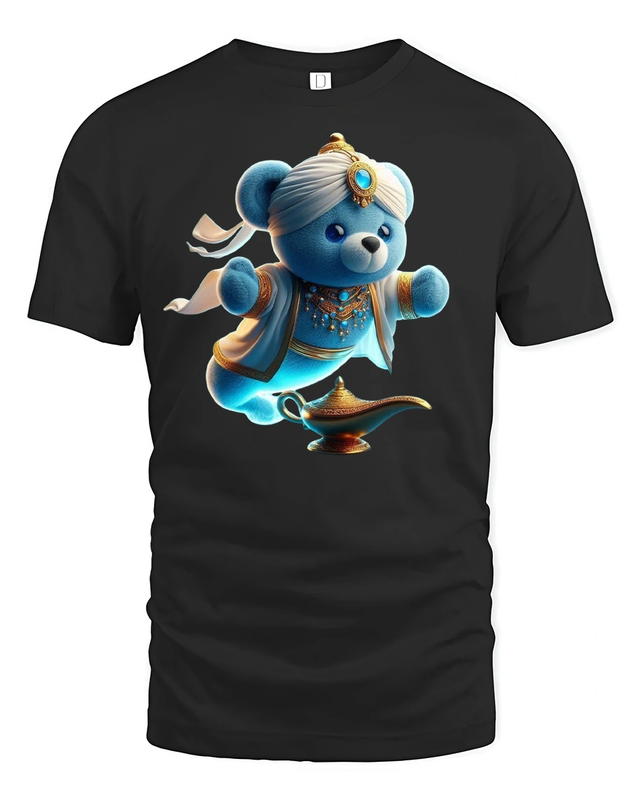 Featuring a blue teddy bear dressed as a genie emerging from a golden lamp, this design blends magic, humor, and cuteness in one vibrant print.