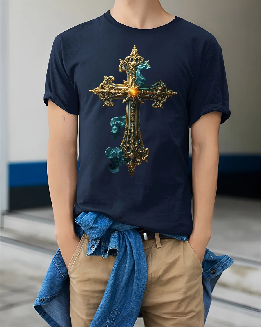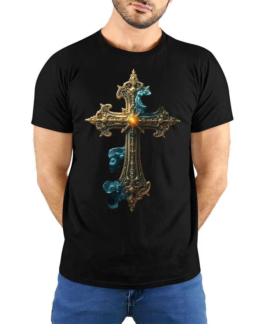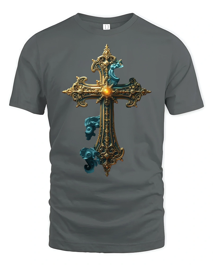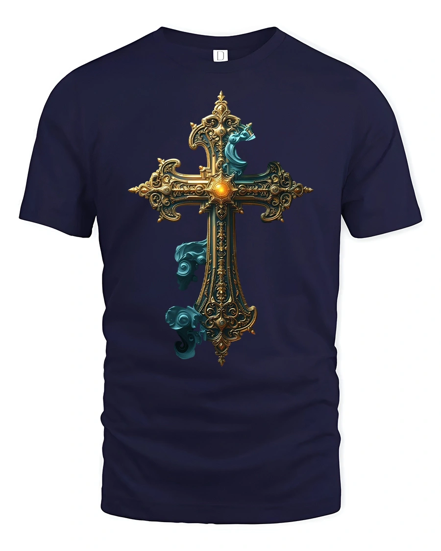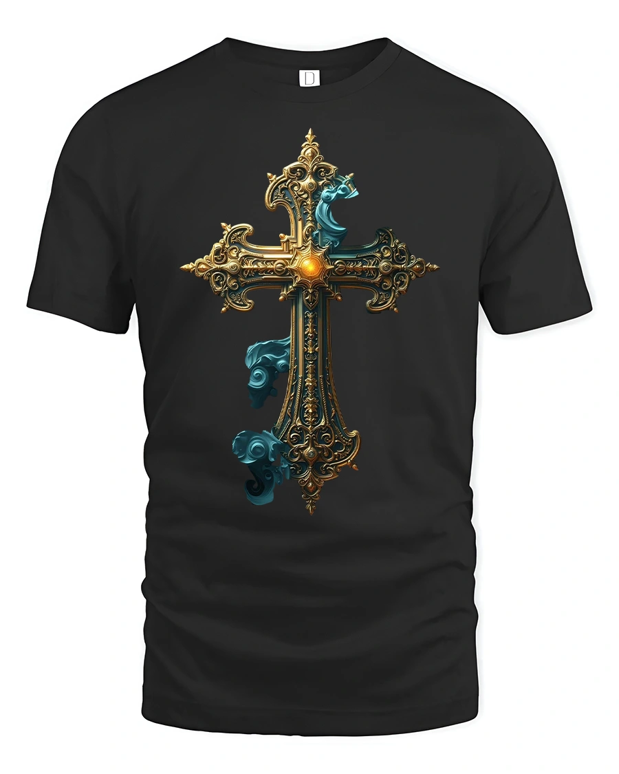 The high-quality print captures the glow and texture of the ornate cross, keeping it vibrant wash after wash.