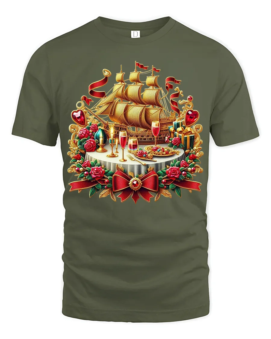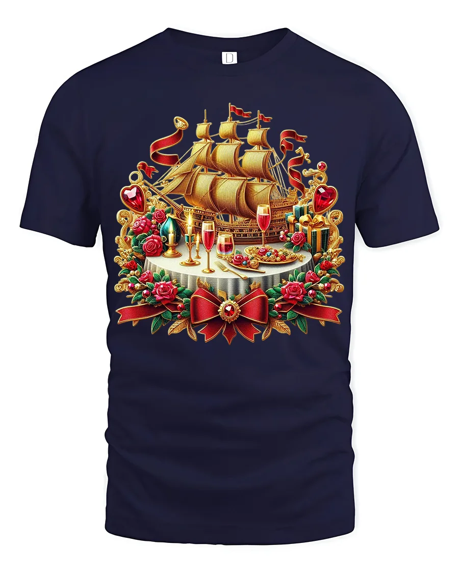 This Golden Sailing Ship Celebration Tee Festive Nautical Tshirt blends luxury, elegance and maritime charm into one stunning design. Featuring a beautifully detailed golden ship surrounded by roses, candles, sparkling drinks and ornate holiday accents, this artwork creates a dramatic and festive scene. The rich gold tones, polished textures and bold decorative elements make this tee perfect for anyone who appreciates nautical themes with a touch of celebration.