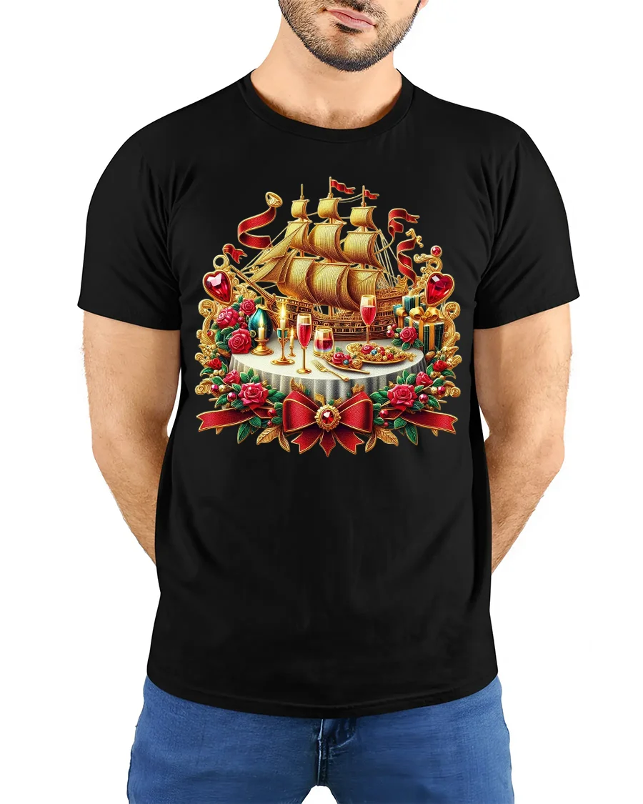 Add sophistication and nautical flair to your wardrobe with this golden ship celebration tshirt. From holiday dinners to casual outings to collector-style fashion, this tee brings beauty, warmth and standout artistic detail to every moment.
