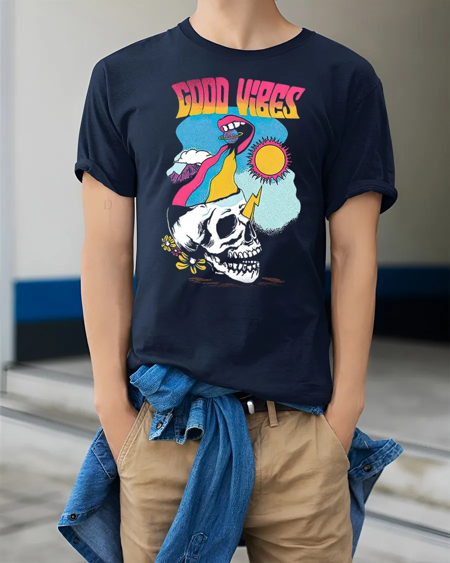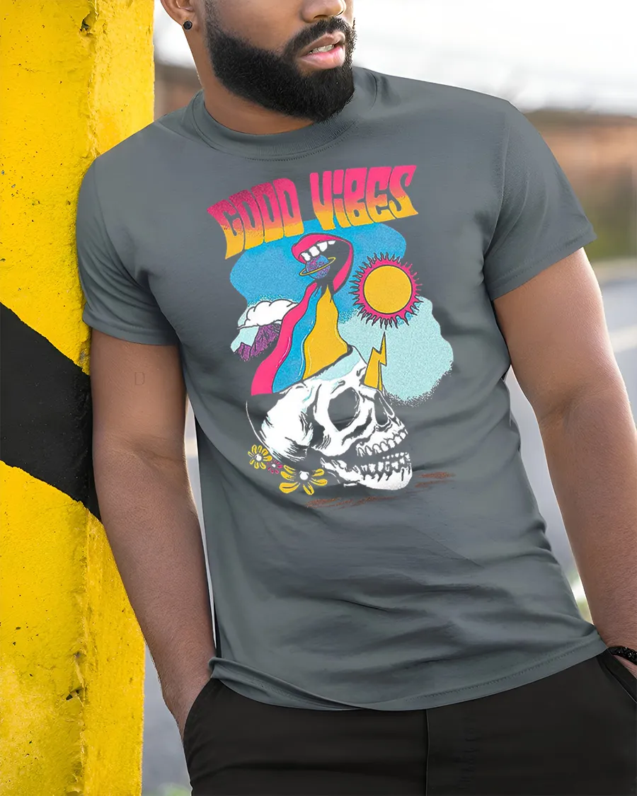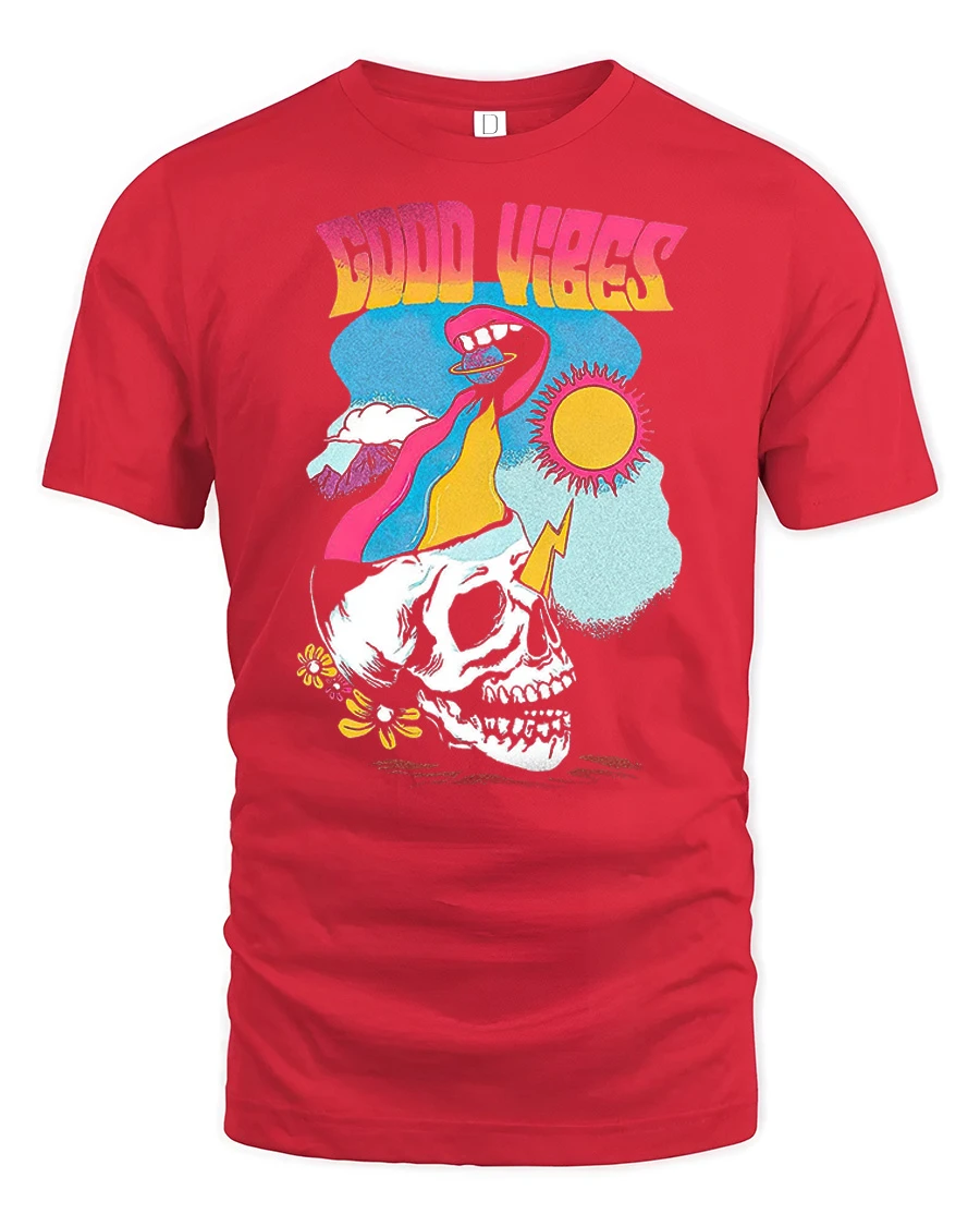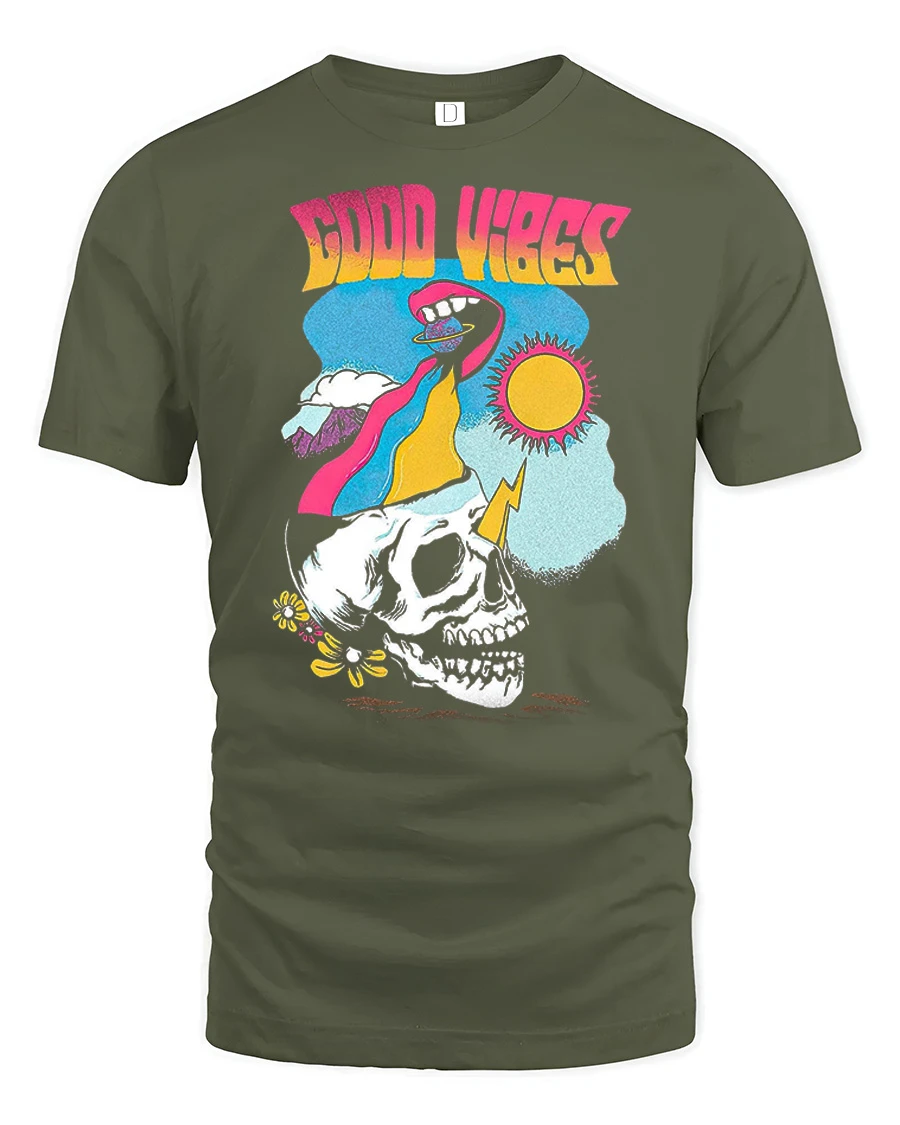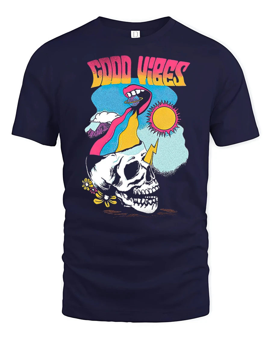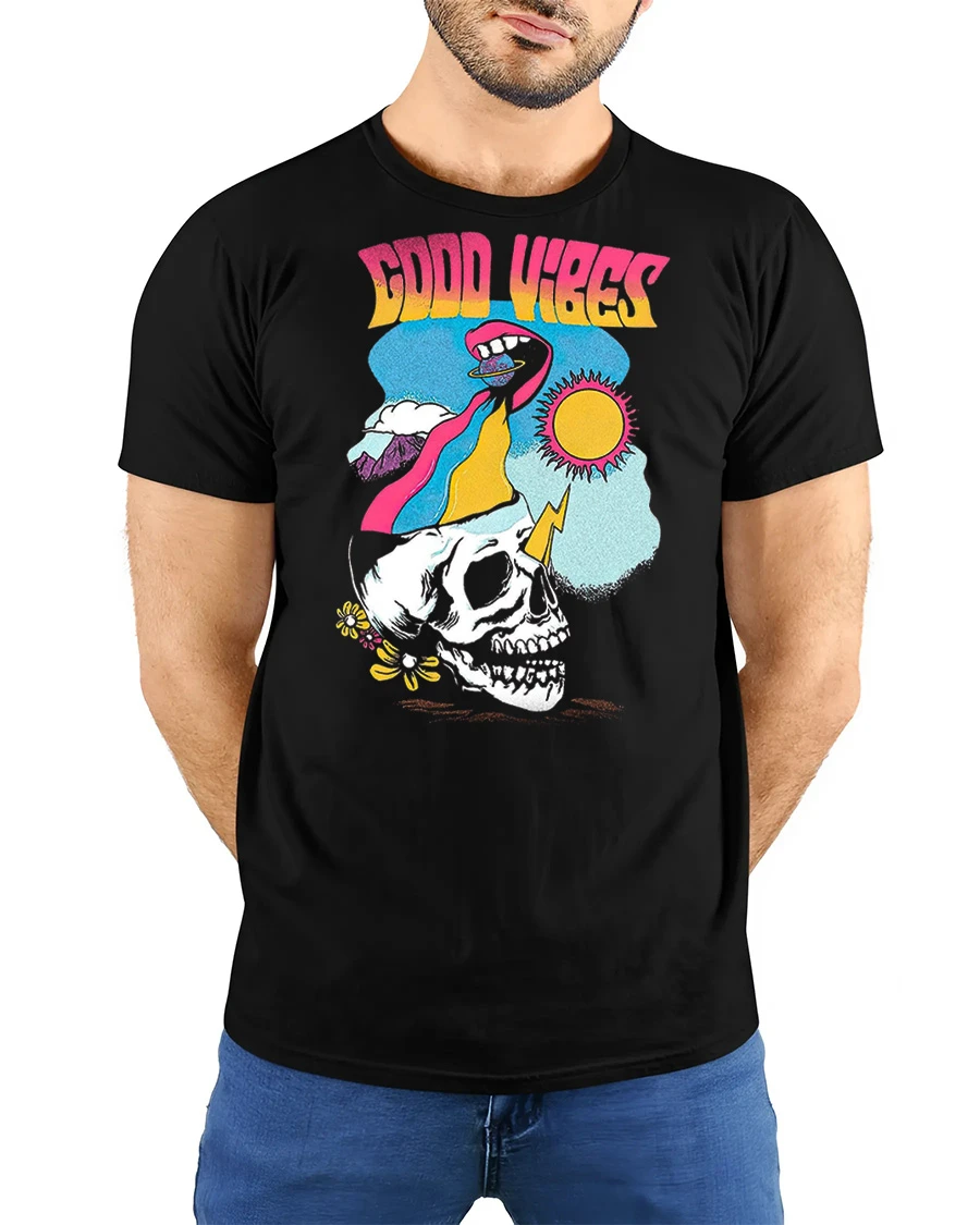 Good Vibes Skull Graphic T Shirt Retro Psychedelic Art Tee features a bold and creative design with a skull illustration combined with colorful psychedelic elements and a retro good vibes theme. The unique artwork blends vintage style with modern graphic design, creating a cool and artistic look that stands out in any casual outfit. This tshirt is perfect for anyone who loves retro art, skull graphics, and creative vintage inspired fashion.