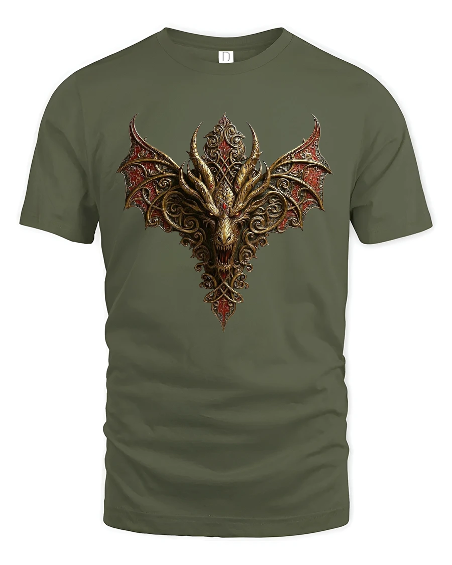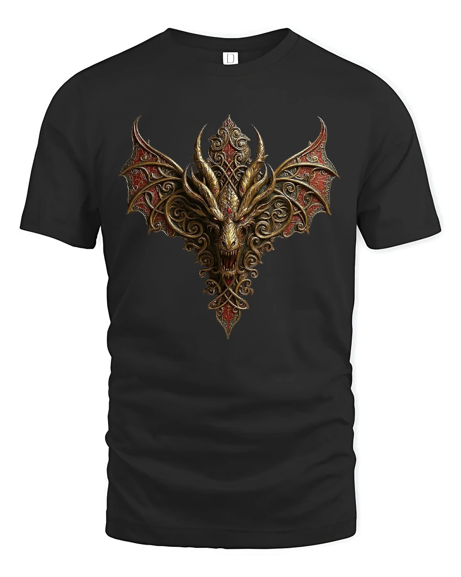Featuring a fierce golden dragon with intricate gothic patterns and blazing red wings, this shirt radiates strength and mystery.