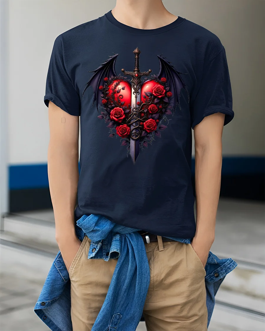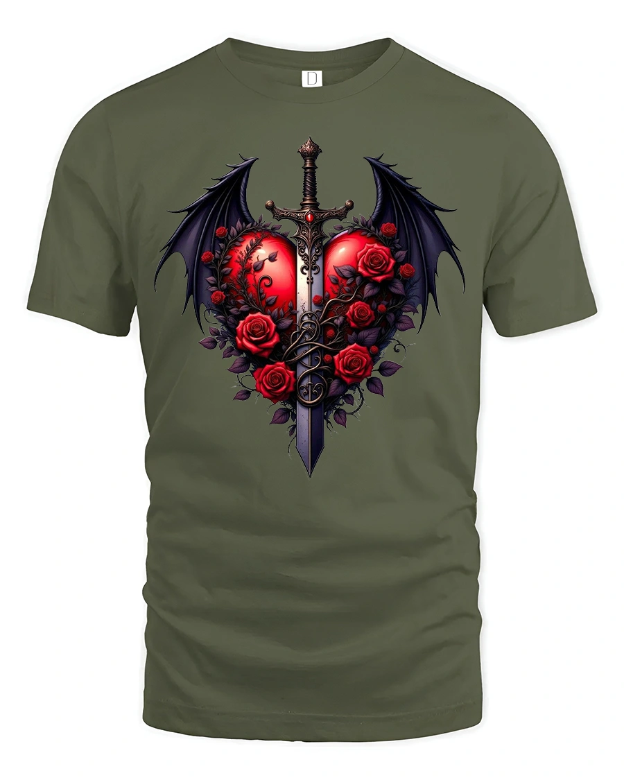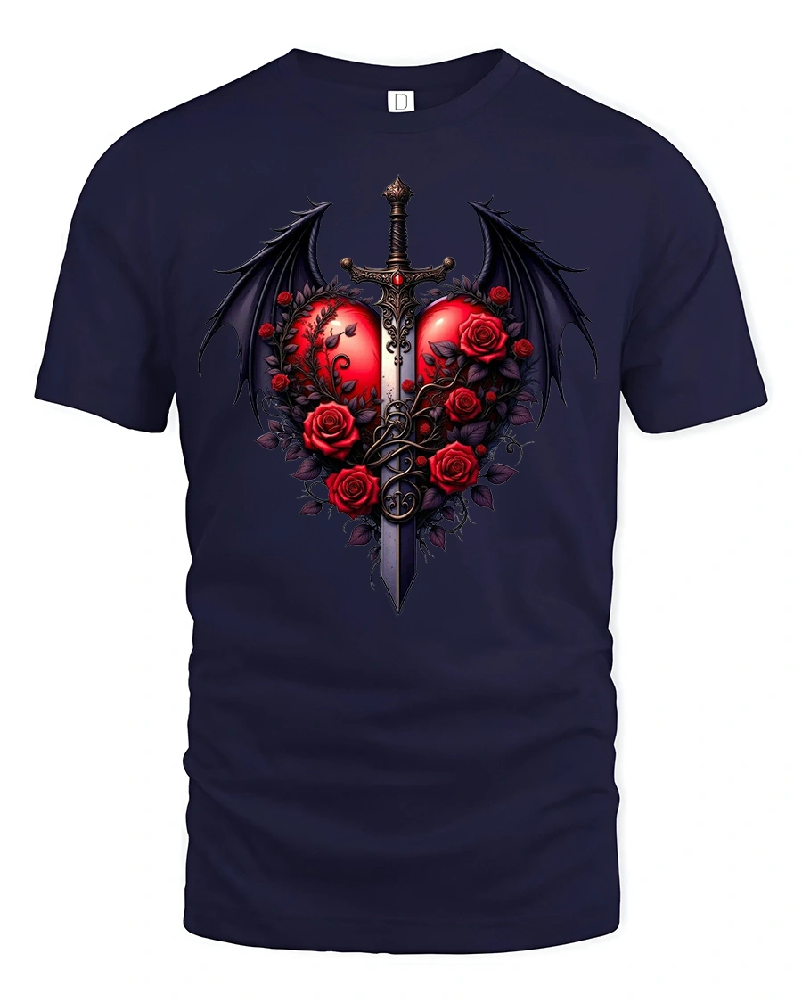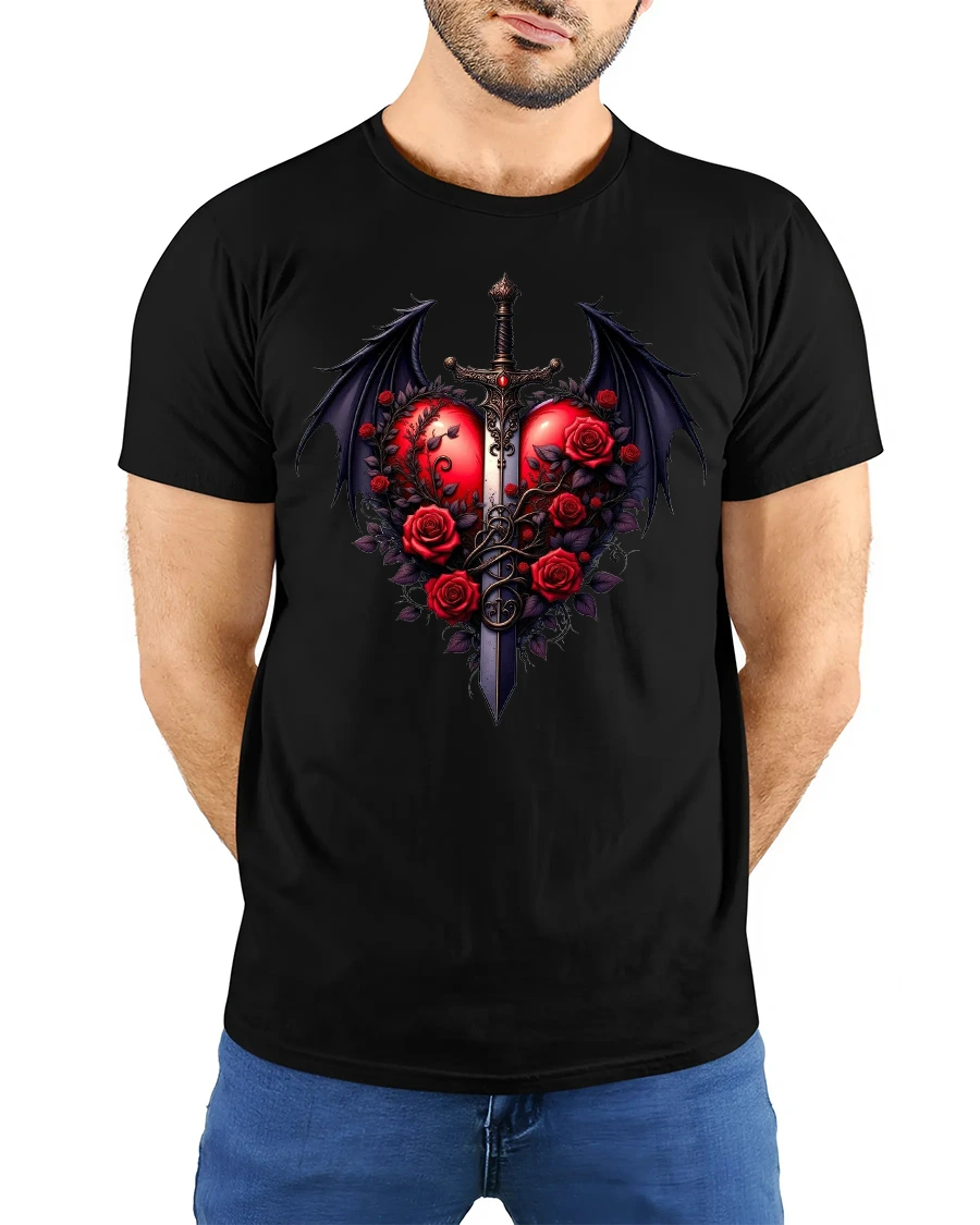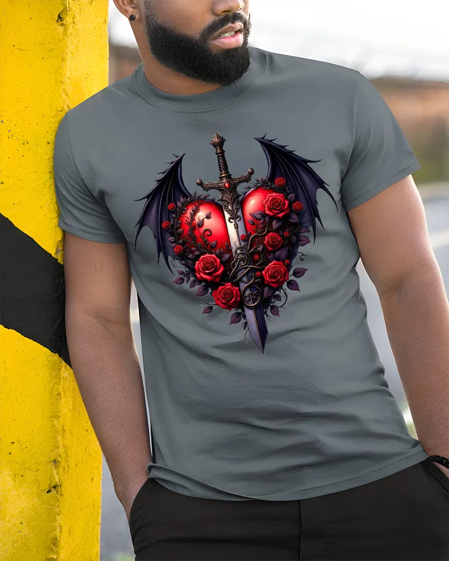 Featuring a vibrant red heart pierced by a sword and surrounded by blooming roses and dragon wings, this tee captures the essence of gothic romance and power.