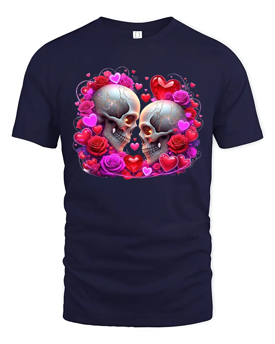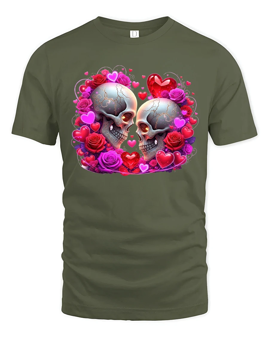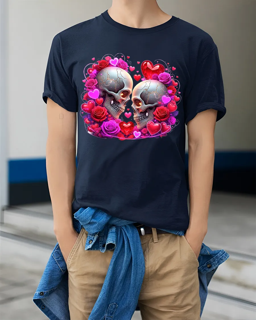 This Gothic Skull Love Graphic T Shirt showcases a striking romantic design featuring two skulls surrounded by glowing hearts and detailed roses.