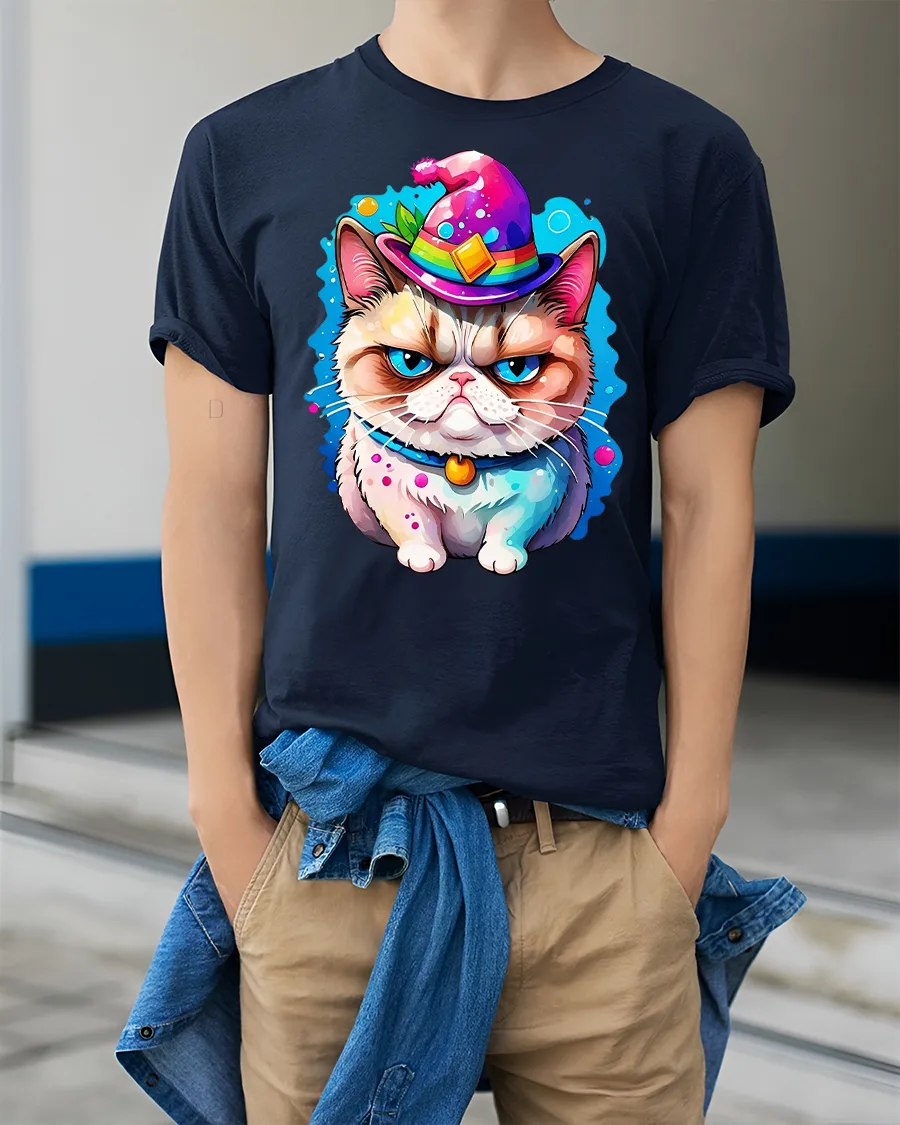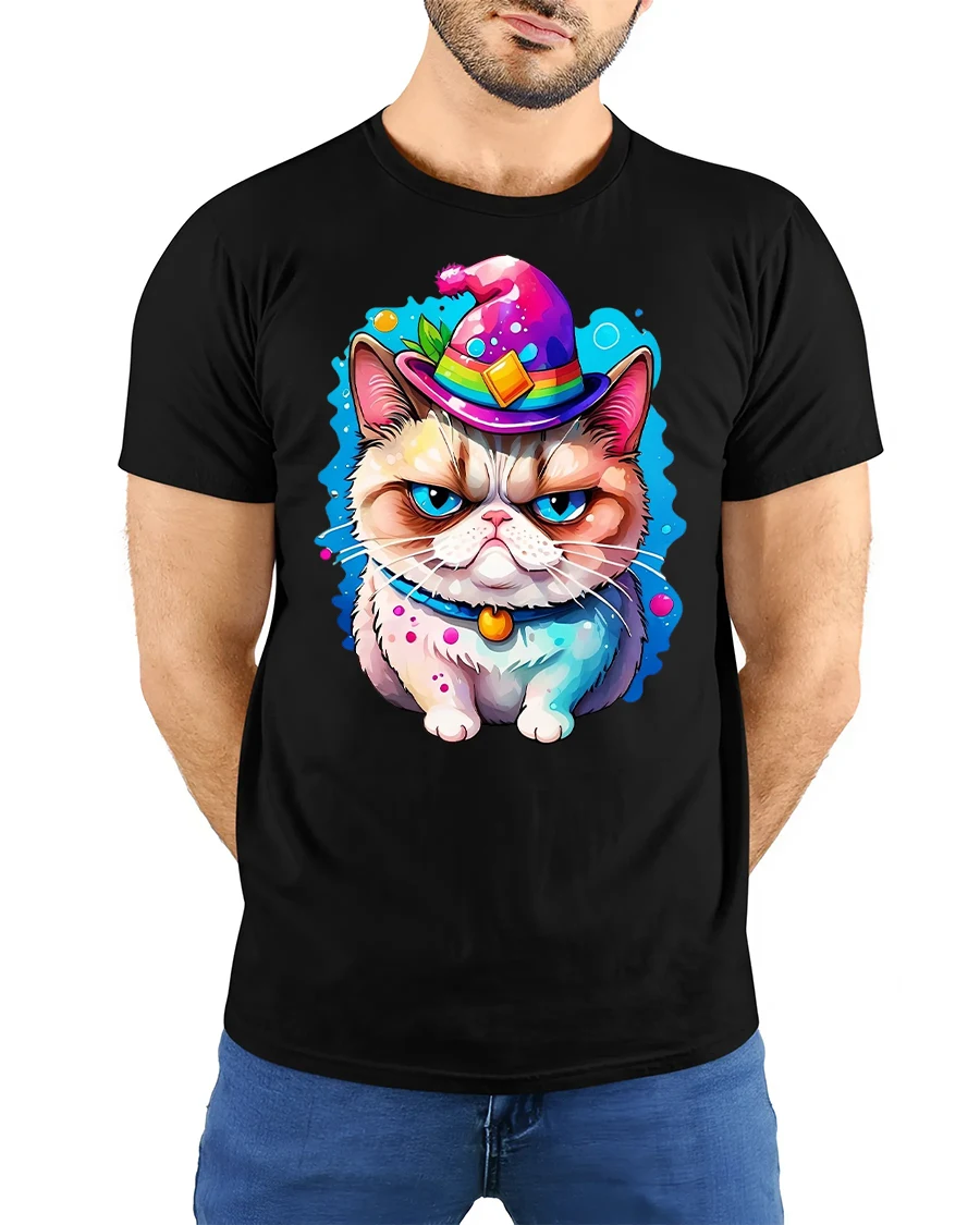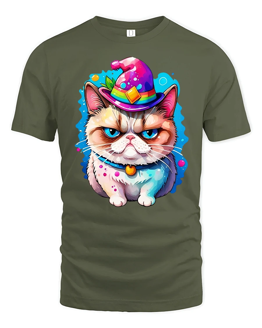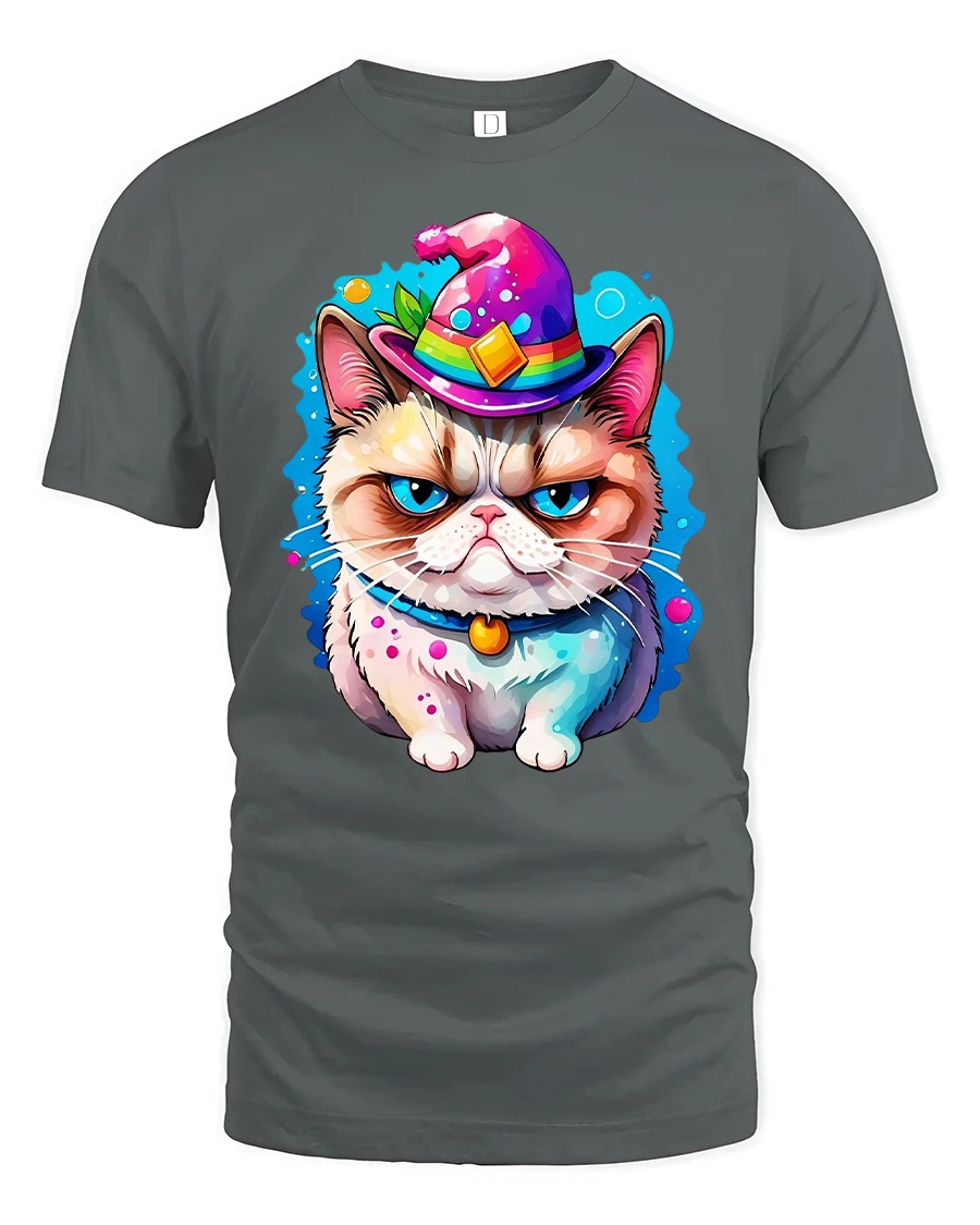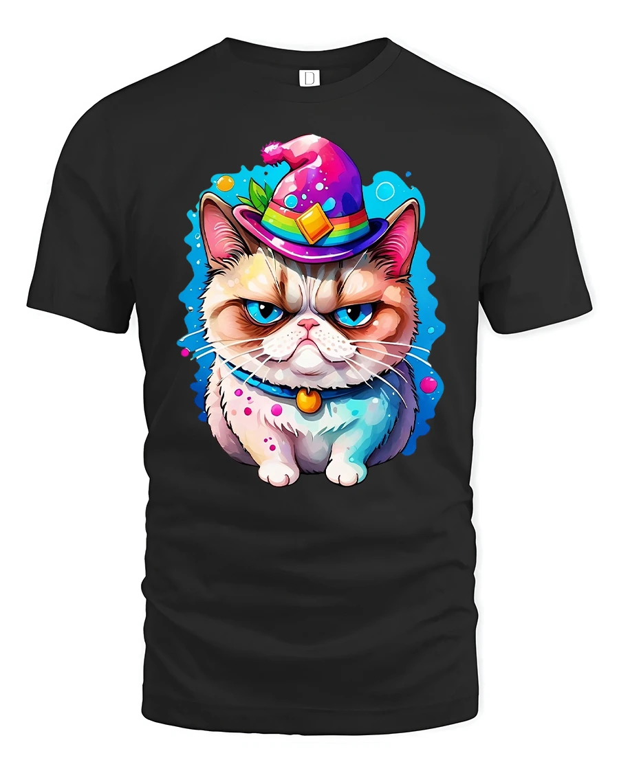 Grumpy Wizard Cat Colorful Graphic T-Shirt is the perfect blend of sass, magic, and vibrant style. This unique design features an adorably grumpy cat dressed in a bright, whimsical wizard hat, bringing a mix of humor and fantasy to your wardrobe. The bold colors and detailed artwork make it a true standout piece for any cat lover.