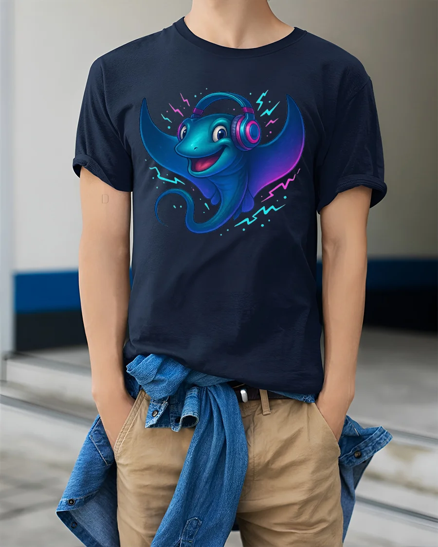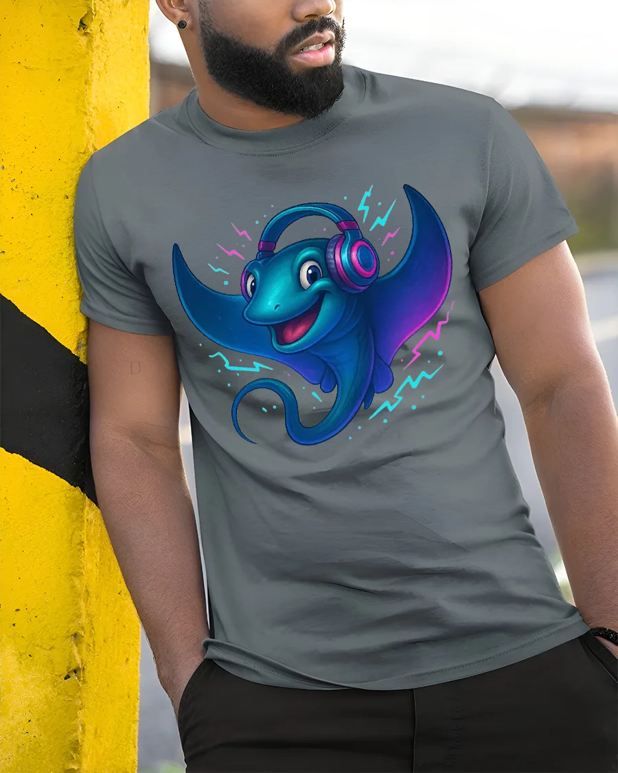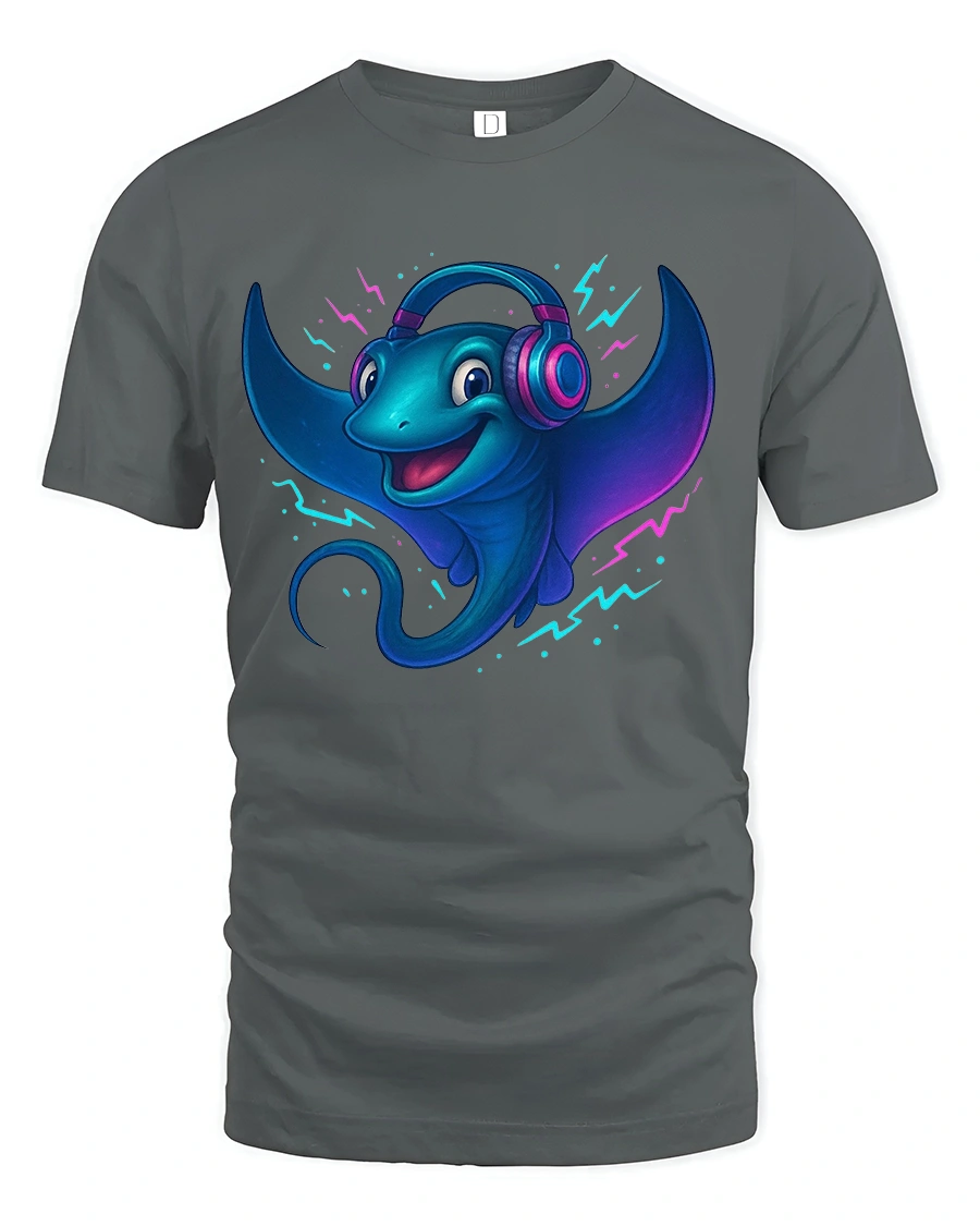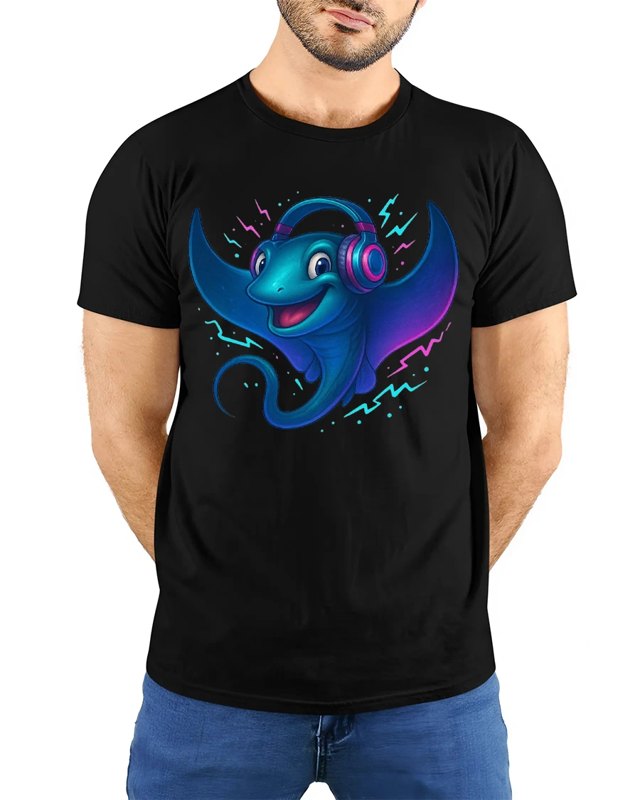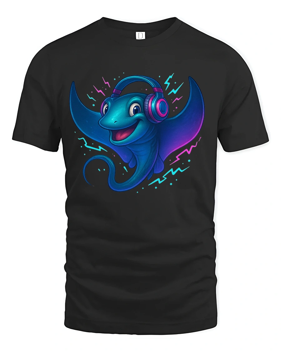 Featuring a cheerful stingray wearing colorful headphones surrounded by neon lightning bolts, this design bursts with life, rhythm, and positivity.