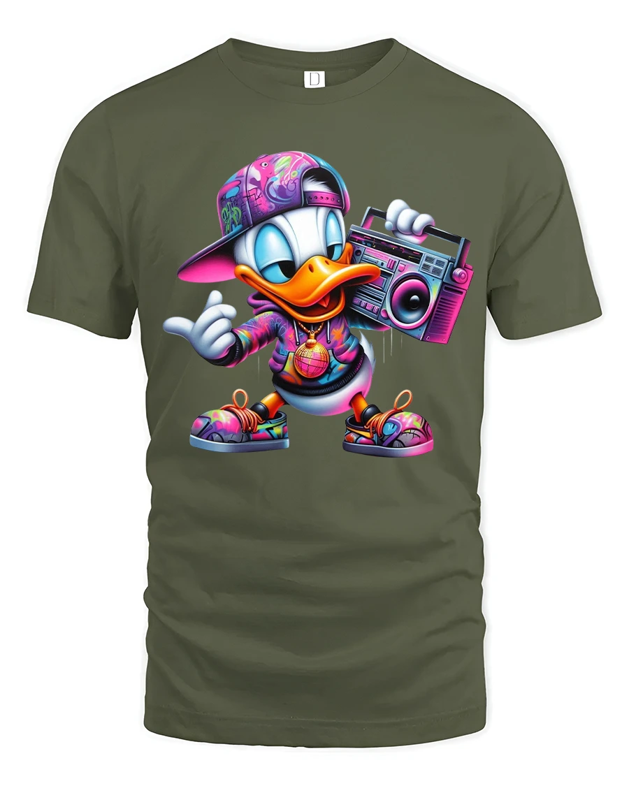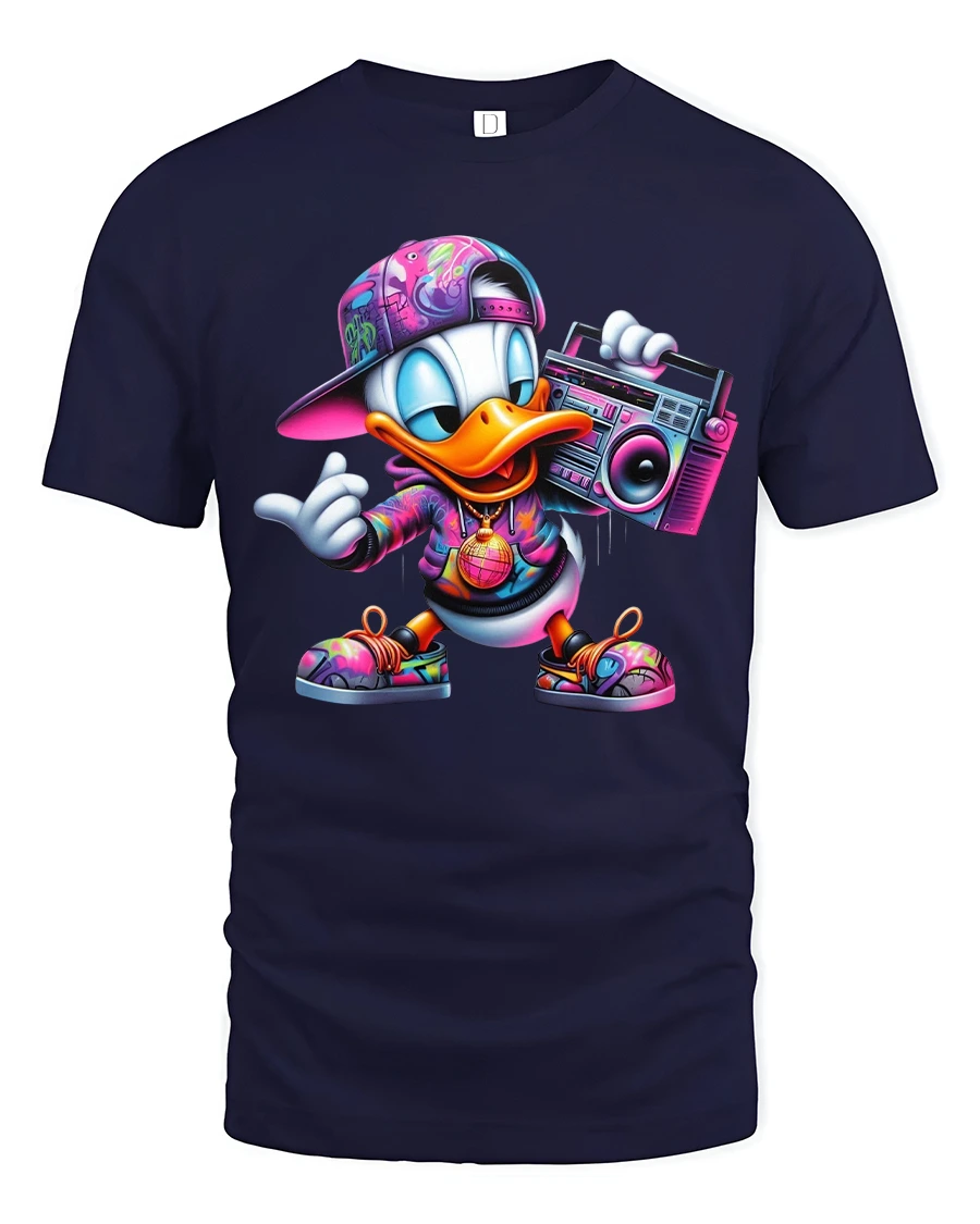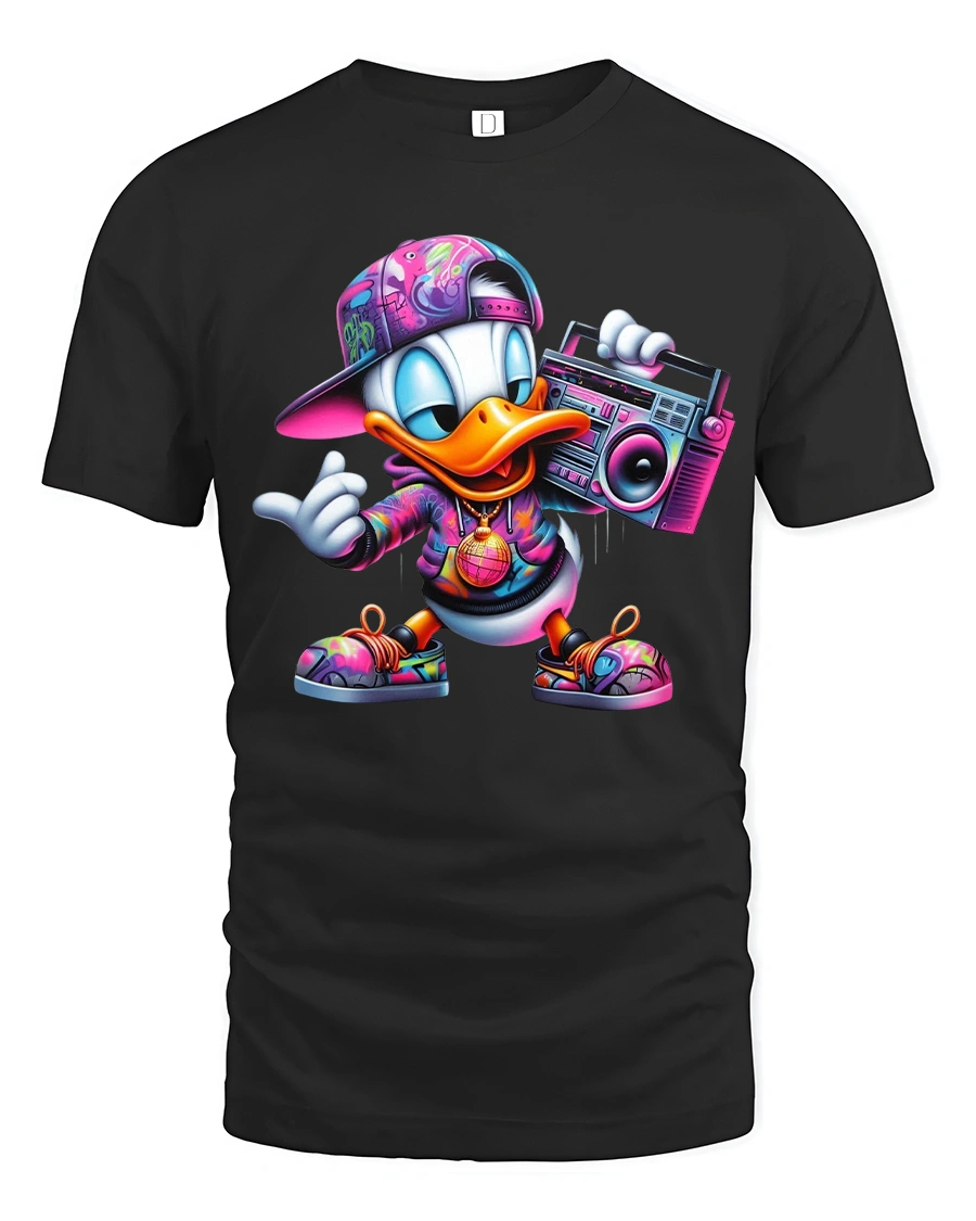 The Hip Hop Duck Boombox Graphic Tshirt brings bold street art energy into your everyday wardrobe.