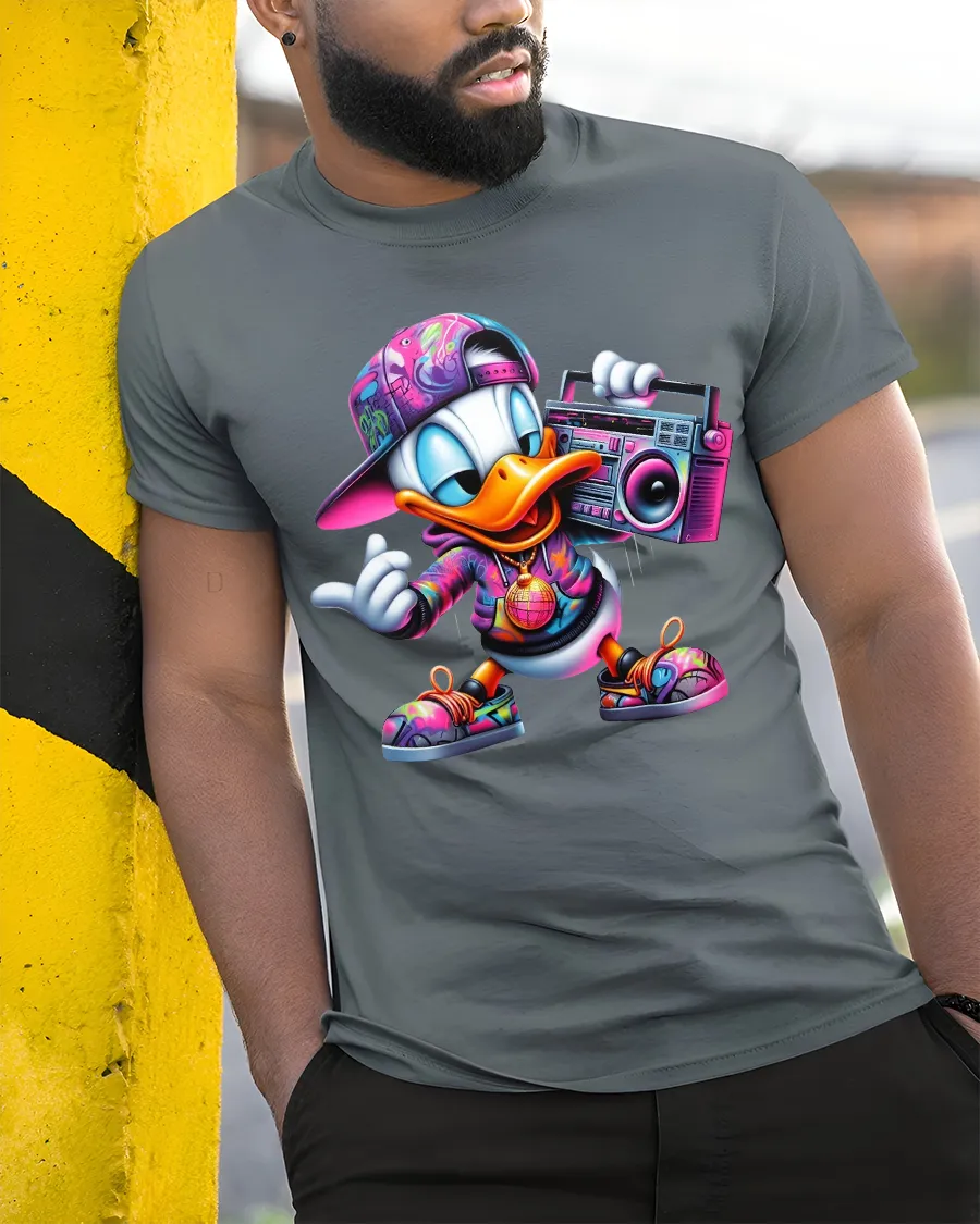 The Hip Hop Duck Boombox Graphic Tshirt pairs easily with jeans joggers or casual layers making it a versatile choice for daily wear.