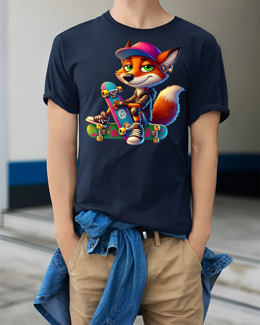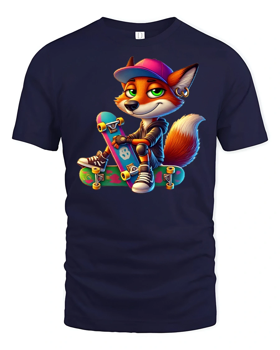Hipster Fox Skater Style T-shirt is the perfect blend of playful style and street culture. Featuring a confident fox in a cap, hoodie, and sneakers, casually perched with his skateboard, this design captures the energy of skate life with a bold, colorful vibe. The vibrant details and street-inspired art make it an instant eye-catcher for skater fans and animal lovers alike.